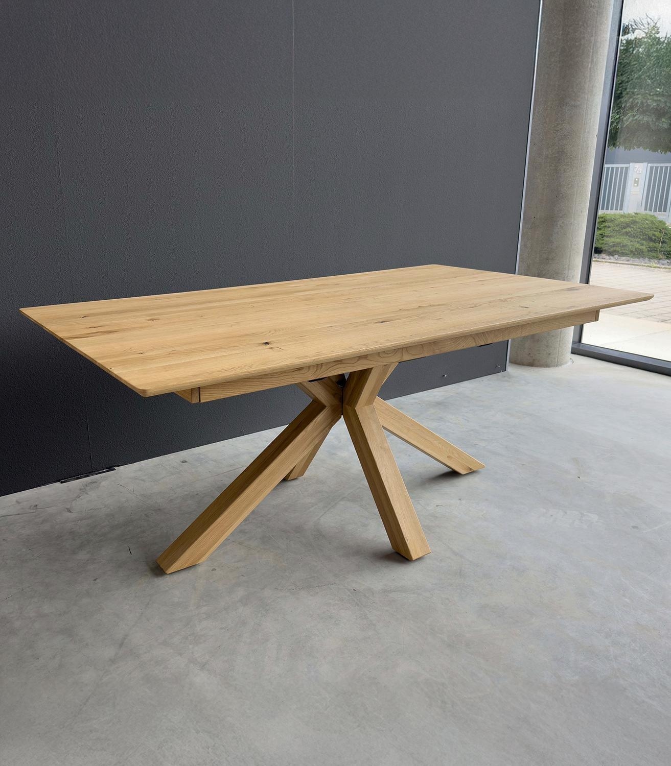 Der Esstisch VOLPAIA ist aus massivem Wildeichenholz gefertigt und zeichnet sich durch filigrane Tischkanten aus. Mit einer Breite von 200 cm, einer Höhe von 75 cm und einer Tiefe von 100 cm bietet der Diningtisch eine großzügige Fläche für den Essbereich. Bei Bedarf lässt sich der Ausziehtisch auf eine Breite von 285 cm erweitern und schafft so zusätzlichen Platz. Die Tischplatte ist bis maximal 50 kg belastbar, die Ausziehplatte bis maximal 20 kg. Dadurch eignet sich der Holztisch für den Einsatz im Esszimmer oder in offenen Wohnbereichen mit variablem Platzbedarf.