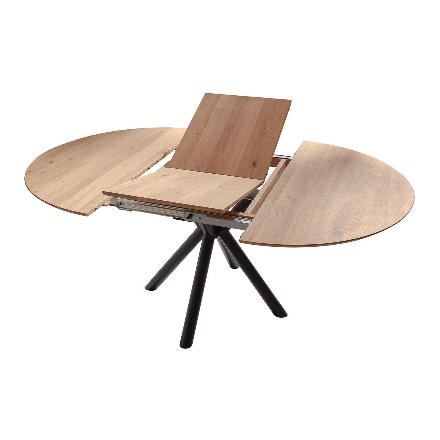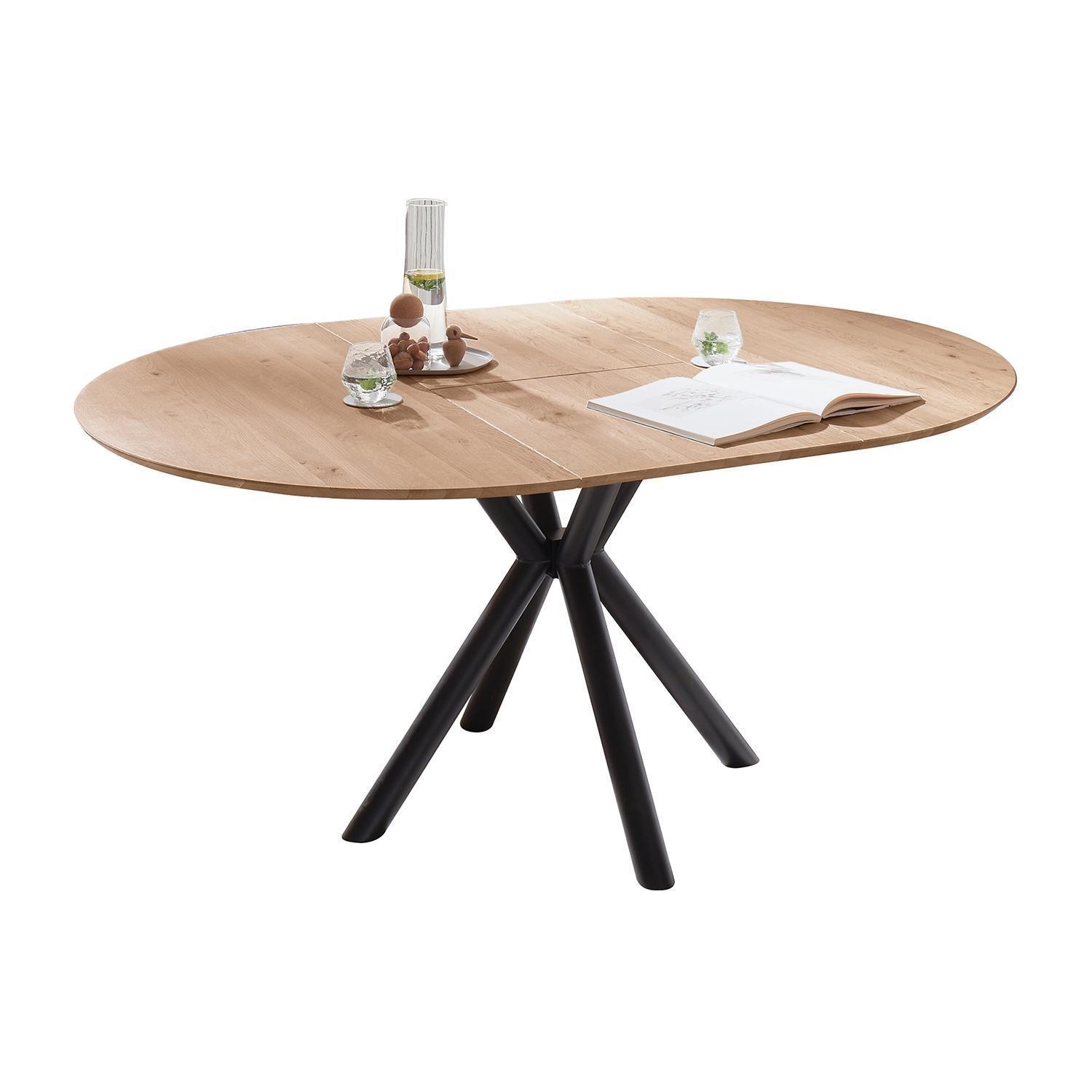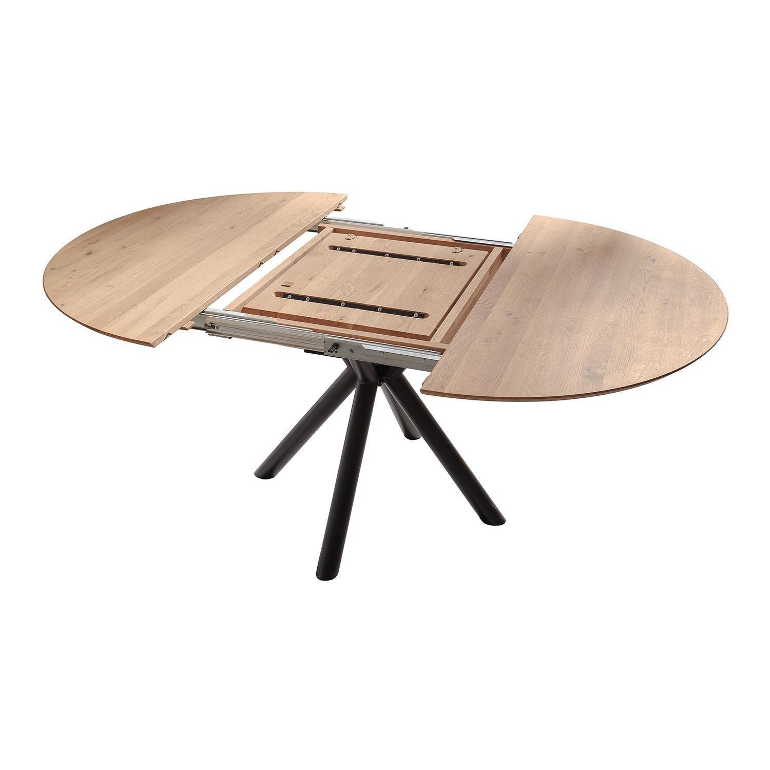 Der ausziehbare Esstisch XARA kombiniert eine Tischplatte aus massivem Wildeichenholz mit einem Gestell aus schwarzem Metall. Mit einem Durchmesser von 120 cm und einer Höhe von 75 cm eignet sich der Esszimmertisch für verschiedene Wohn- und Essbereiche. Bei Bedarf lässt sich der Ausziehtisch auf 170 cm erweitern und schafft so zusätzliche Fläche. Die Tischplatte ist bis maximal 50 kg belastbar, die Klappeinlage bis maximal 20 kg.