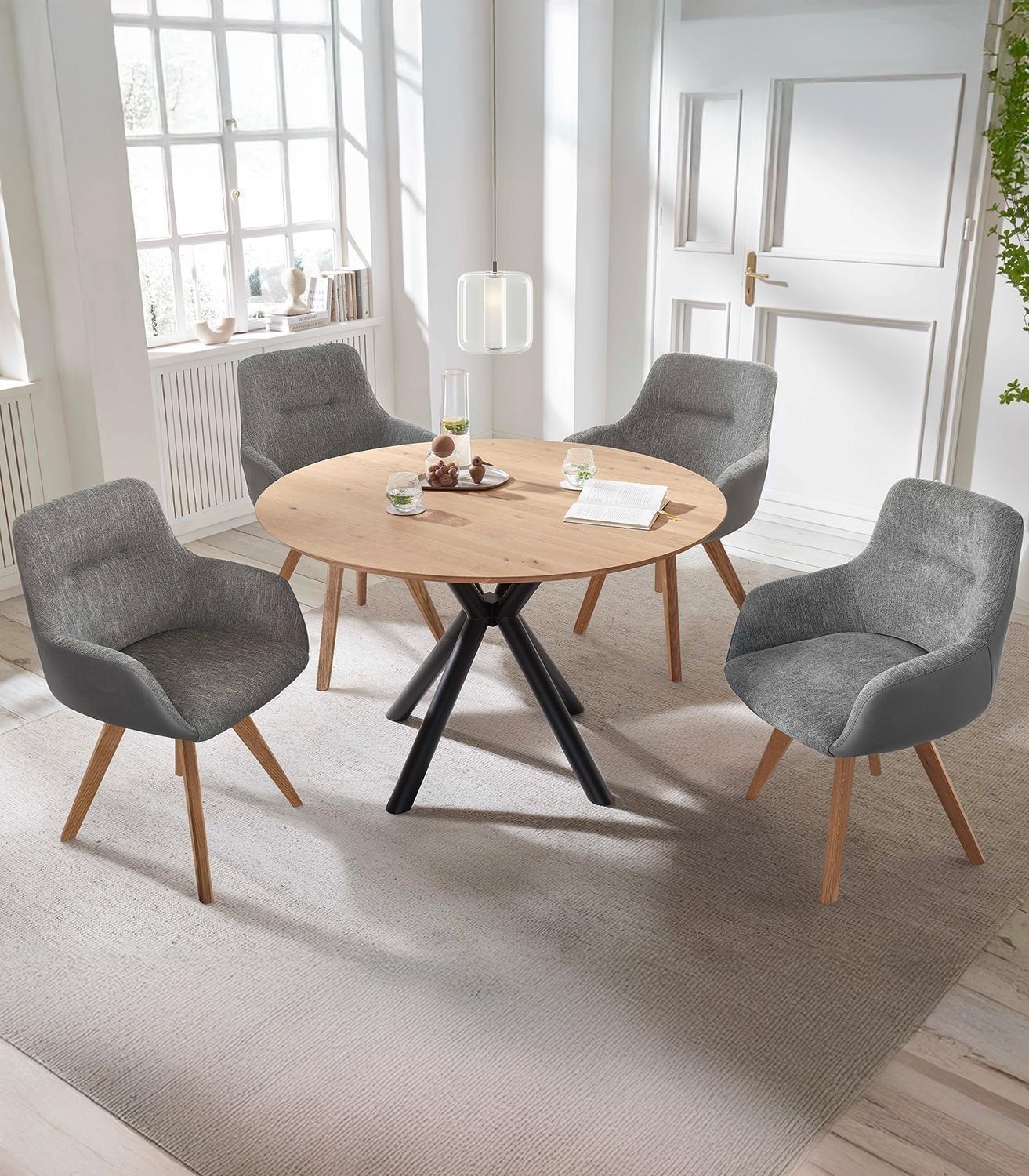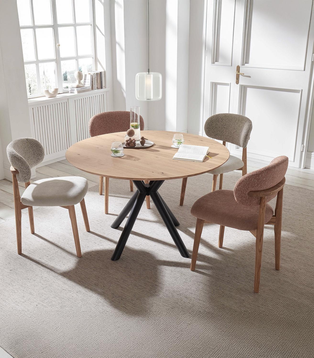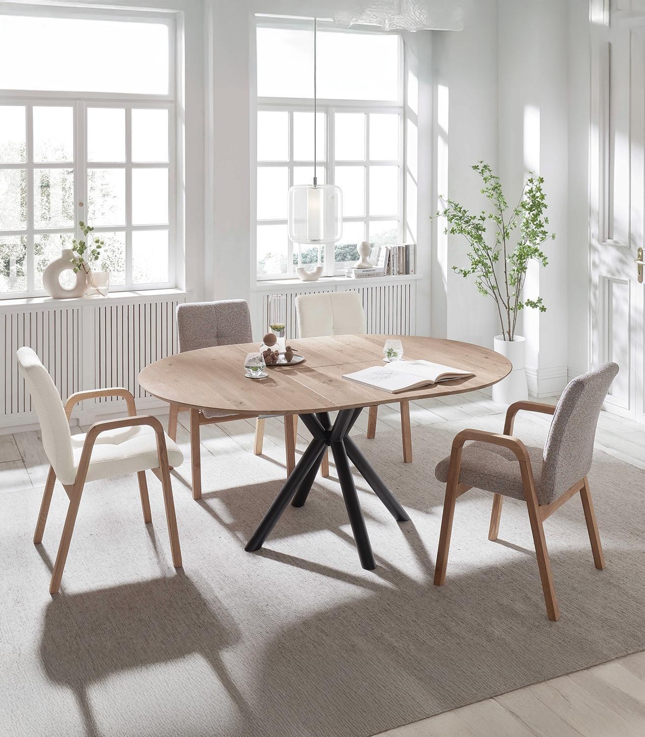 Der ausziehbare Esstisch XARA kombiniert eine Tischplatte aus massivem Wildeichenholz mit einem Gestell aus schwarzem Metall. Mit einem Durchmesser von 120 cm und einer Höhe von 75 cm eignet sich der Esszimmertisch für verschiedene Wohn- und Essbereiche. Bei Bedarf lässt sich der Ausziehtisch auf 170 cm erweitern und schafft so zusätzliche Fläche. Die Tischplatte ist bis maximal 50 kg belastbar, die Klappeinlage bis maximal 20 kg.