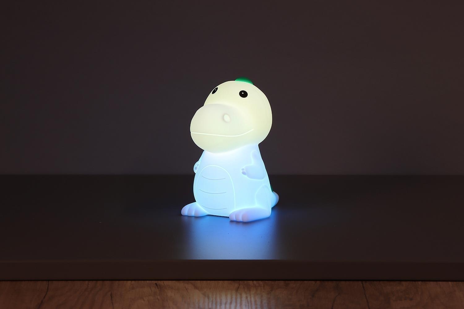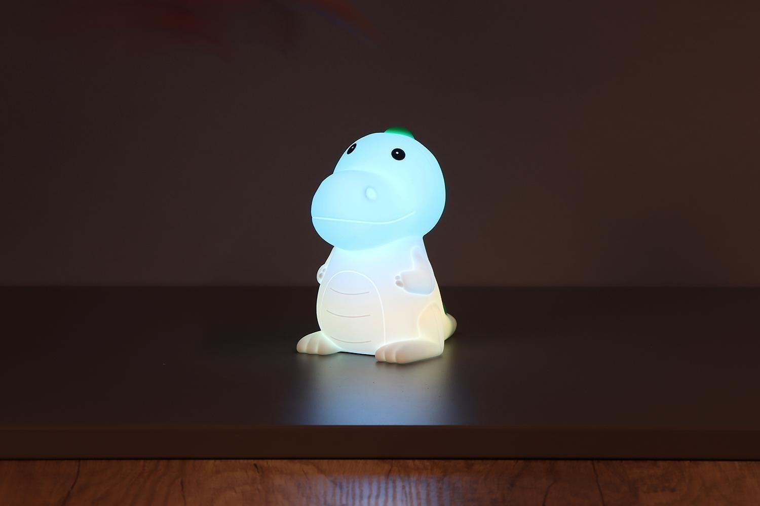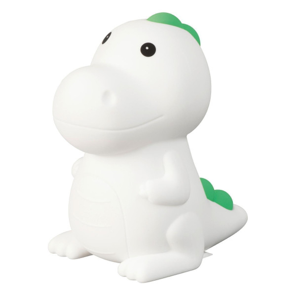 Das Akku LED-Nachtlicht POLDI der Marke FH Lighting besteht aus Silikon in Grün und Weiß und ist in Dinosaurierform gestaltet. Es verfügt über einen einstellbaren RGB-Farbwechsel sowie einen dreistufigen Touchdimmer. Das Nachtlicht wird über einen Akku mit USB-Ladekabel betrieben und ist über einen Schalter ein- und ausschaltbar. Die Maße betragen 8,5 cm in der Breite, 14 cm in der Höhe und 13,5 cm in der Tiefe. Eingesetzt ist ein LED-Leuchtmittel, das im Lieferumfang enthalten und nicht austauschbar ist. Dieses bietet eine Leistung von 0,7 Watt, eine Helligkeit von 60 Lumen sowie eine Farbtemperatur von 3000 Kelvin.