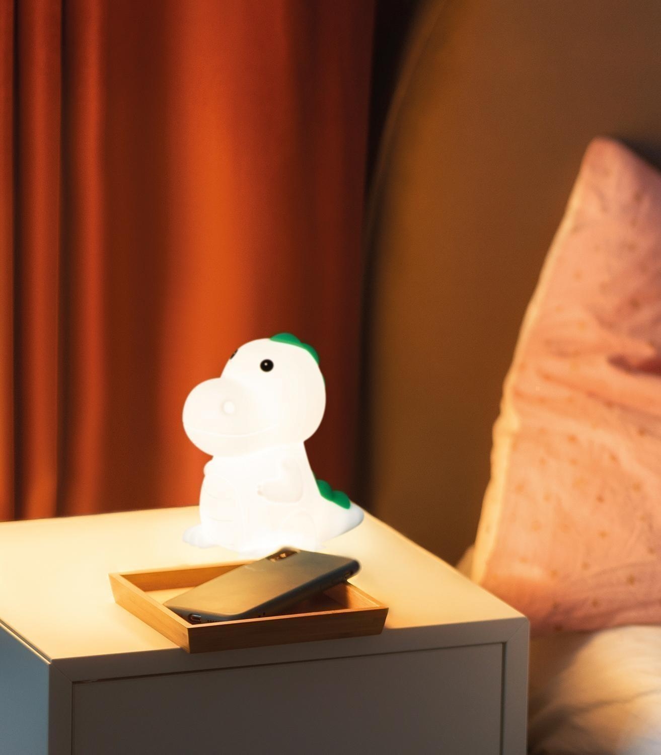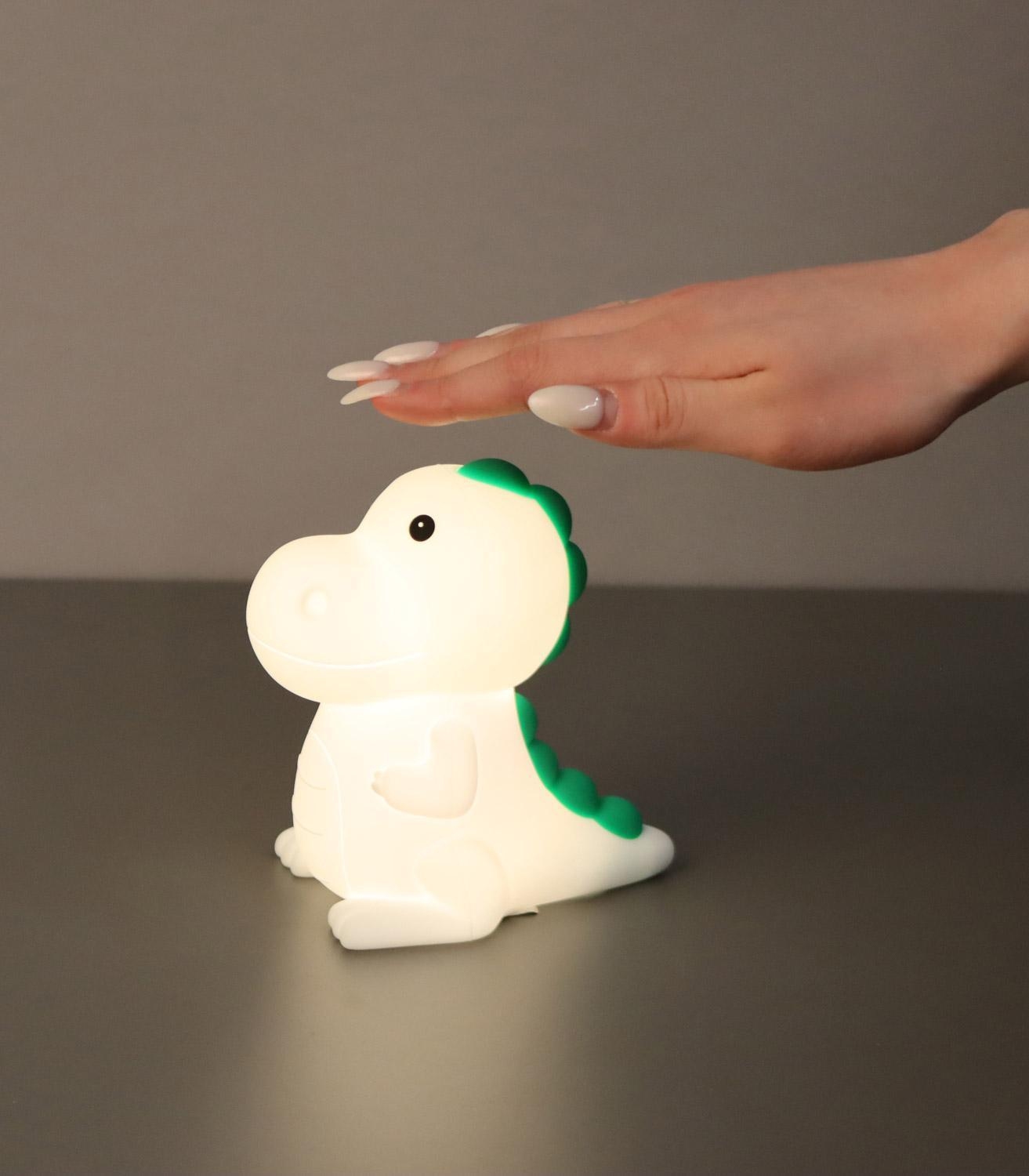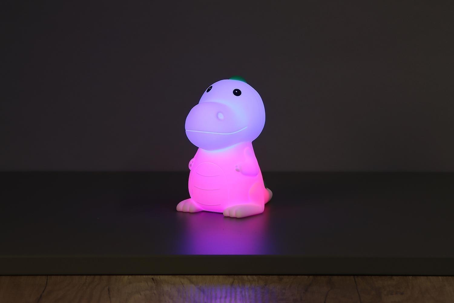 Das Akku LED-Nachtlicht POLDI der Marke FH Lighting besteht aus Silikon in Grün und Weiß und ist in Dinosaurierform gestaltet. Es verfügt über einen einstellbaren RGB-Farbwechsel sowie einen dreistufigen Touchdimmer. Das Nachtlicht wird über einen Akku mit USB-Ladekabel betrieben und ist über einen Schalter ein- und ausschaltbar. Die Maße betragen 8,5 cm in der Breite, 14 cm in der Höhe und 13,5 cm in der Tiefe. Eingesetzt ist ein LED-Leuchtmittel, das im Lieferumfang enthalten und nicht austauschbar ist. Dieses bietet eine Leistung von 0,7 Watt, eine Helligkeit von 60 Lumen sowie eine Farbtemperatur von 3000 Kelvin.