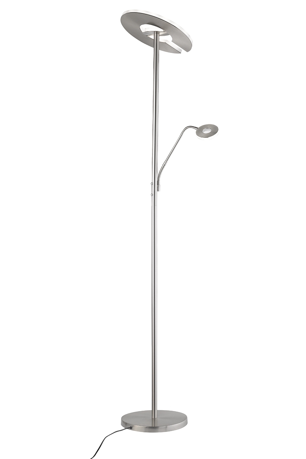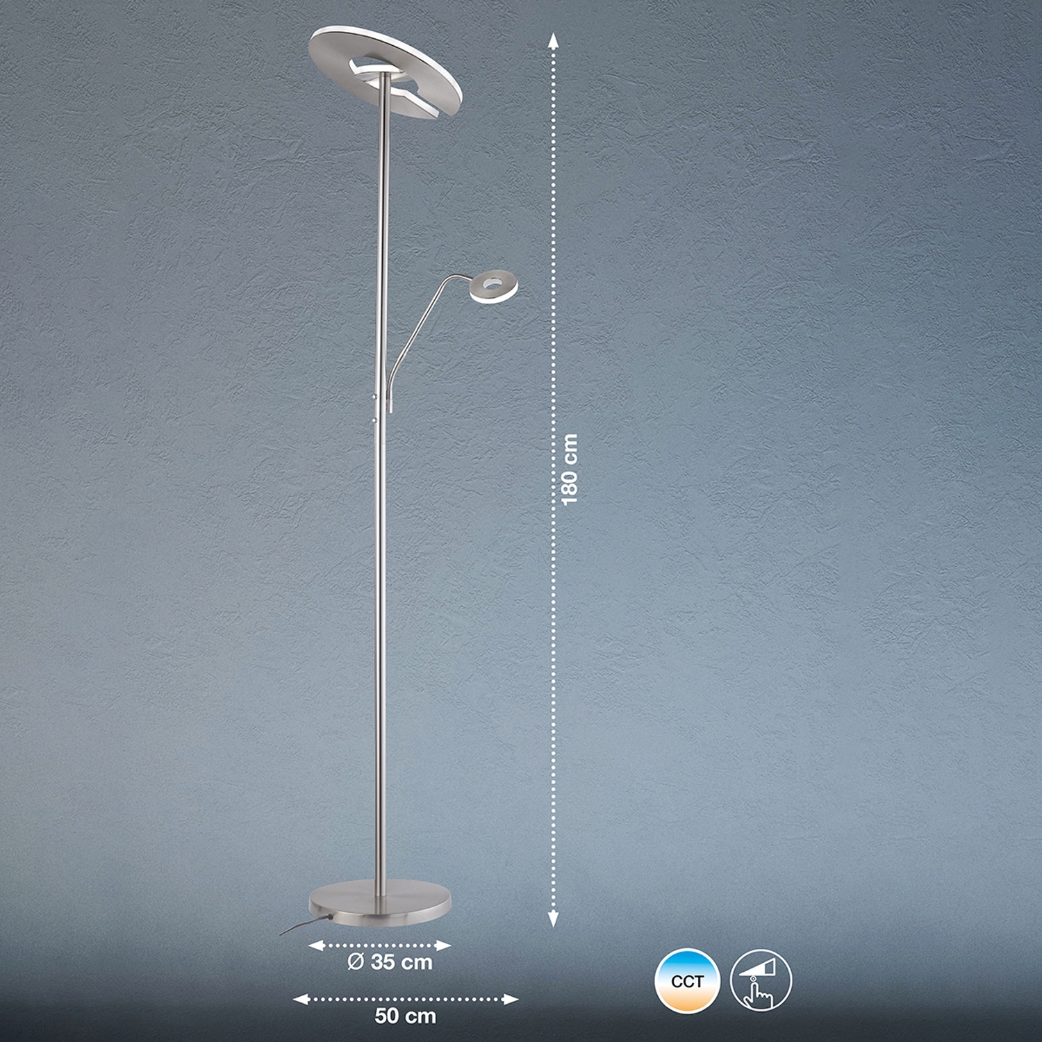 Der LED-Fluter DENT der Marke Fischer & Honsel besteht aus Metall in nickelfarben mit Lampenschirmen aus Acryl in weiß. Das Hauptlicht ist drehbar und kann das Licht in viele Richtungen ausstrahlen. Das Leuchtmittel vom Lesearm kann getrennt vom Hauptlicht Ein und wieder Aus geschaltet werden. Zudem ist der Lesearm in Höhe und Winkel verstellbar.