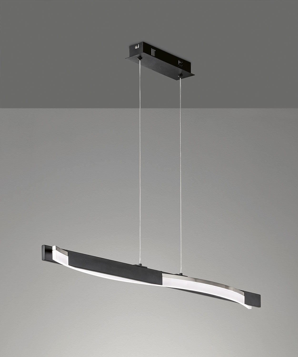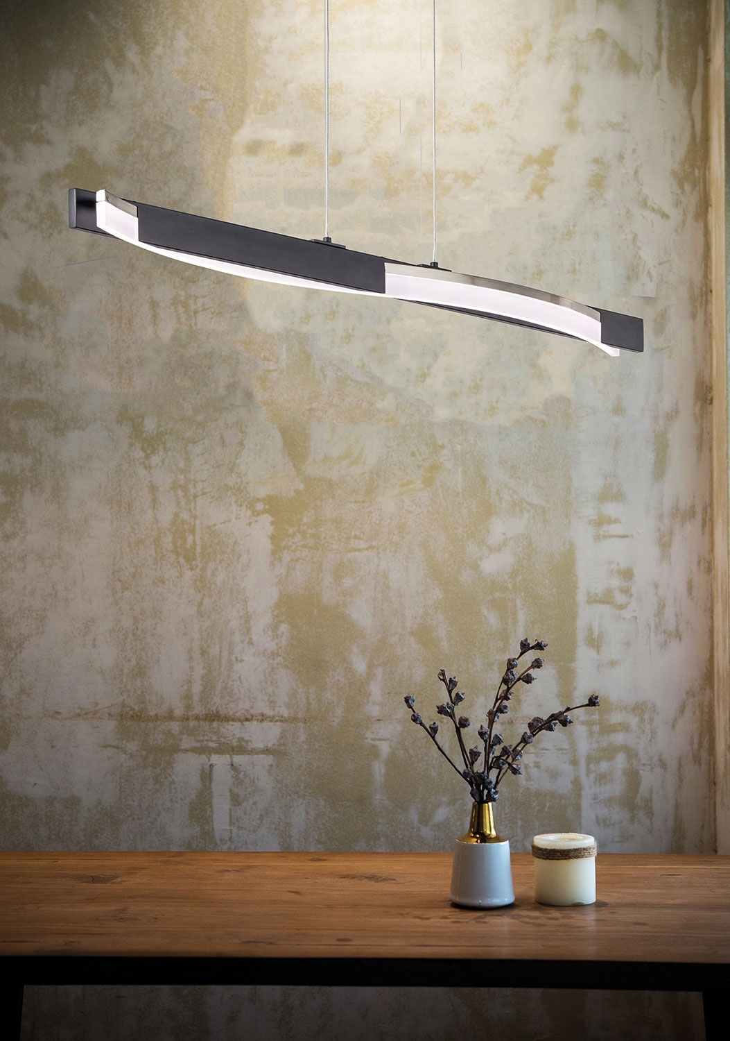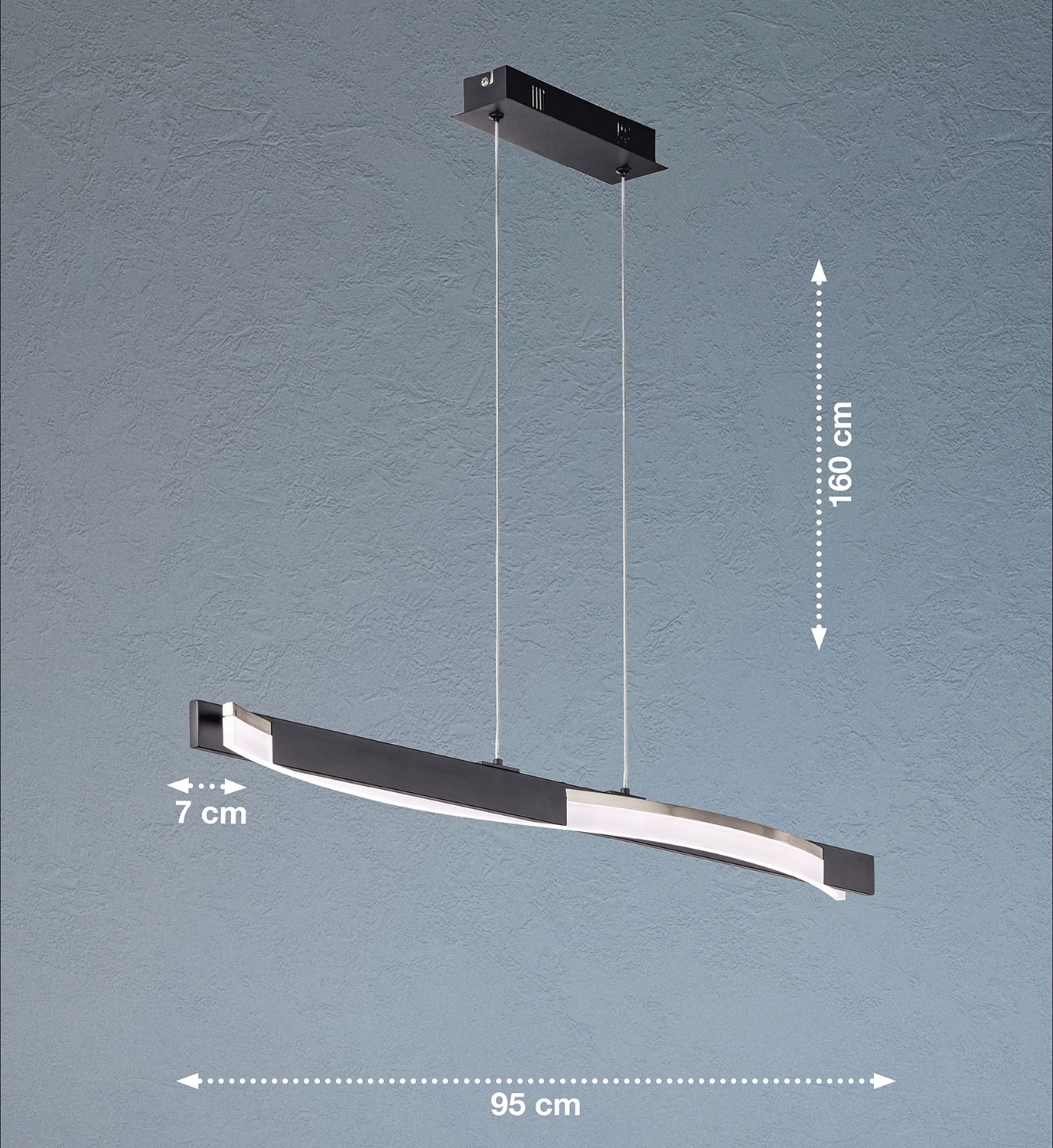 Die LED-Pendelleuchte BRIDGE von Fischer & Honsel besticht durch ihr modernes Design und ihre praktischen Funktionen. In Sandschwarz gehalten, besteht sie aus Metall und ist höhenverstellbar. Mit einer Breite von 95 cm und einer Höhe von 100 cm eignet sie sich ideal für vielfältige Anwendungsbereiche. Das integrierte LED-Leuchtmittel hat eine Leistung von 18 Watt und strahlt ein warmweißes Licht mit 3000 Kelvin und 2700 Lumen aus. Die Leuchte ist dimmbar und kann über einen Wandschalter bedient werden.