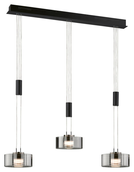 Die LED-Pendelleuchte LAVIN von Fischer & Honsel in Schwarz verbindet modernes Design mit Funktionalität. Mit ihrer Größe von 100 x 160 cm und den 3 Rauchglas-Lampenschirmen setzt sie stilvolle Akzente. Sie ist höhenverstellbar und über einen Wanddimmer stufenlos dimmbar. Die integrierten LEDs bieten warmweißes Licht mit 2700 K und 2900 Lumen. Die Leuchte wird teilmontiert geliefert und ist ideal für eine stimmungsvolle Raumatmosphäre.