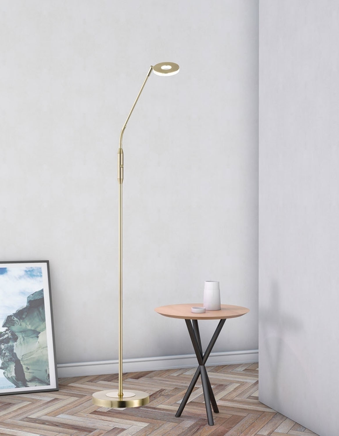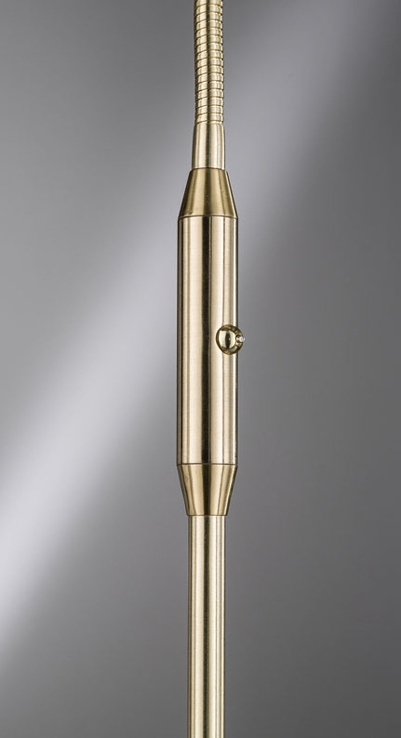 Die LED-Stehlampe besteht aus Metall in messingfarben mit Lampenschirm aus Acryl in weiß. Der Lampenschirm ist in Höhe und Winkel verstellbar.