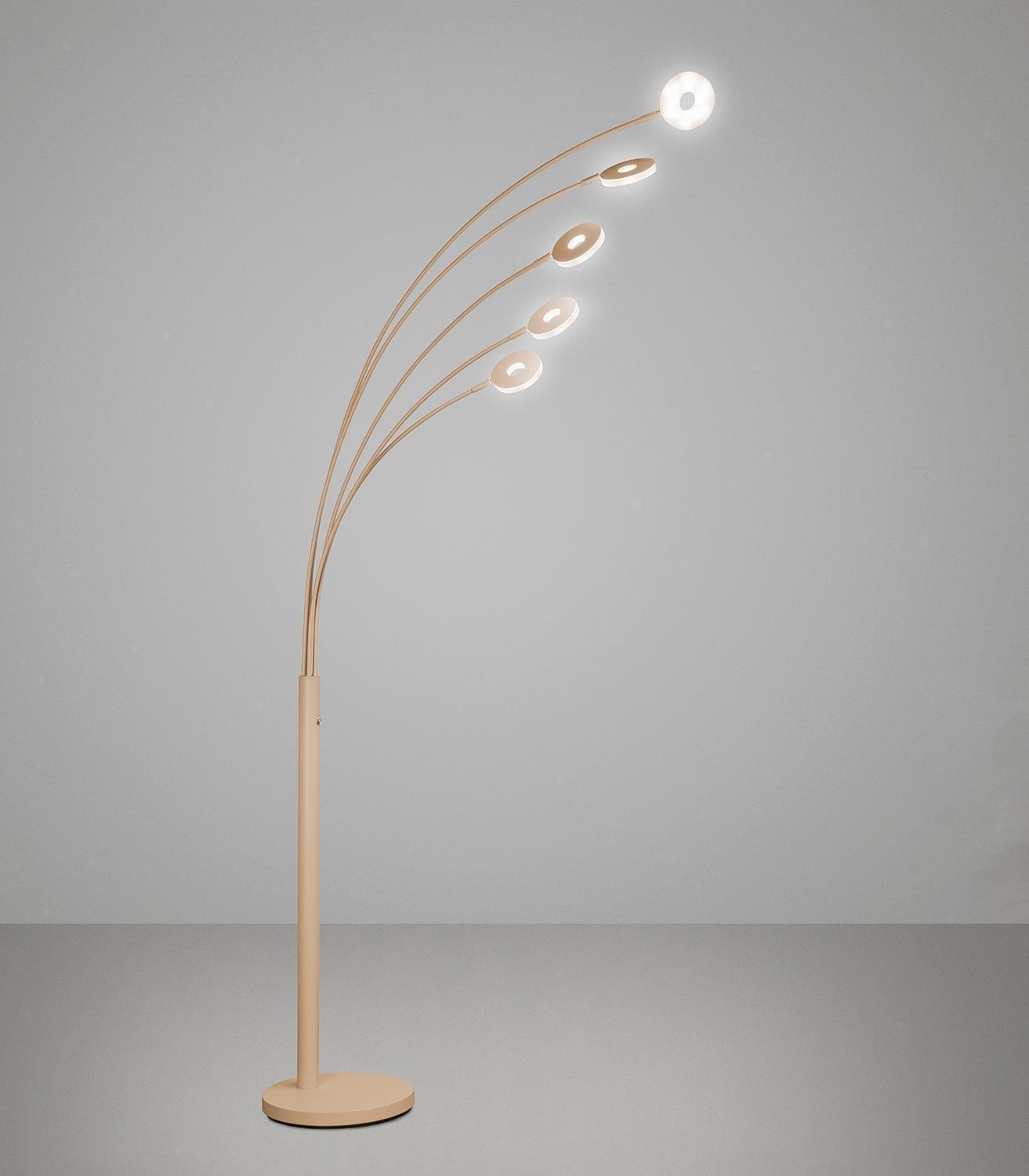 Die LED-Stehlampe DENT der Marke Fischer & Honsel ist aus sandfarbenem Metall gefertigt und verfügt über fünf Lampenschirme aus weißem Acryl. Diese Standleuchte weist eine Breite von 100 cm, eine Höhe von 225 cm sowie eine Tiefe von 79 cm auf. Zur Bedienung gehört ein Touchsensor, über den das Licht in drei Stufen gedimmt werden kann, zudem ist die Anpassung der Farbtemperatur in einem Bereich von 2700 bis 4000 Kelvin möglich. Die fest verbauten LED-Leuchtmittel erbringen eine Gesamtleistung von 37,5 Watt und liefern einen Lichtstrom von 4100 Lumen.