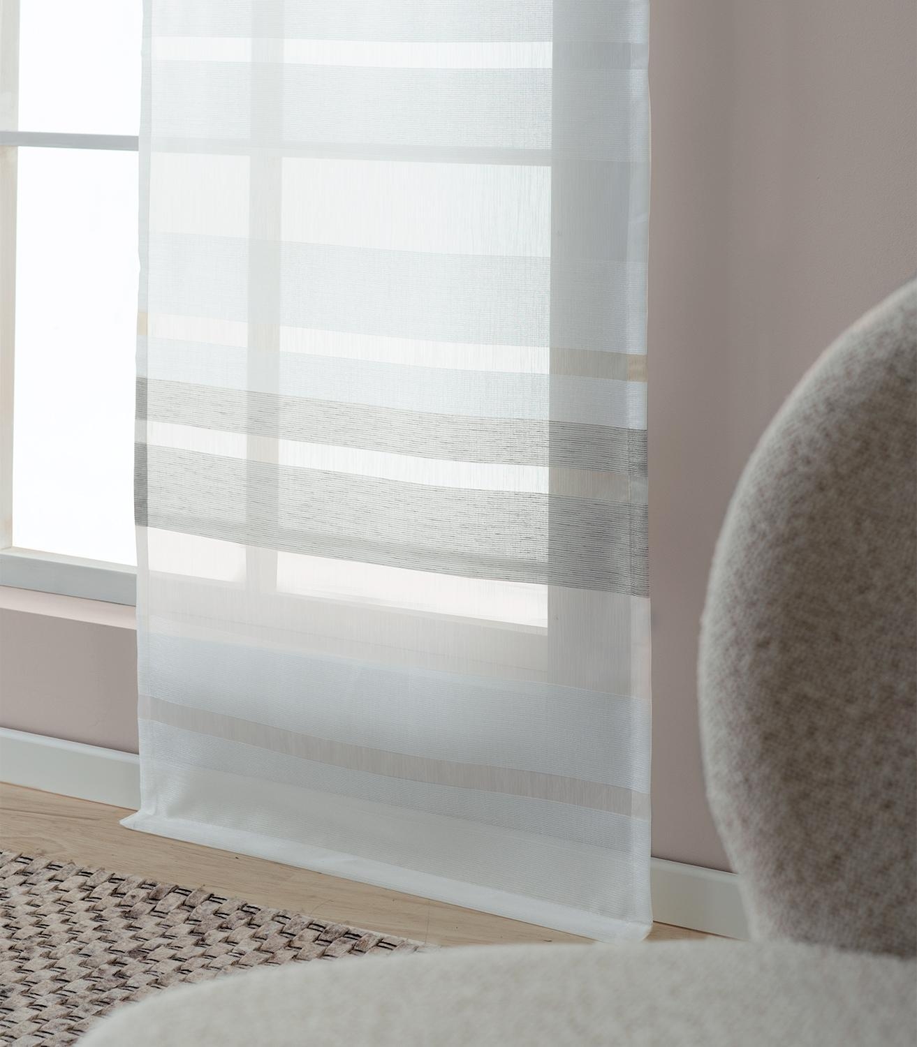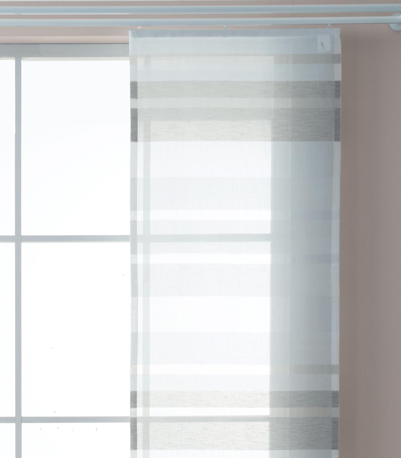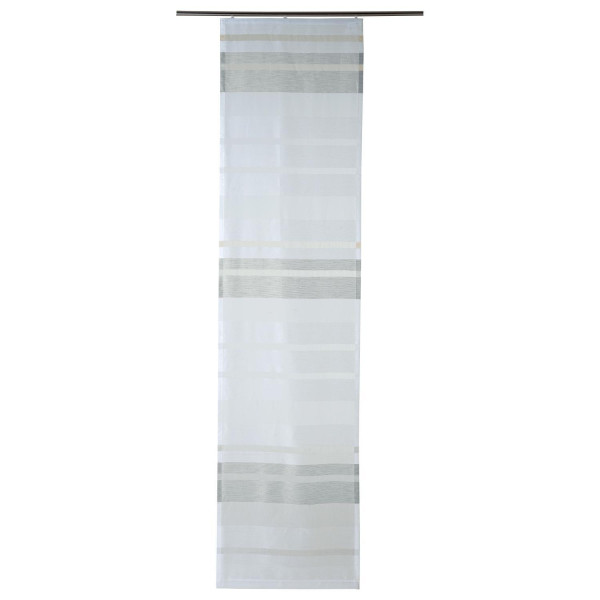 Der Flächenvorhang AKZENT in Weiß mit dezenten Querstreifen in Stahlgrau überzeugt durch seine moderne Optik und vielseitige Verwendbarkeit. Mit einer Breite von 60 cm und einer Länge von 245 cm aus pflegeleichtem Polyester gefertigt, fügt er sich harmonisch in verschiedene Wohnstile ein. Der Vorhang wird inklusive Technik zum Anbringen geliefert und lässt sich einfach montieren. Sein zeitloses Design kombiniert mit praktischer Handhabung macht ihn zu einem stilvollen und funktionalen Wohn-Accessoire.
