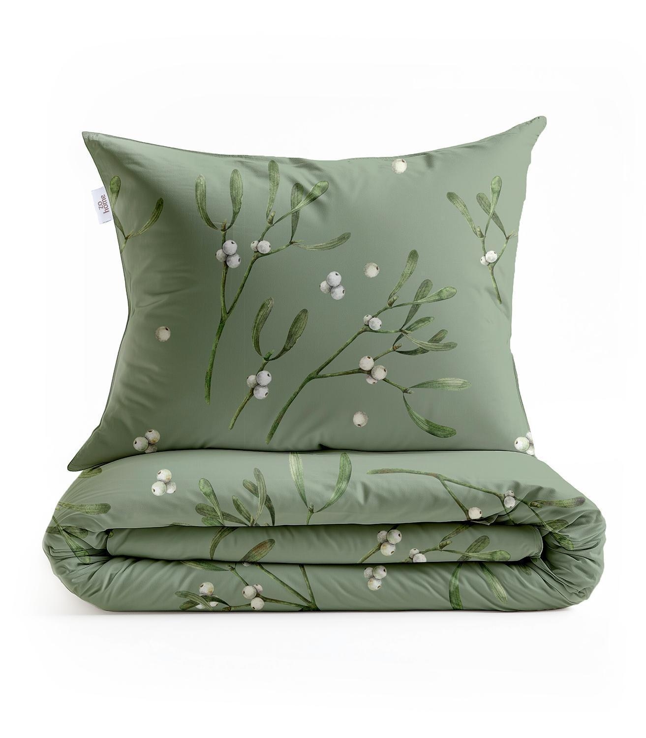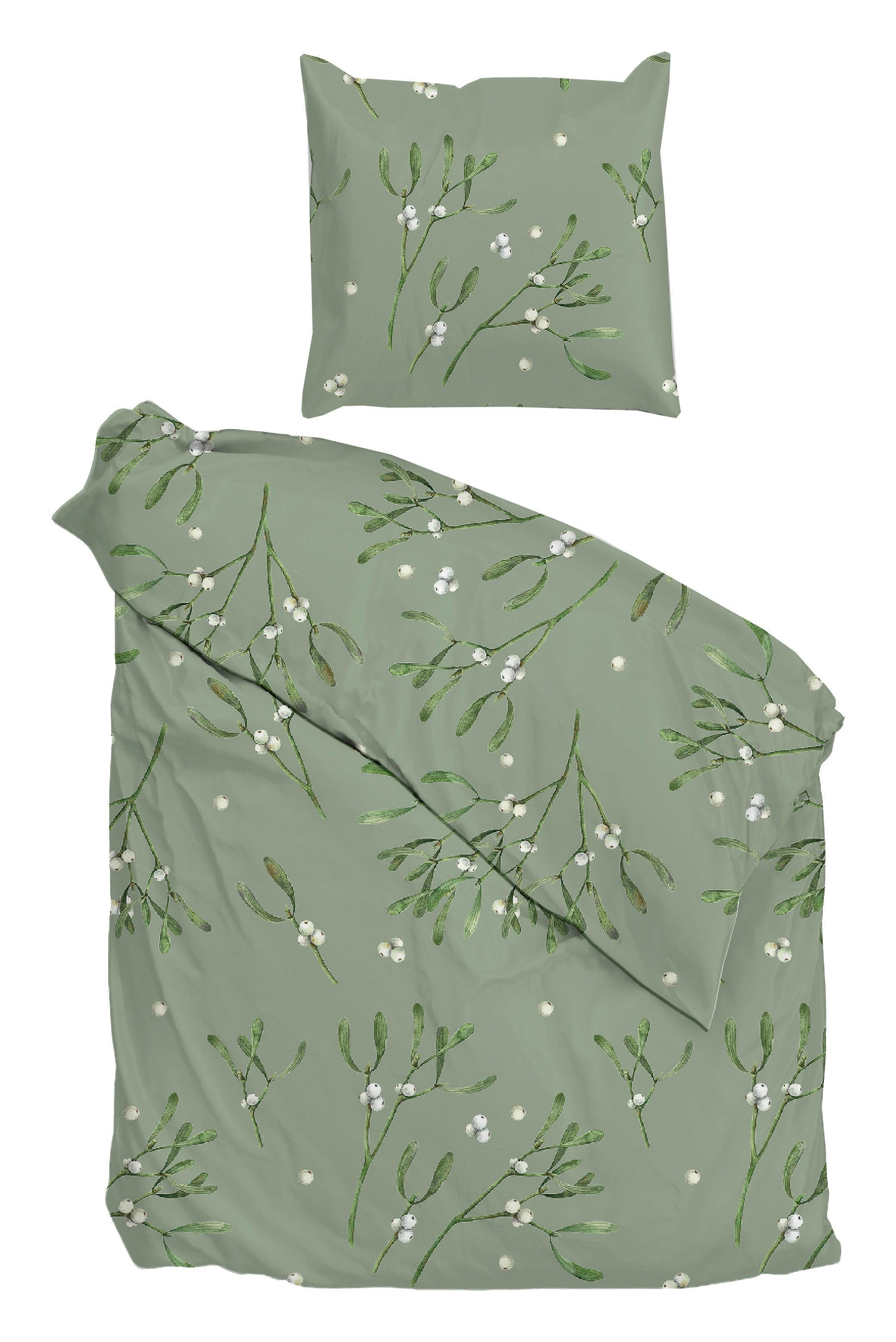 Die Flanell-Bettwäsche HEDRA aus Baumwolle in Grün mit weißen Akzenten bringt eine natürliche und gemütliche Note in Ihr Schlafzimmer. Mit einer Größe von 135 x 200 cm umfasst das Set einen Bettbezug und einen Kissenbezug. Das weiche Flanellmaterial sorgt für angenehme Wärme und hohen Schlafkomfort. Die dekorativen Motive mit grünen Mistelzweigen und weißen Beeren setzen stilvolle Akzente. Dank des praktischen Reißverschlusses lässt sich die Bettwäsche leicht und schnell beziehen.