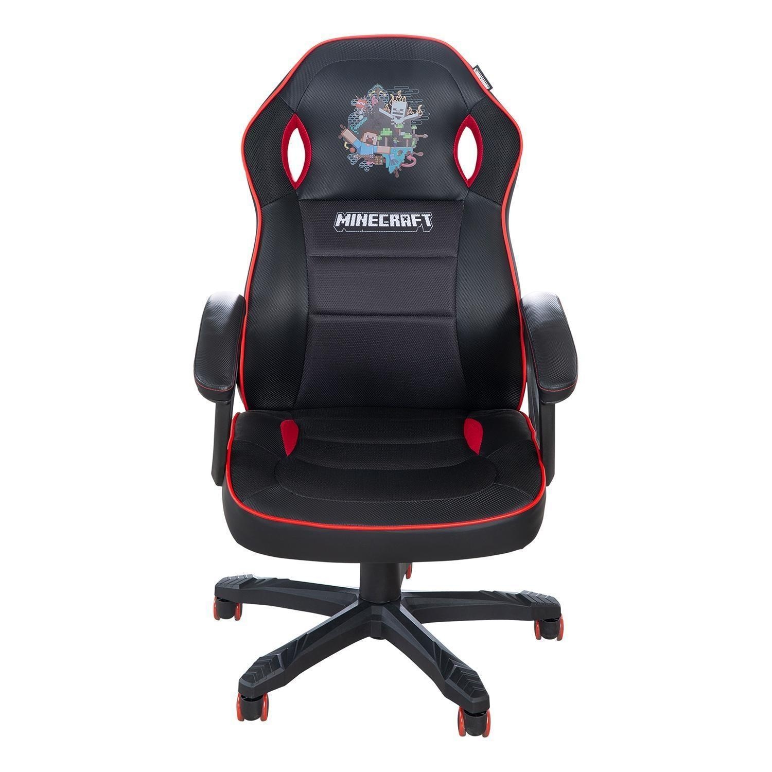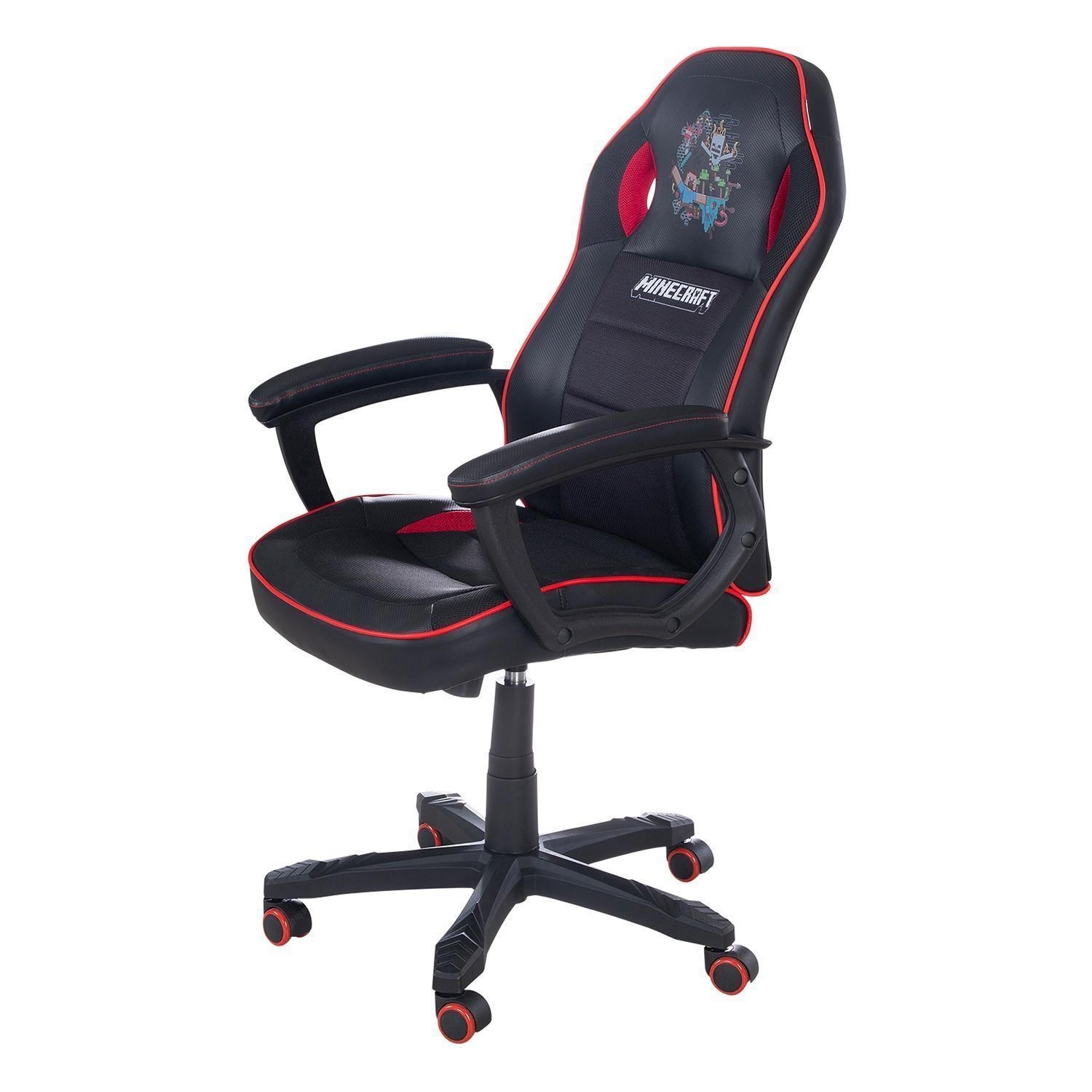 Der Gaming-Stuhl MINECRAFT ist in Rot und Schwarz gehalten und mit Minecraft-Logos sowie einem Schriftzug versehen. Er verfügt über gepolsterte Armlehnen und eine Wippfunktion. Die Sitzhöhe ist stufenlos verstellbar.