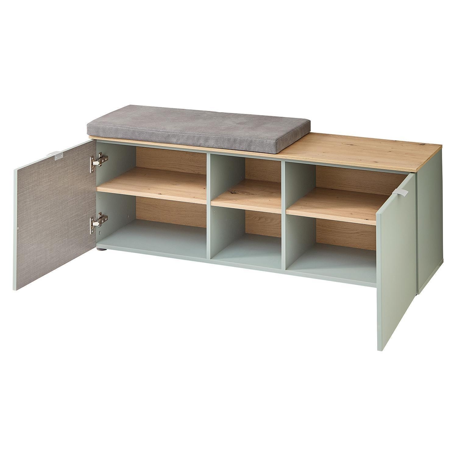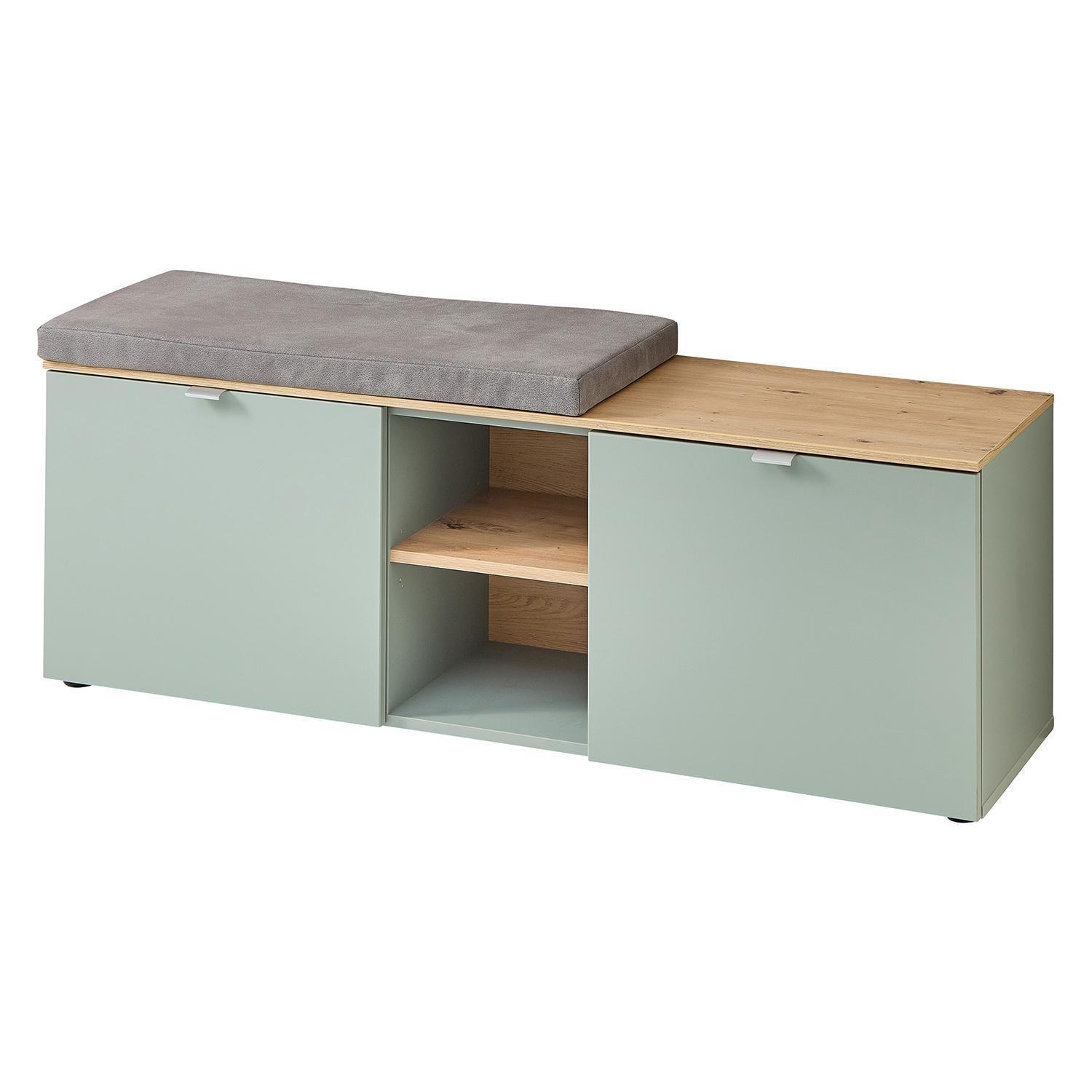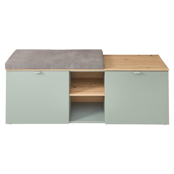 Die Garderobenbank BALTAS ist in Schilfgrün gestaltet und verfügt über Absetzungen sowie eine Oberplatte im Artisan Eiche Dekor. Sie ist mit zwei Türen ausgestattet, hinter denen sich zwei Ablagefächer und zwei Einlegeböden befinden. Ein Sitzkissen in Lederoptik ist im Lieferumfang enthalten. Die Bank hat eine Breite von 128 cm, eine Höhe von 50 cm und eine Tiefe von 38 cm.