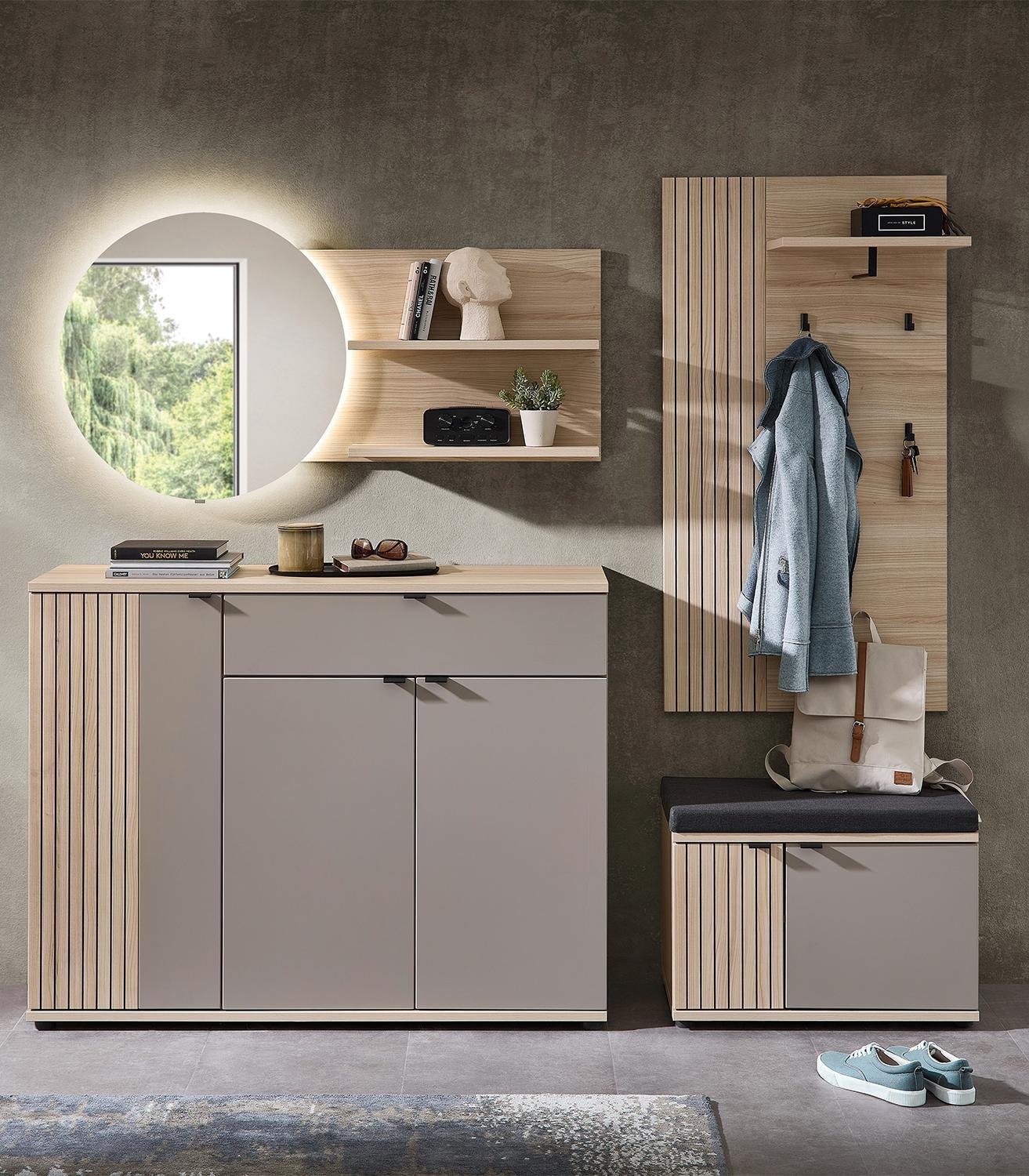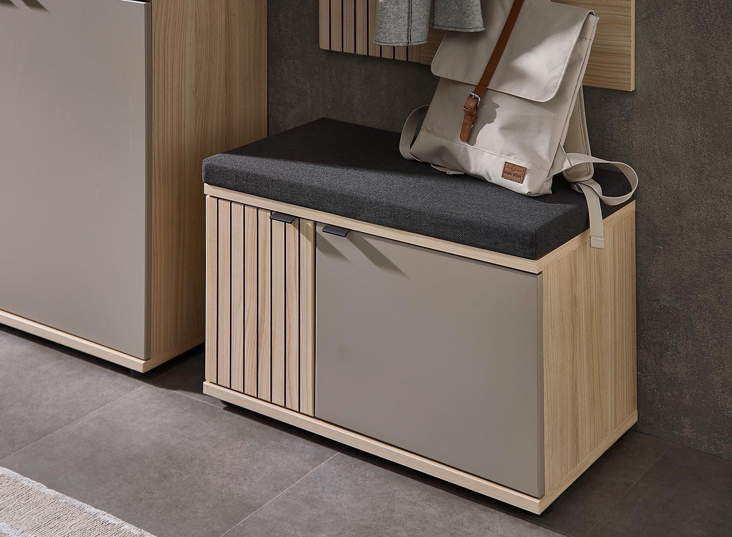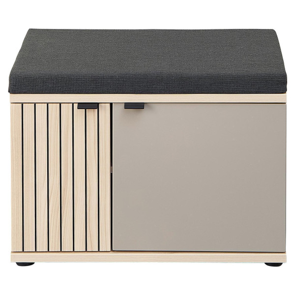 Die Garderobenbank PISOLO ist in Riva Eiche Dekor gefertigt und mit Fronten in Basalt sowie Riva Eiche Dekor kombiniert. Sie ist mit zwei Türen ausgestattet, die über eine Soft-Close-Funktion verfügen. Im Inneren befinden sich zwei höhenverstellbare Einlegeböden, die jeweils in drei Stufen angepasst werden können. Ein Sitzkissen mit Stoffbezug in Anthrazit ergänzt die Ausstattung. Die Griffe bestehen aus Metall in Schwarz. Die Maße betragen 70 cm in der Breite, 50 cm in der Höhe und 38 cm in der Tiefe.