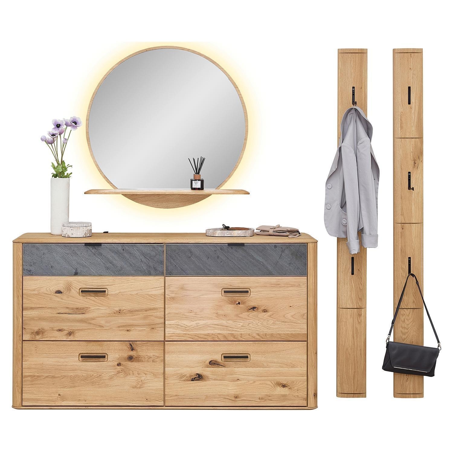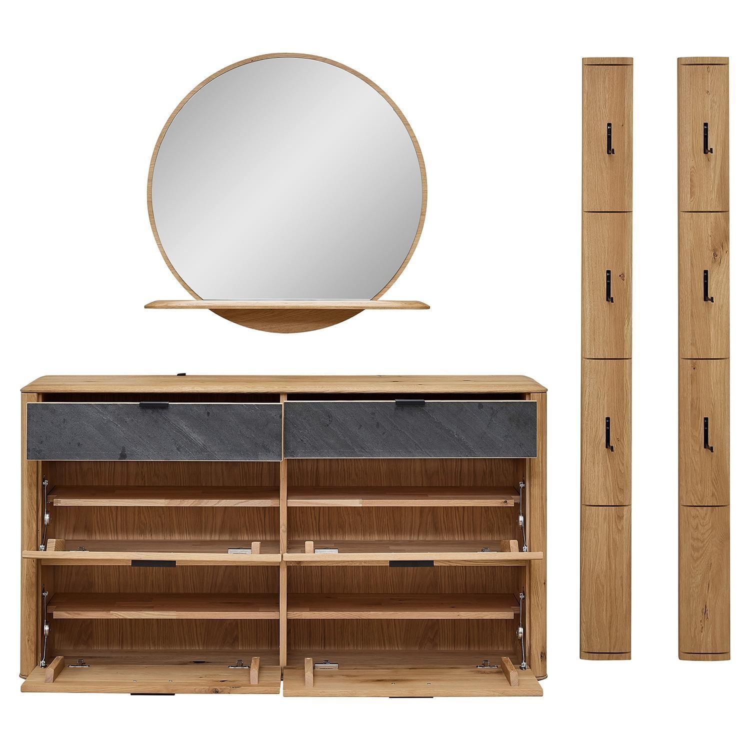 Die vierteilige Garderobenkombination MONTALVO besteht aus massivem Wildeichenholz und ist mit Absetzungen in Granit- und Steinoptik furniert. Zum Set gehören zwei Garderobenpaneele, die jeweils mit drei Haken ausgestattet sind. Eine Schuhkommode mit vier Klappen, vier Einlegeböden und zwei Schubladen bietet Stauraum für Schuhe und kleinere Gegenstände. Die Schubladen verfügen über eine Soft-Close-Funktion. Die Kommode ist für eine hängende Wandmontage vorgesehen. Ergänzt wird das Ensemble durch einen Spiegel, der mit einer Ablagefläche versehen ist, jedoch keine integrierte Beleuchtung besitzt. Griffe und Haken bestehen aus schwarz mattiertem Aluminium. Die Gesamtmaße der Kombination betragen 180 cm in der Breite, 180 cm in der Höhe und 34 cm in der Tiefe.