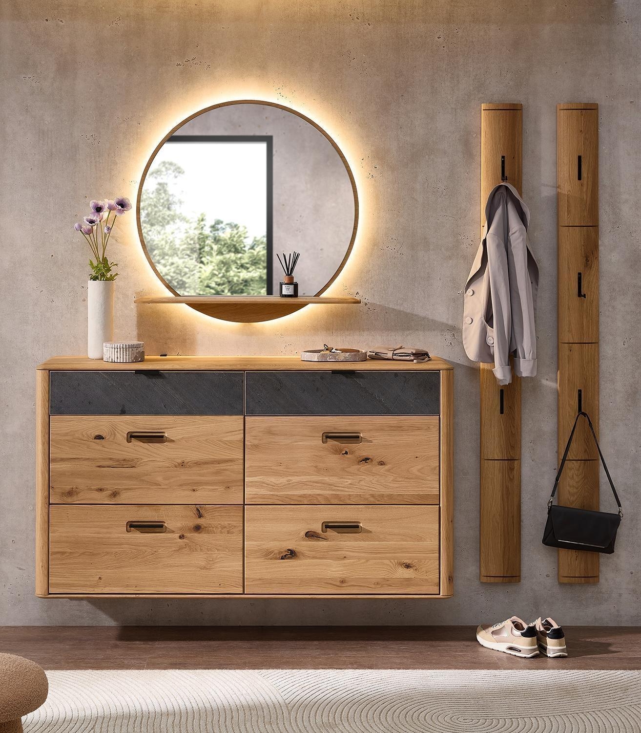 | Lieferumfang: | 4-teilige Garderobenkombination bestehend aus 1 wandhängendem Schuhschrank mit 4 Klappen, 4 Einlegeböden und 2 Schubladen mit Soft-Close-Funktion, 2 Garderobenpaneele mit je 3 Haken und 1 Spiegel mit 1 Ablagefläche. Die LED-Beleuchtung ist nicht enthalten |