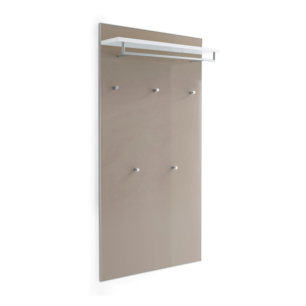 Das Garderobenpaneel TISANTE ist in Weiß gehalten und mit einer Front aus Glas in Taupe versehen. Die Wandgarderobe verfügt über eine Kleiderstange, fünf Kleiderhaken und eine Hutablage. Die Breite beträgt 80 cm, die Höhe 170 cm und die Tiefe 27 cm.