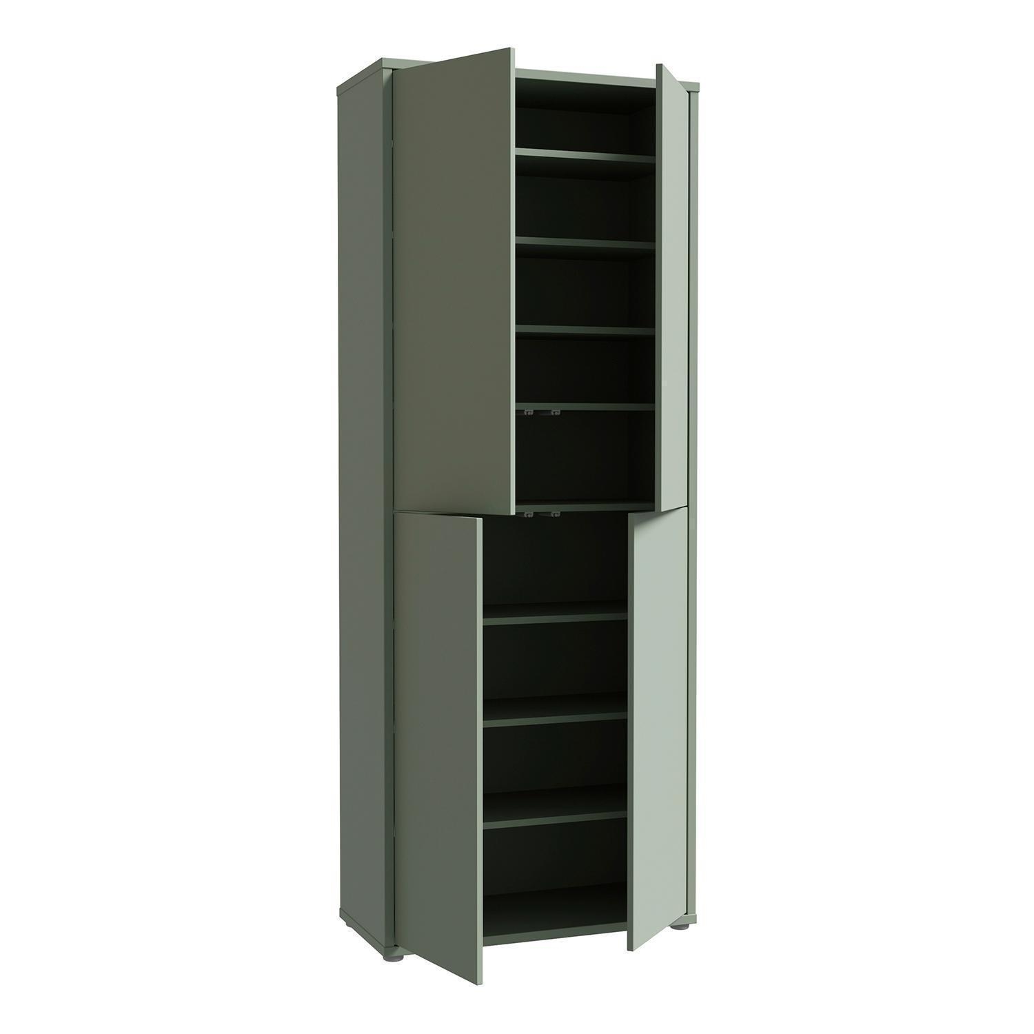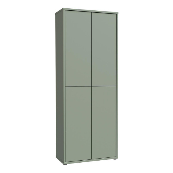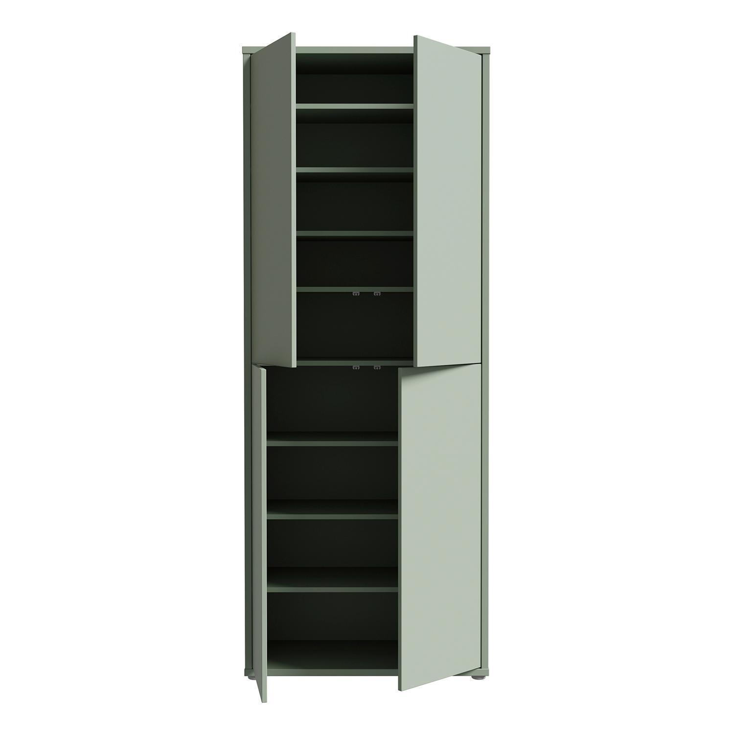 Der Garderobenschrank AIDEN ist in Salbeigrün ausgeführt. Er verfügt über vier Türen sowie acht höhenverstellbare Einlegeböden. Das grifflos gestaltete Design ist mit einer Push-to-Open-Funktion ausgestattet. Die Maße betragen 75 cm in der Breite, 192 cm in der Höhe und 35 cm in der Tiefe.