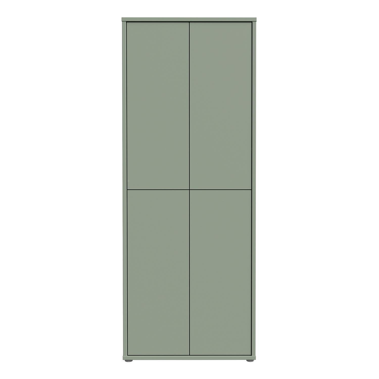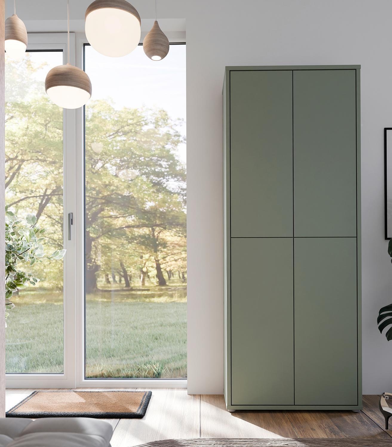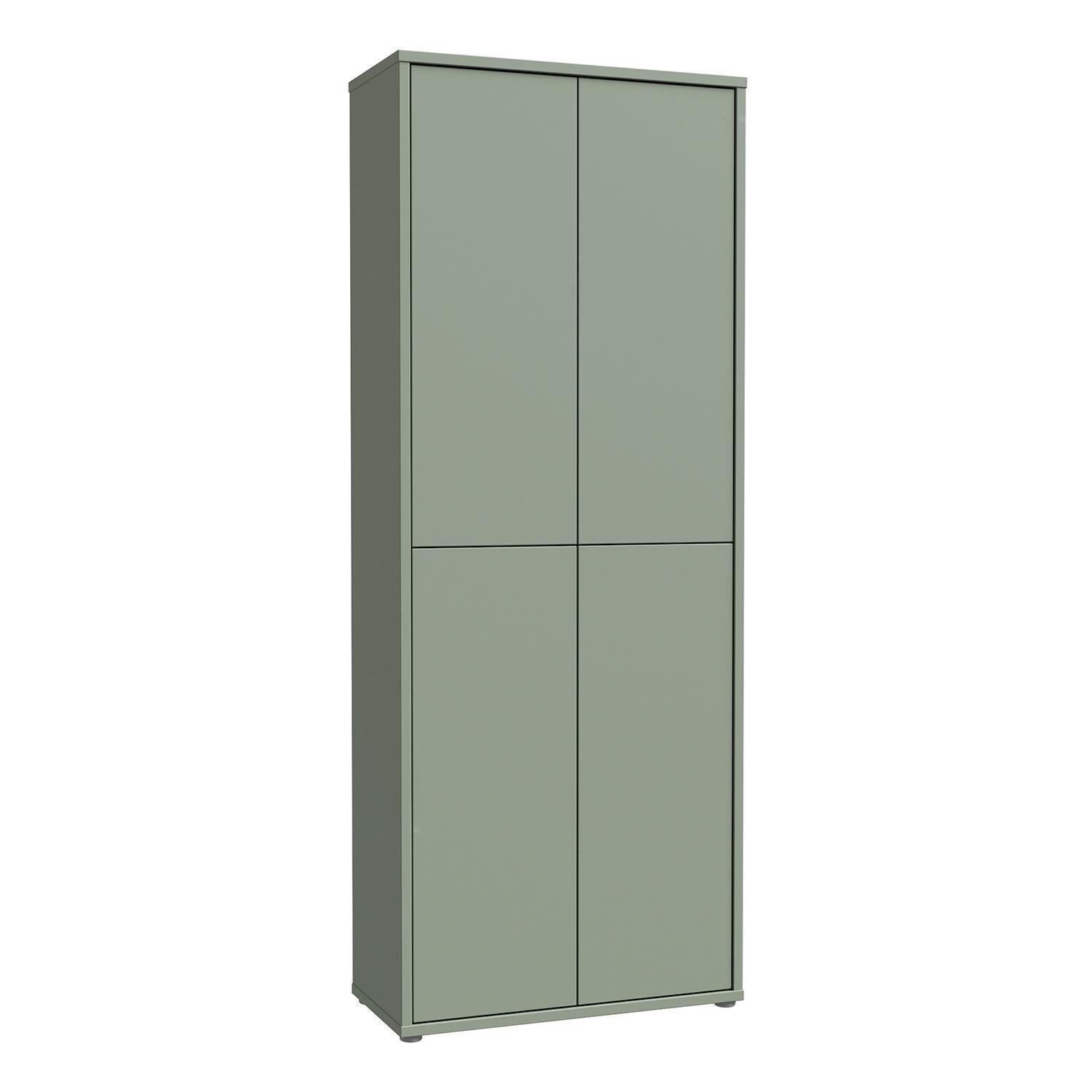 Der Garderobenschrank AIDEN ist in Salbeigrün ausgeführt. Er verfügt über vier Türen sowie acht höhenverstellbare Einlegeböden. Das grifflos gestaltete Design ist mit einer Push-to-Open-Funktion ausgestattet. Die Maße betragen 75 cm in der Breite, 192 cm in der Höhe und 35 cm in der Tiefe.