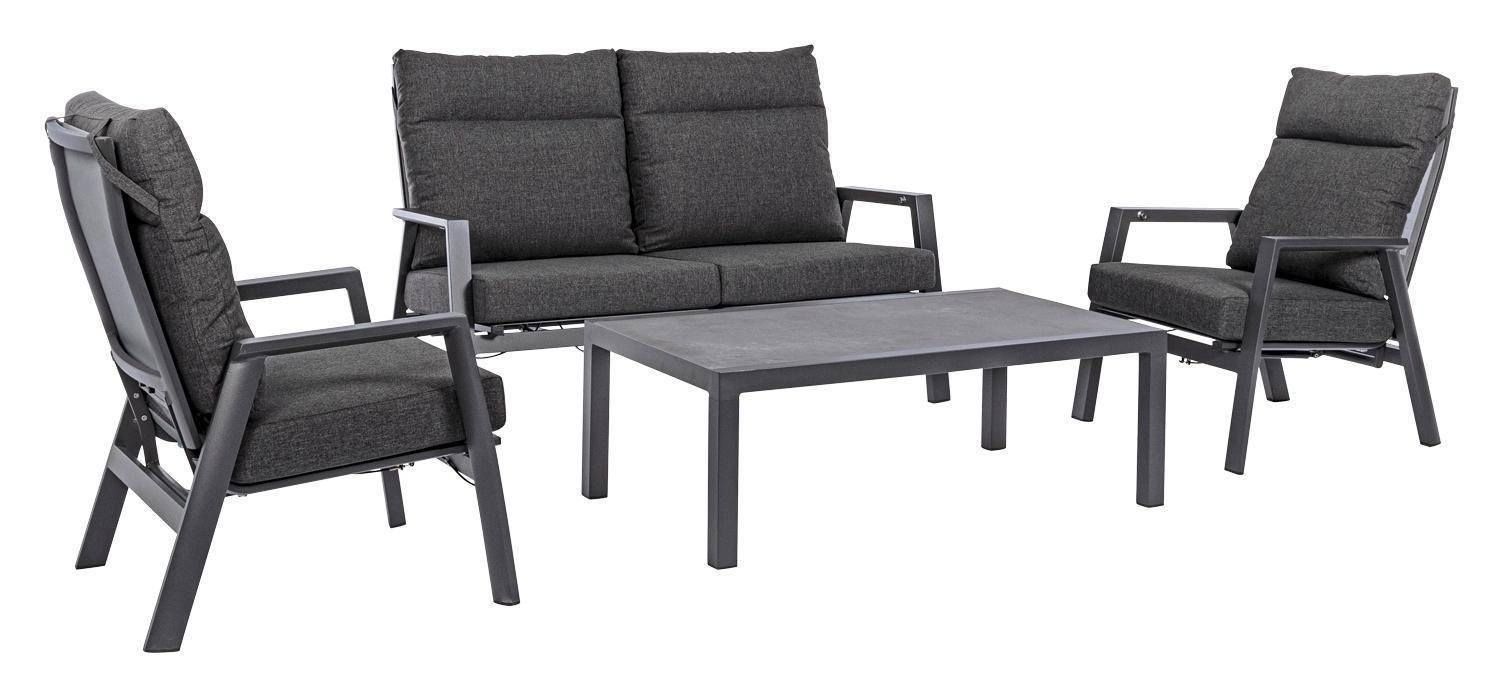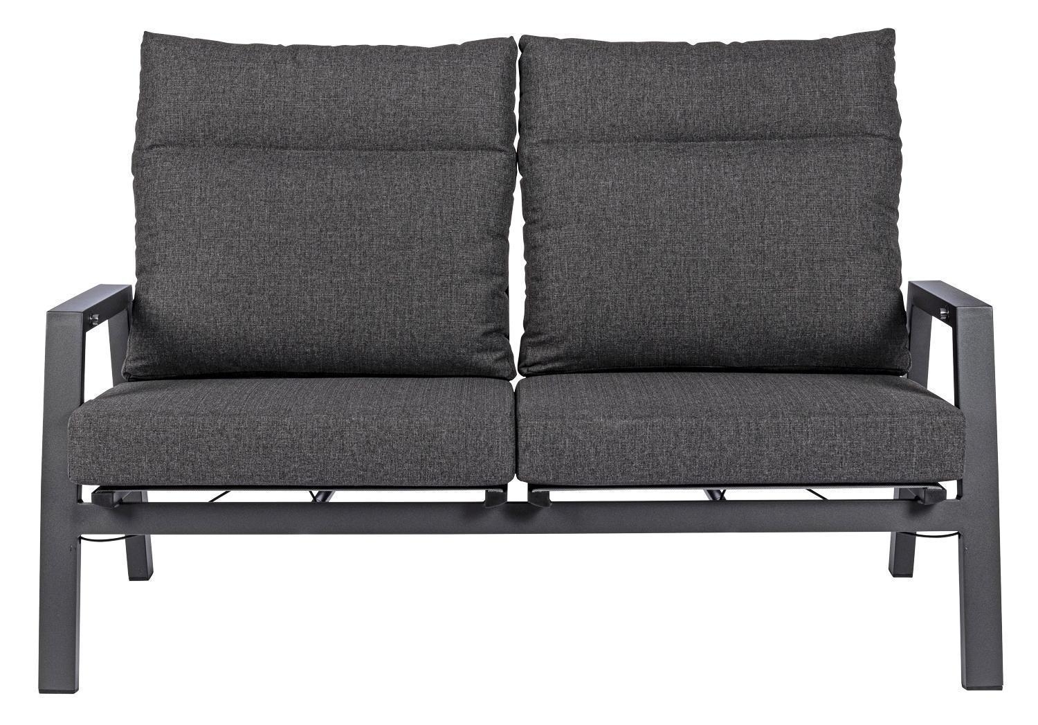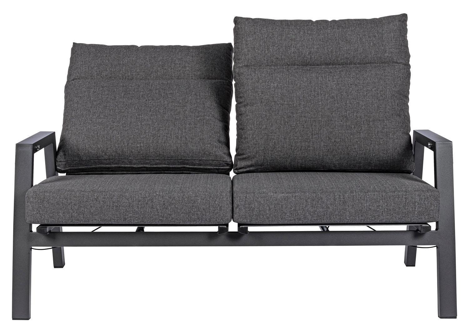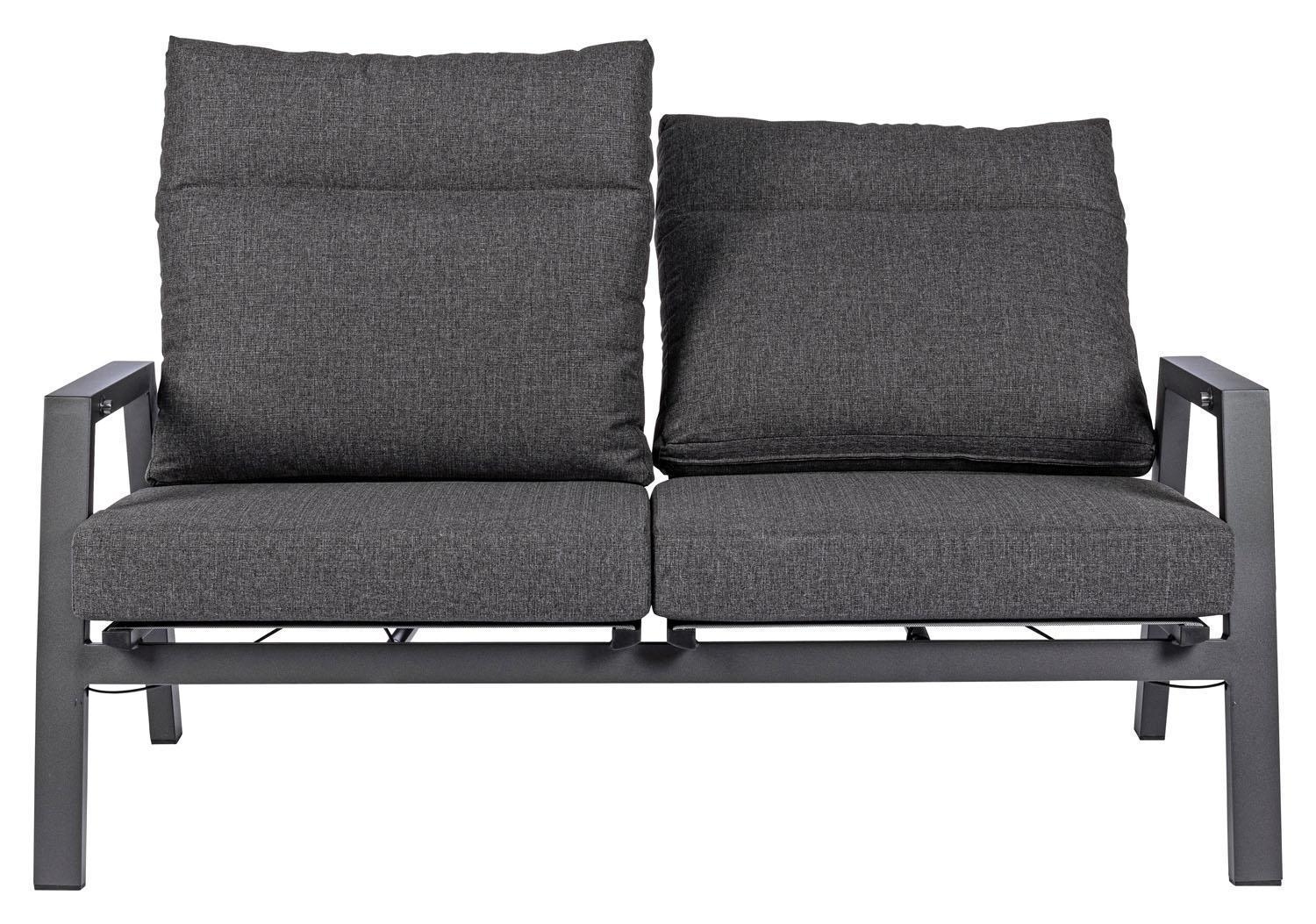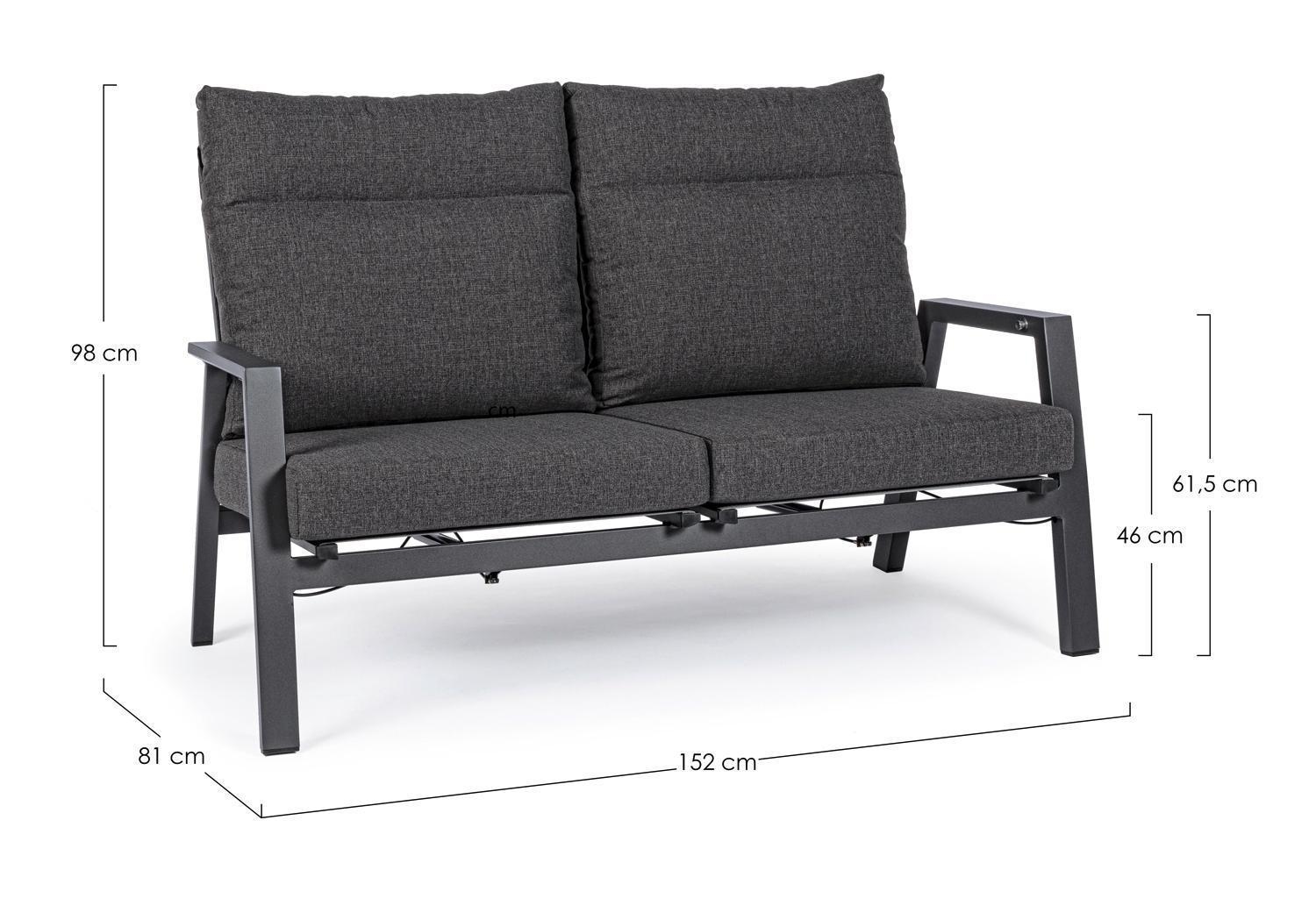 Die Gartenbank KLEDI der Marke Bizzotto besteht aus Aluminium in Anthrazit. Die Sitz- und Rückenbespannung ist aus Textilen gefertigt. Die Auflagen sind mit einem Bezug aus Polypropylen in Anthrazit versehen und verfügen über praktische Gurte an den Rückenteilen. Die Rückenlehnen sind separat 7-fach verstellbar. Die Maße der Bank betragen 152 cm Breite, 98 cm Höhe und 81 cm Tiefe.