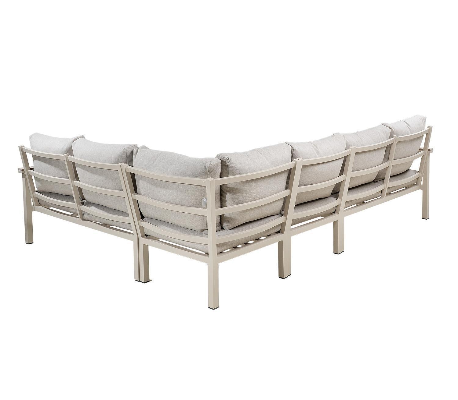 Die Gartenlounge FUJI ist in Champagnerfarben gehalten und verfügt über ein Gestell aus Aluminium, Kissenbezüge aus Olefin sowie eine Tischplatte aus Polywood mit Holzoptik. Zur Loungegruppe gehören sechs Sitzkissen und sieben Rückenkissen. Die Breite beträgt 249 cm, die Tiefe 187 cm. Die Sitzhöhe liegt bei 70 cm.