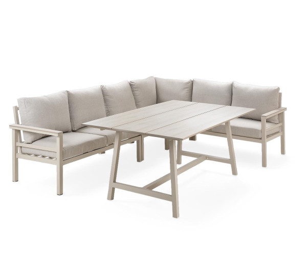 | Lieferumfang: | 2-teilige Gartenlounge bestehend aus 1 Sitzecke und 1 Esstisch. Die 6 Sitzkissen und 7 Rückenkissen sind enthalten. |