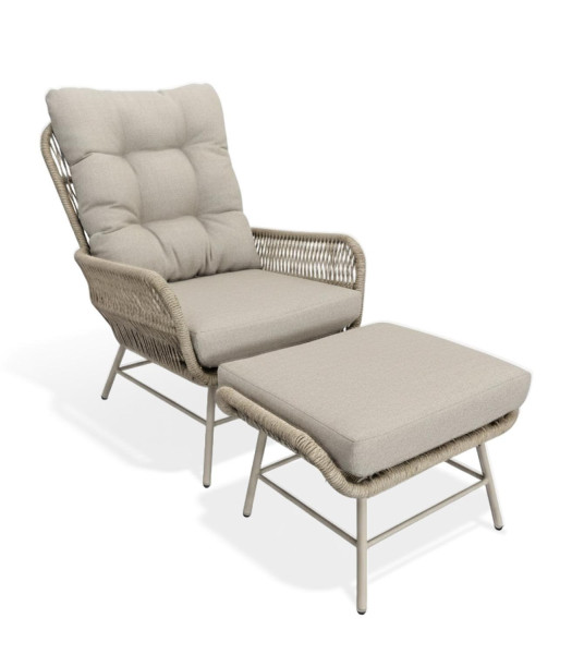 Das 2-teilige Gartenmöbel-Set LEVANTE besteht aus einem Gartensessel und einem Gartenhocker, die jeweils über ein Gestell aus Aluminium verfügen. Die Sitz- und Rückenbespannung dieser Outdoor-Möbel ist aus beigefarbenen Seilen gefertigt. Zum Lieferumfang gehören champagnerfarbene Sitzkissen, deren Bezüge abnehmbar und waschbar sind. Durch die Kombination von Aluminiumgestell und Seilbespannung ist dieses Set für die Verwendung im Außenbereich vorgesehen. Die beige- und champagnerfarbene Gestaltung kennzeichnet die optische Erscheinung dieses Garten-Arrangements.