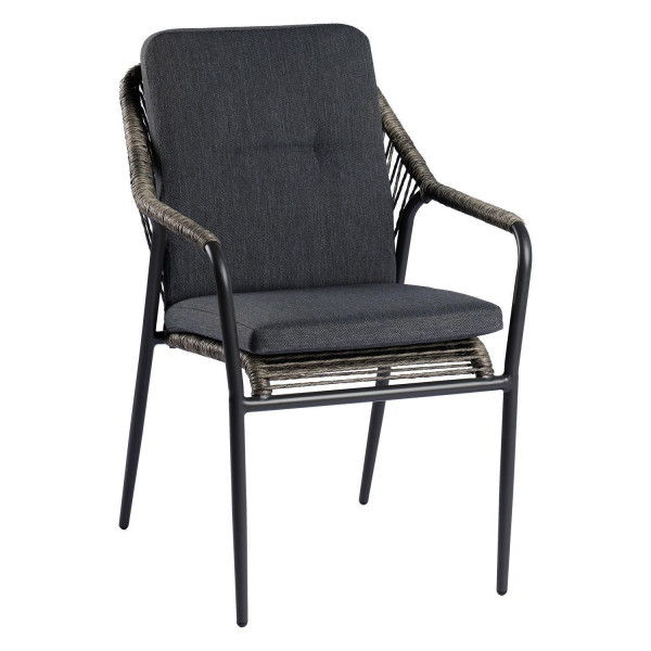 Der Gartenstuhl CORTEZ DINING ist mit einem schwarzen Aluminiumgestell ausgestattet, das für Stabilität und Wetterbeständigkeit sorgt. Sitz- und Rückenkissen verfügen über Bezüge aus Olefin in der Farbe Anthrazit. Die Rücken- und Sitzflächen sind mit braunen Seilen bespannt, die eine luftige Struktur ermöglichen. Der Stuhl hat eine Breite von 62 cm, eine Höhe von 86 cm und eine Tiefe von 57 cm