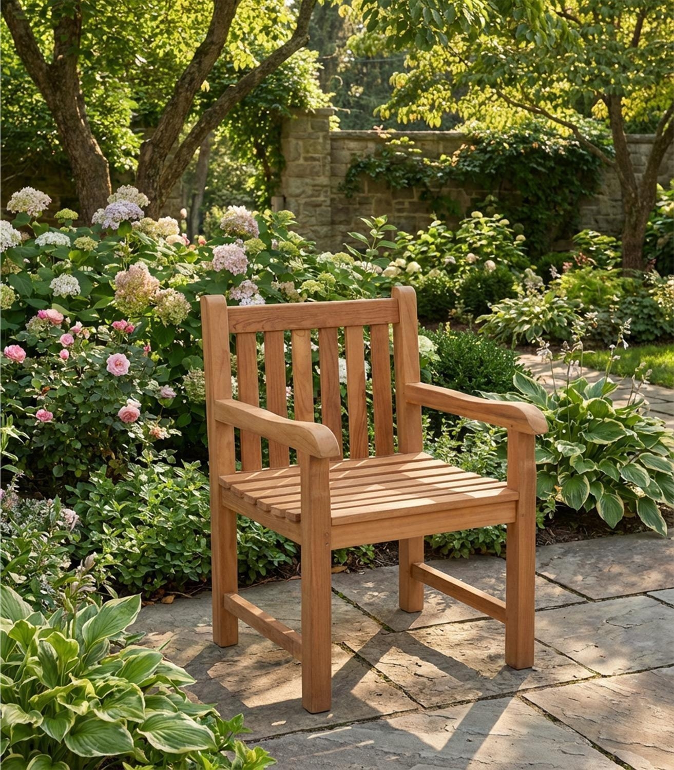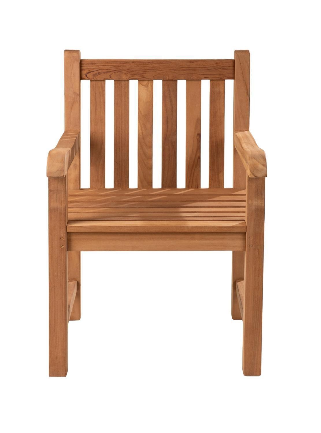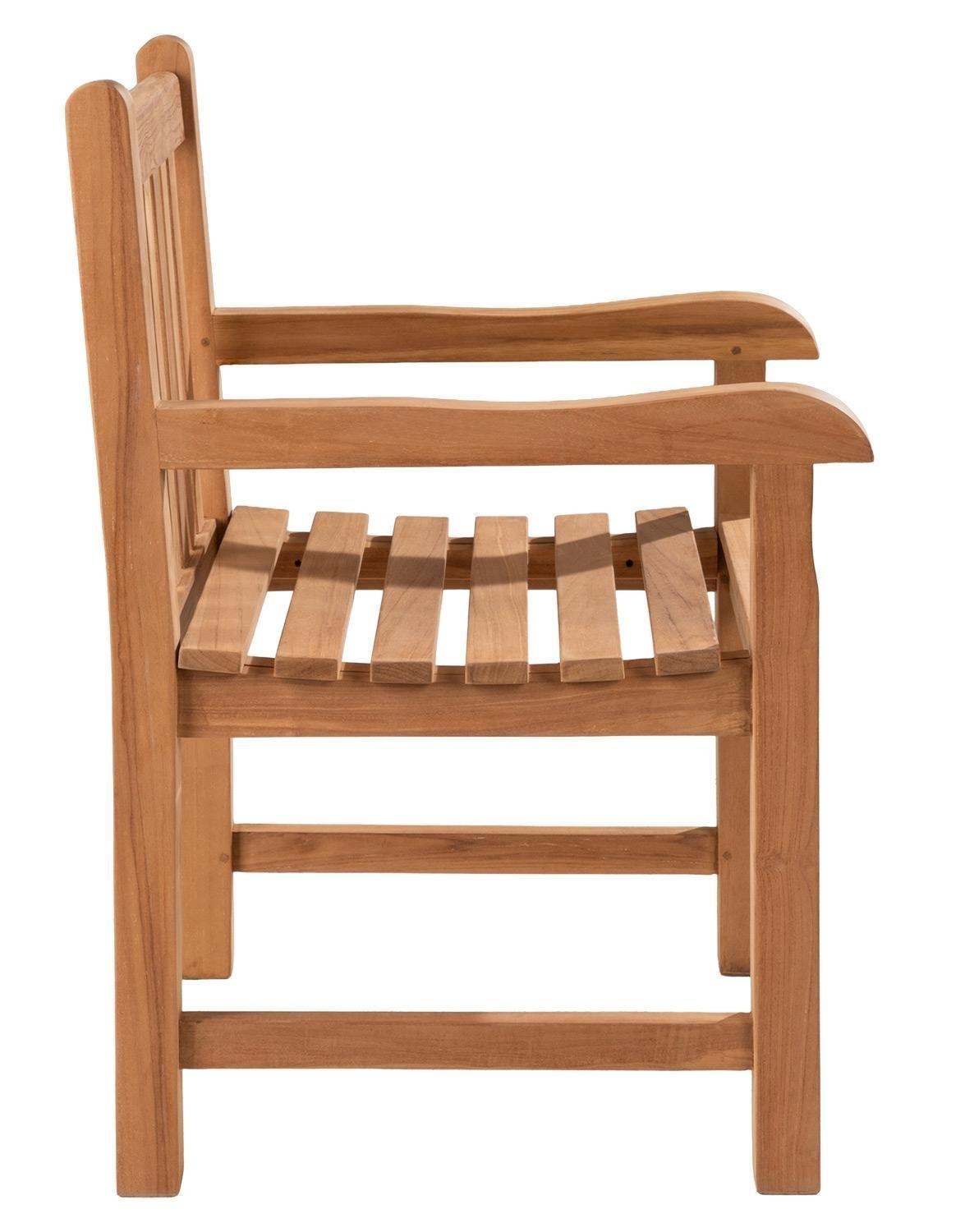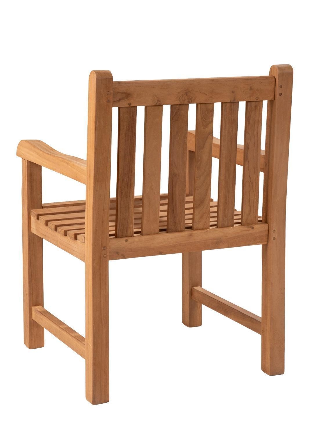 Der Gartenstuhl KAMPEN der Marke Home4You ist aus massivem Teakholz gefertigt und in der Farbe Braun gestaltet. Dieses Sitzmöbel für den Außenbereich verfügt über Armlehnen sowie eine leicht abgerundete Sitzfläche. Die Abmessungen belaufen sich auf eine Breite von 60 cm, eine Höhe von 87 cm und eine Tiefe von 51 cm. Aufgrund der Materialeigenschaften des massiven Teakholzes ist dieser Holzstuhl witterungsbeständig.