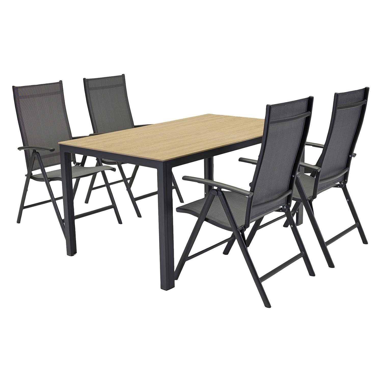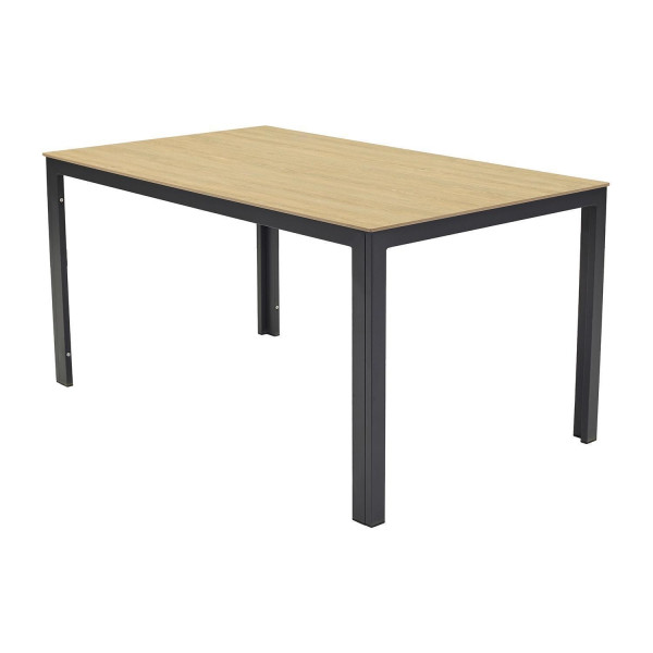 Der Gartentisch GRAVIO kombiniert eine Tischplatte aus Glas in brauner Holzoptik mit einem anthrazitfarbenen Aluminiumgestell. Dieses Möbelstück weist eine Breite von 150 cm, eine Höhe von 75 cm sowie eine Tiefe von 90 cm auf. Aufgrund der verwendeten Materialien ist die gesamte Konstruktion pflegeleicht und witterungsbeständig. Die Abmessungen dieses Tisches sind für die Nutzung durch 4 Personen ausgelegt.
