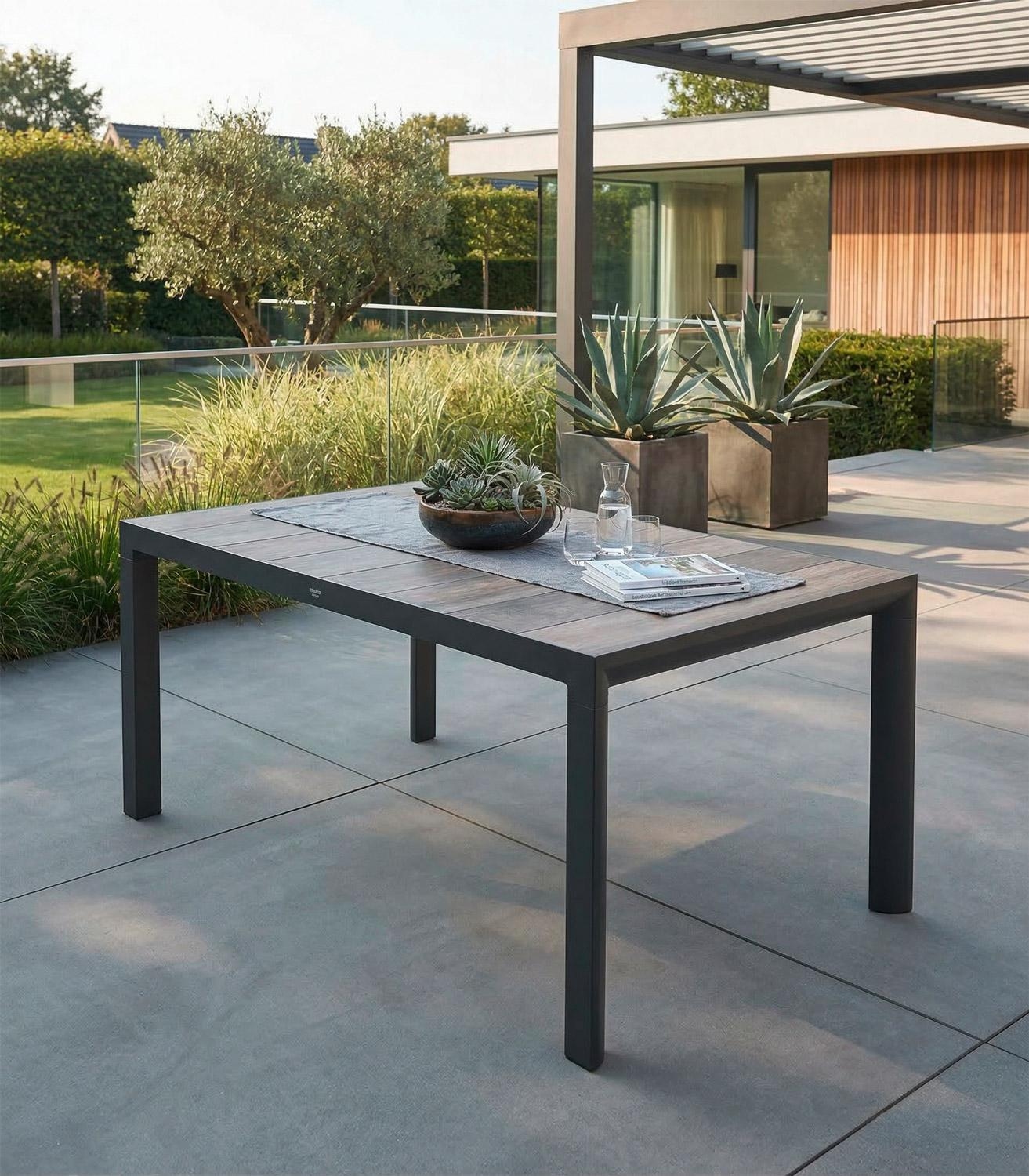 Der Gartentisch SILVA wird mit einer Tischplatte aus Keramik in verwaschenem Grau gefertigt. Dieser Esstisch hat ein anthrazitfarbenes Gestell aus Aluminium und weist eine Breite von 160,5 cm, eine Tiefe von 90 cm sowie eine Höhe von 74 cm auf.