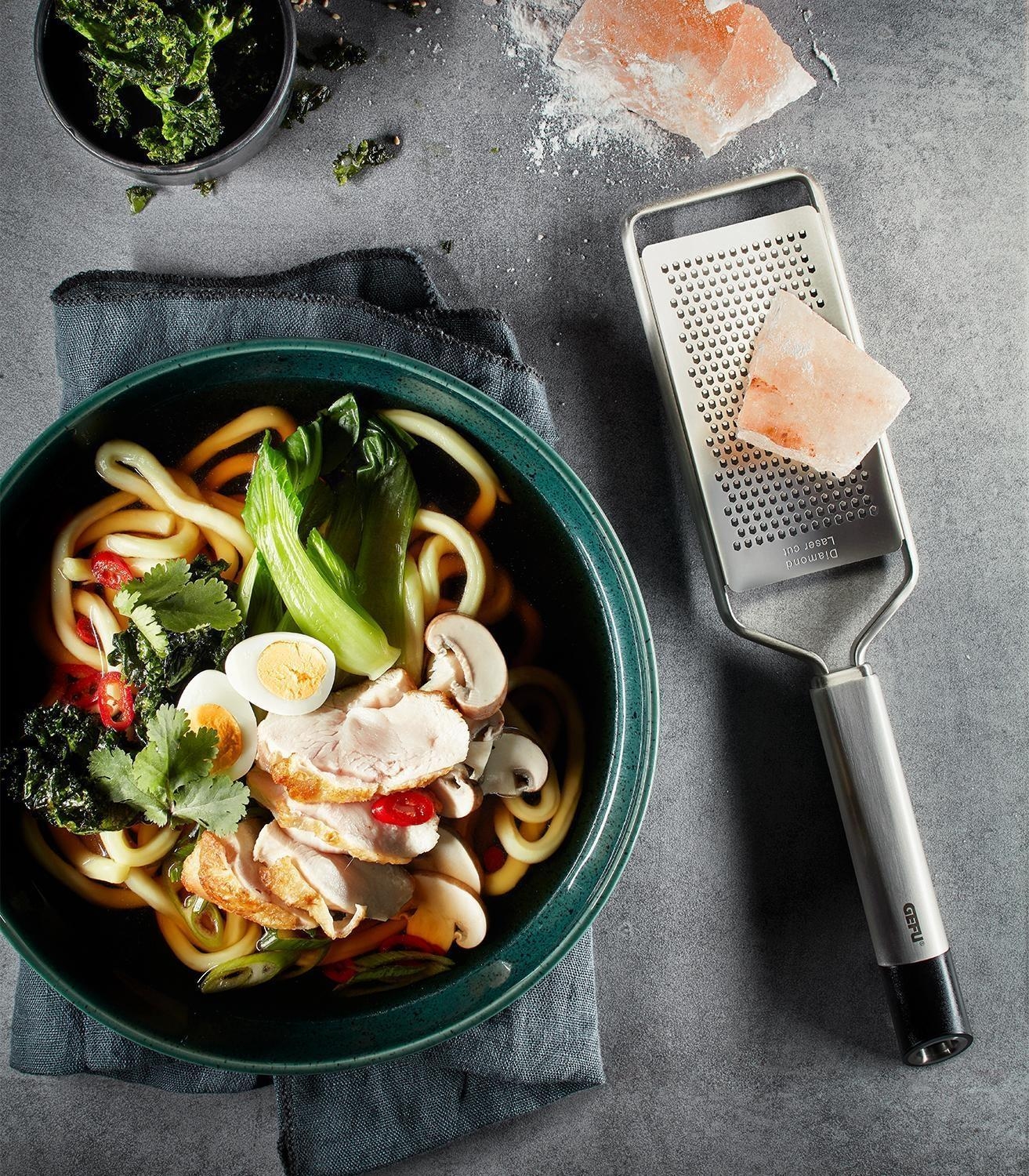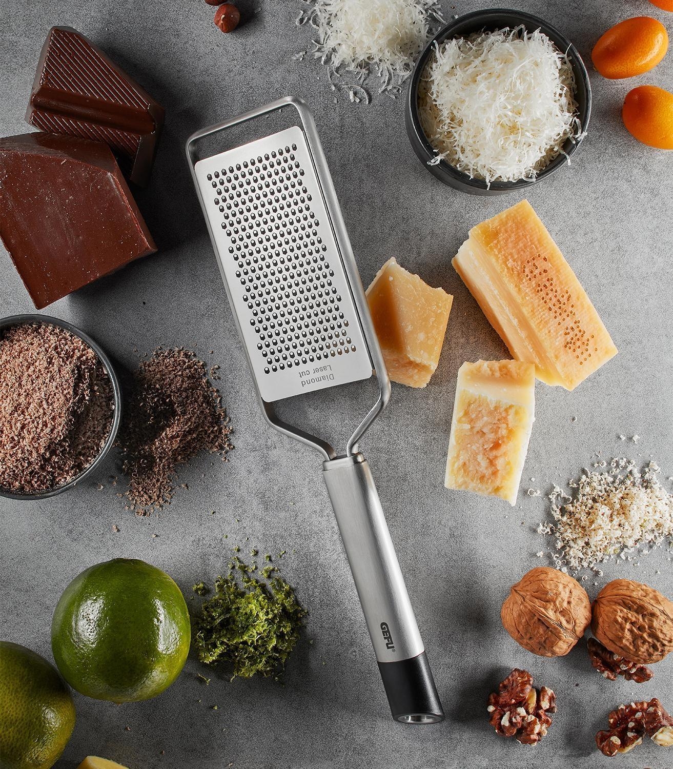 Die Feinreibe PRIMELINE von Gefu überzeugt mit einer Länge von 28 cm und einer robusten Reibfläche aus Edelstahl. Der ergonomisch geformte Griff besteht teilweise aus Kunststoff und liegt sicher in der Hand, während die innengewölbten Reibflächen ein besonders komfortables Arbeiten ermöglichen. Eine praktische Schutzkappe ist ebenfalls enthalten. Ideal zum feinen Reiben von Schokolade für Desserts oder Käse für Vor- und Hauptspeisen.