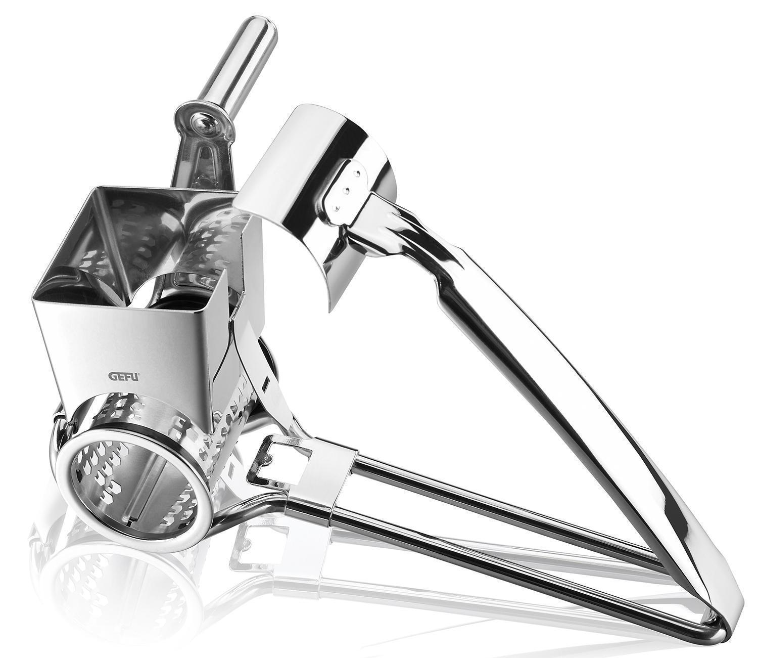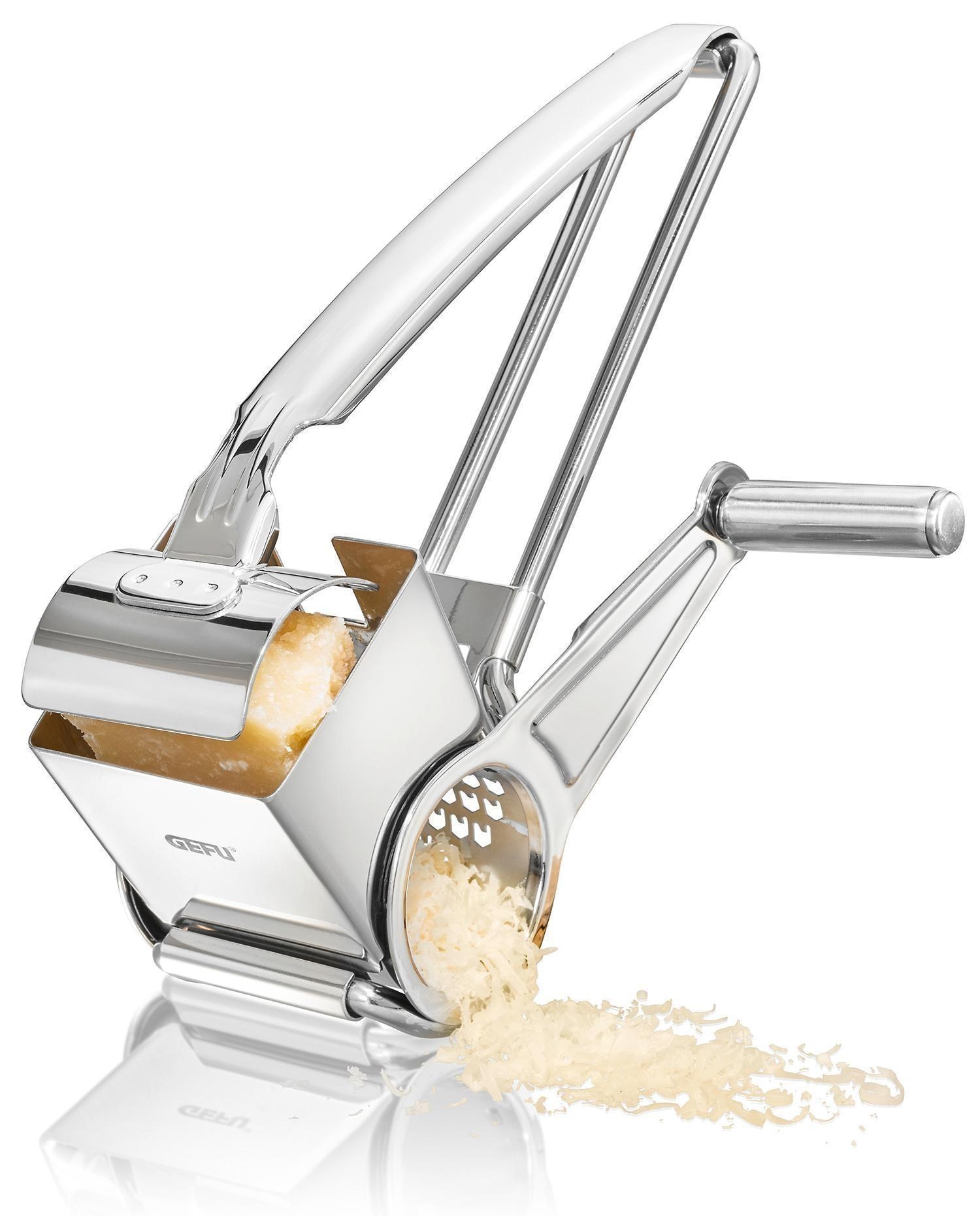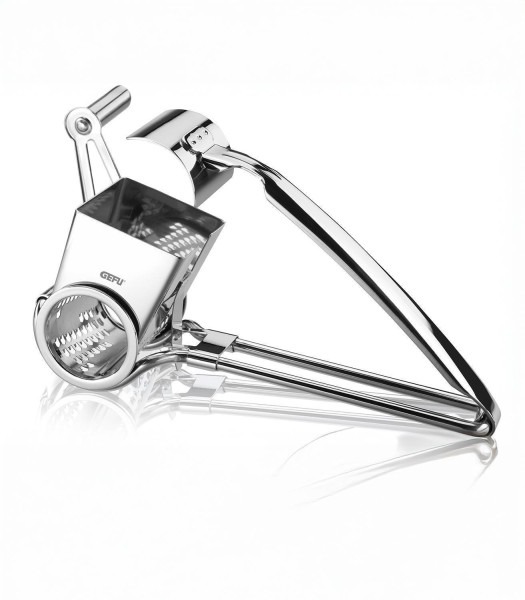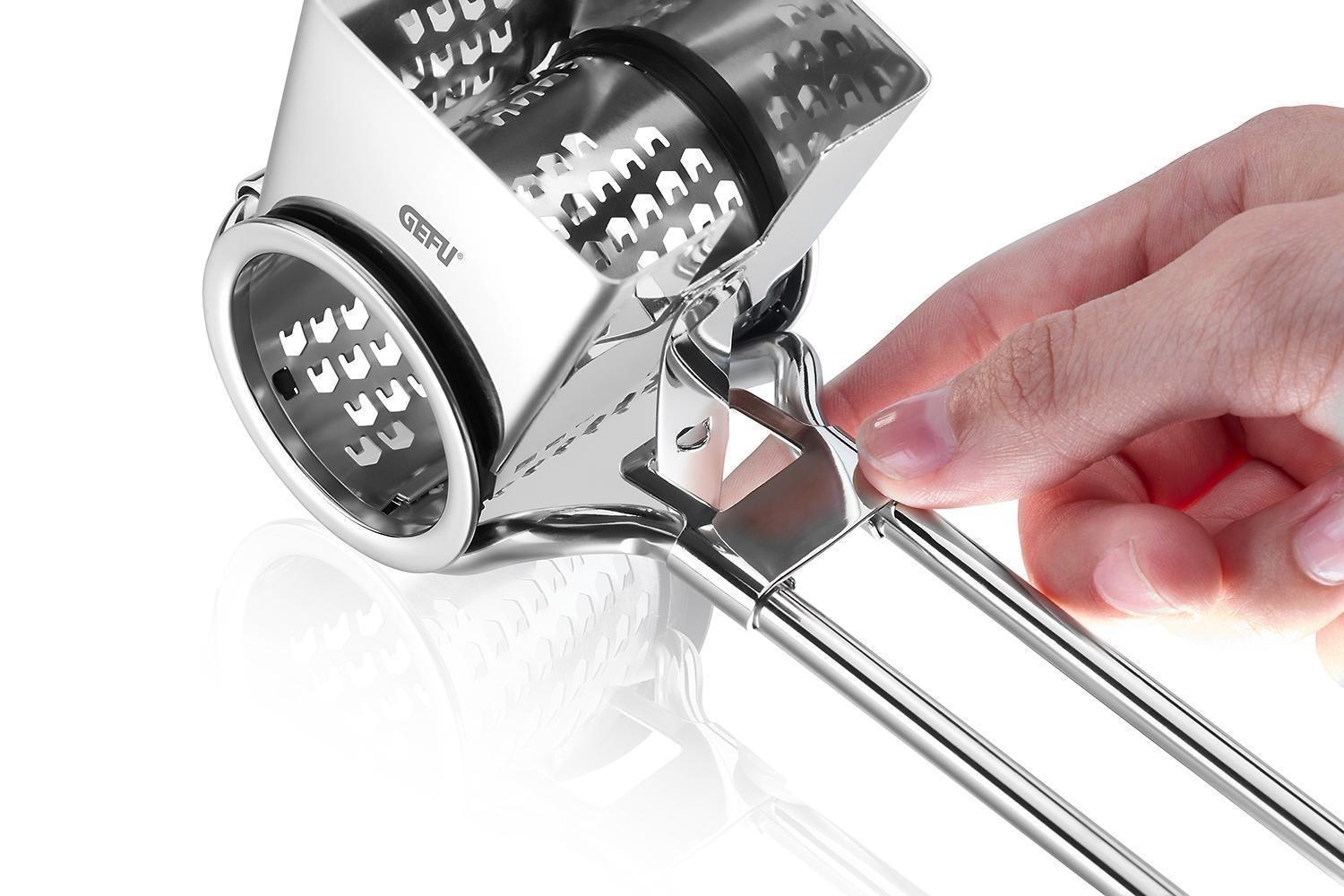 Die rotierende Reibe QUESO der Marke Gefu besteht aus Edelstahl und ist zum komfortablen Kurbeln ausgelegt. Sie hat eine Länge von 19,5 cm, eine Breite von 11,9 cm sowie eine Höhe von 7,8 cm.