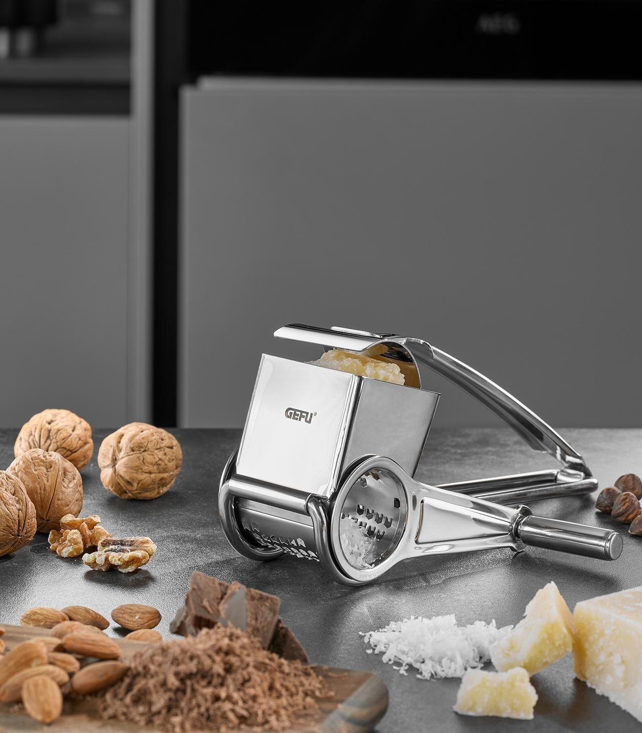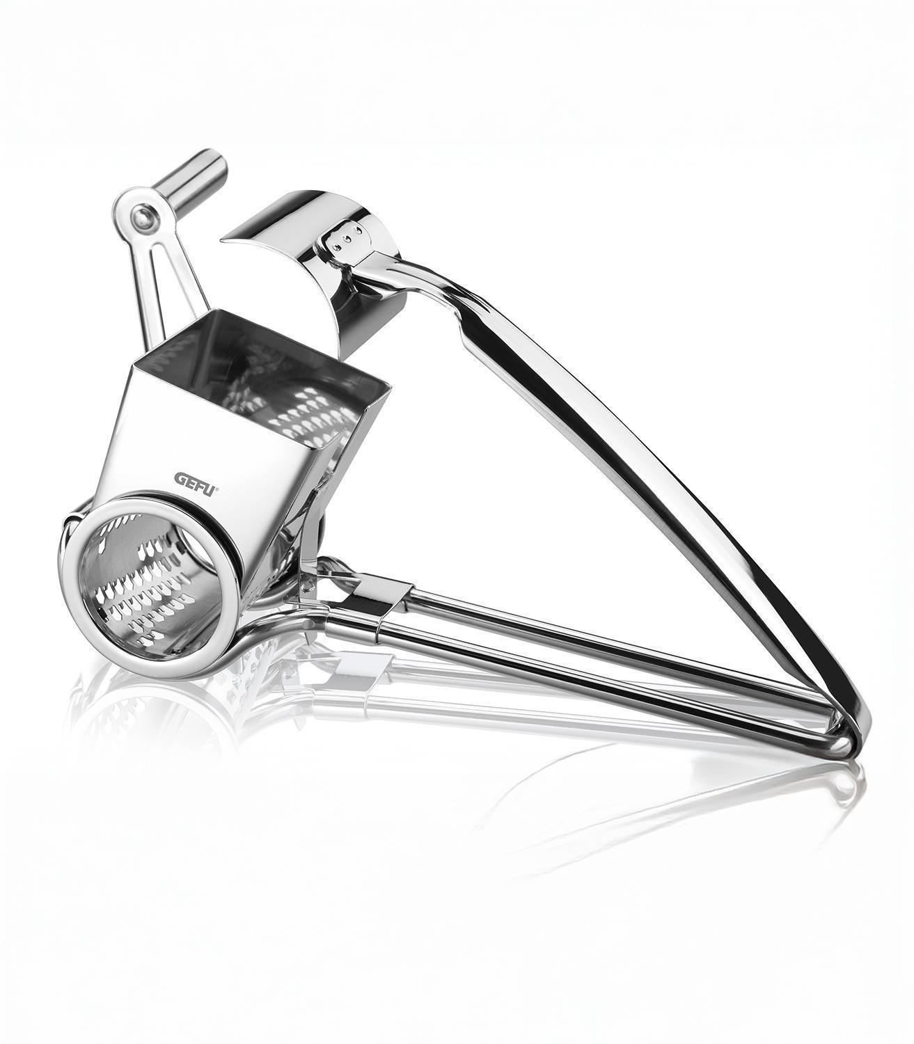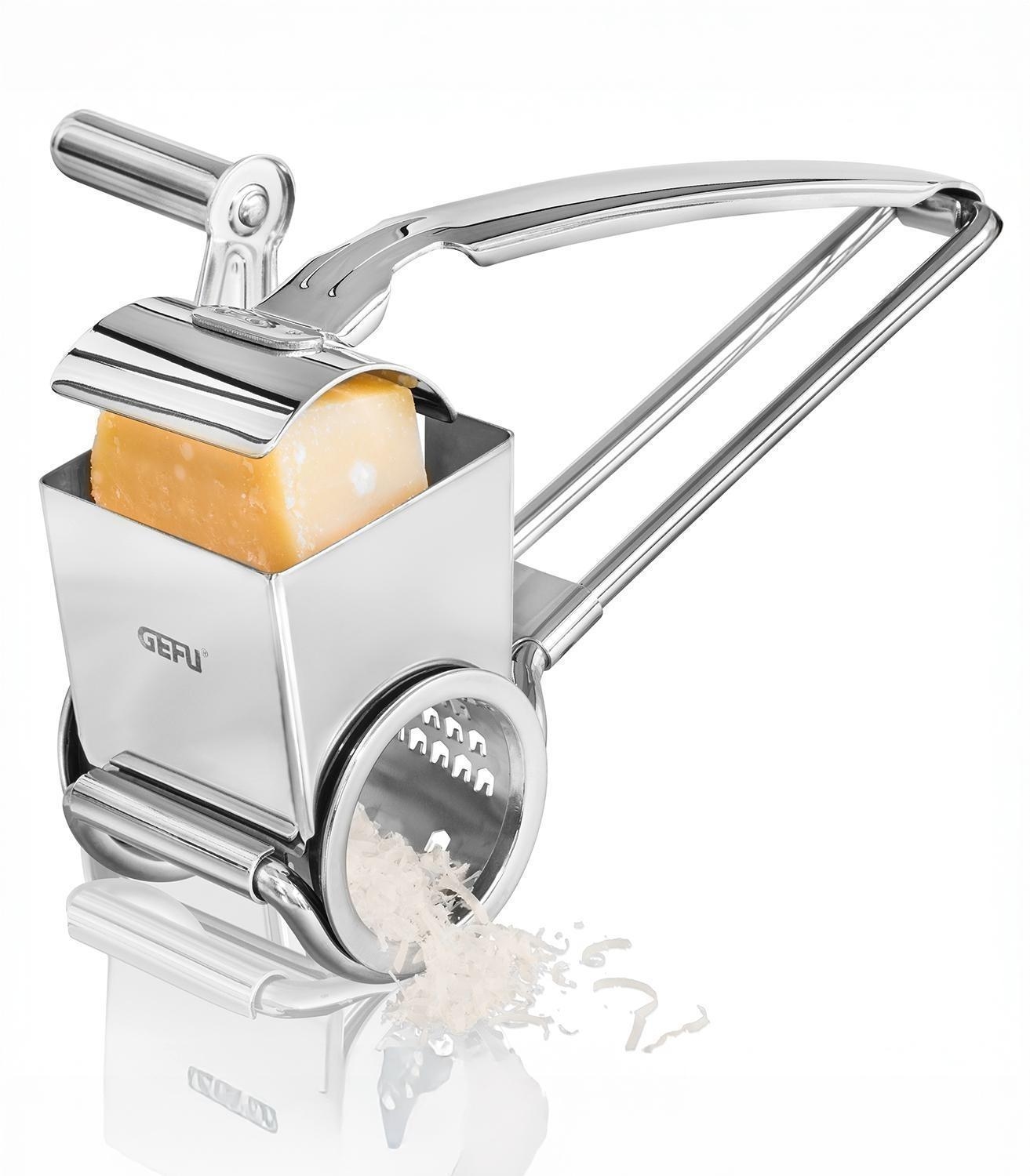 Die rotierende Reibe QUESO der Marke Gefu besteht aus Edelstahl und ist zum komfortablen Kurbeln ausgelegt. Sie hat eine Länge von 19,5 cm, eine Breite von 11,9 cm sowie eine Höhe von 7,8 cm.