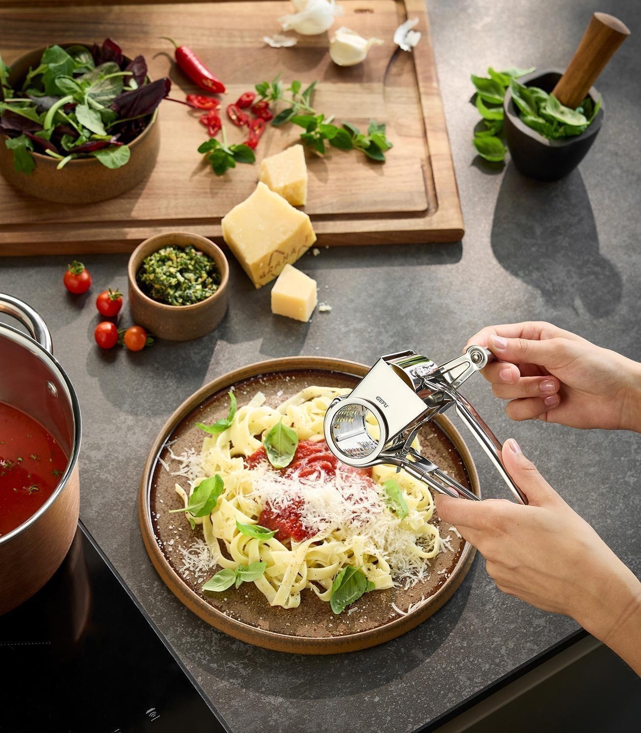 Ausgestattet ist die Reibe mit einer extrascharfen, feinen LASER CUT Reibtrommel, die sich ideal für Hartkäse, Schokolade oder Nüsse eignet. Durch einen leichten Umbau der Kurbel ist das Gerät sowohl für Rechts- als auch für Linkshänder verwendbar.