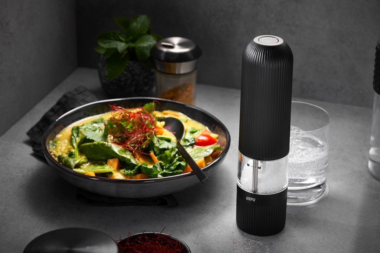 - mit Knopf zum elektrischen Mahlen der Gewürze