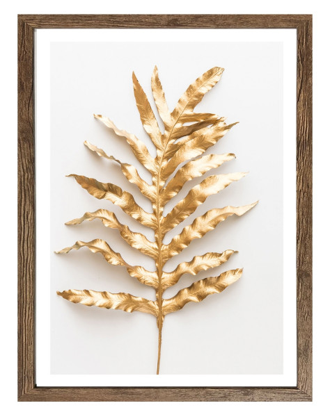 Das gerahmte Bild MALINAS ist ein stilvolles Wandbild in Goldgelb, das die Fotografie eines vergoldeten Zweiges zeigt. Mit den Maßen von 40 cm Breite und 50 cm Höhe bringt es einen Hauch von Eleganz in jeden Raum. Der braune MDF-Rahmen ergänzt den hochauflösenden Kunstdruck perfekt und betont das kunstvolle Motiv. Dieses Kunstwerk verleiht jedem Ambiente eine edle und raffinierte Note.