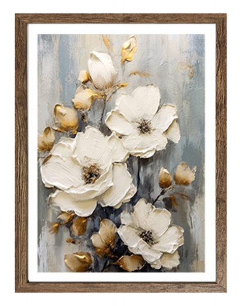 Das gerahmte Bild MALINAS ist ein elegantes Wandbild in Goldgelb, Grau und Weiß mit einem ansprechenden Blumenmotiv. Mit den Maßen von 40 cm Breite und 50 cm Höhe fügt es sich harmonisch in jedes Raumkonzept ein. Der braune MDF-Rahmen betont den hochauflösenden Kunstdruck und verleiht dem Bild eine stilvolle Note. Dieses Kunstwerk bringt eine subtile, natürliche Schönheit in jedes Zuhause.