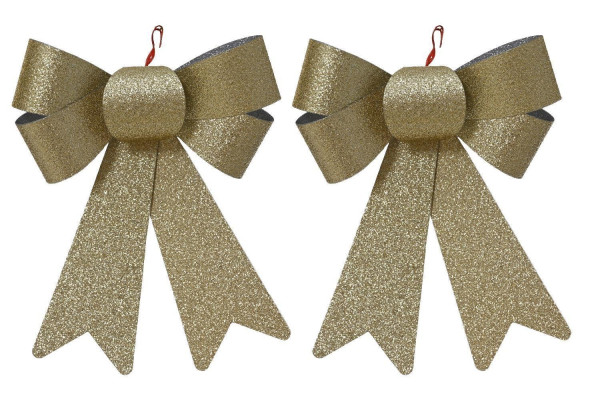 Das 2er Set Geschenk-Schleifen VENEZIA in Goldgelb setzt funkelnde Akzente auf jedem Geschenk. Jede Schleife misst 21 cm in der Breite und 29 cm in der Höhe und ist komplett mit Glitzer versehen, wodurch sie besonders festlich wirkt. Gefertigt aus robustem PVC-Kunststoff, lassen sich die Schleifen einfach platzieren und sorgen im Handumdrehen für eine stilvolle und strahlende Geschenkverpackung.
