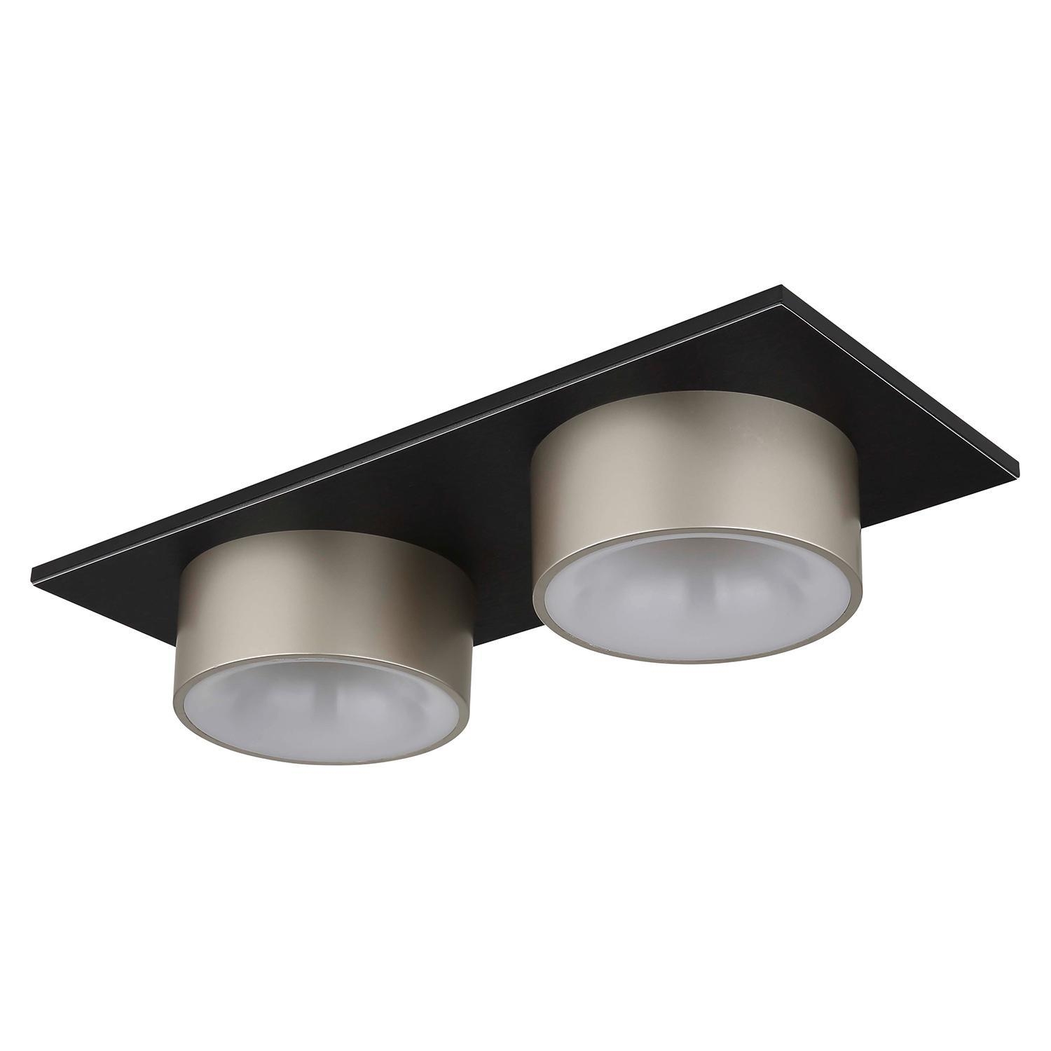 Die LED-Deckenleuchte RAYMOND von Globo Lighting ist aus schwarzem Metall gefertigt und mit zwei Lampenschirmen aus Kunststoff in Goldgelb ausgestattet. Sie hat eine Breite von 46 cm, eine Höhe von 11 cm und eine Tiefe von 20 cm. Die fest verbauten LED-Leuchtmittel verfügen über eine Leistung von ingesamt 24 Watt, erzeugen eine Lichtstärke von 1000 Lumen und bieten eine Farbtemperatur von 3000 Kelvin.