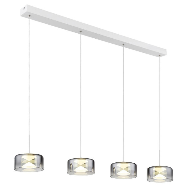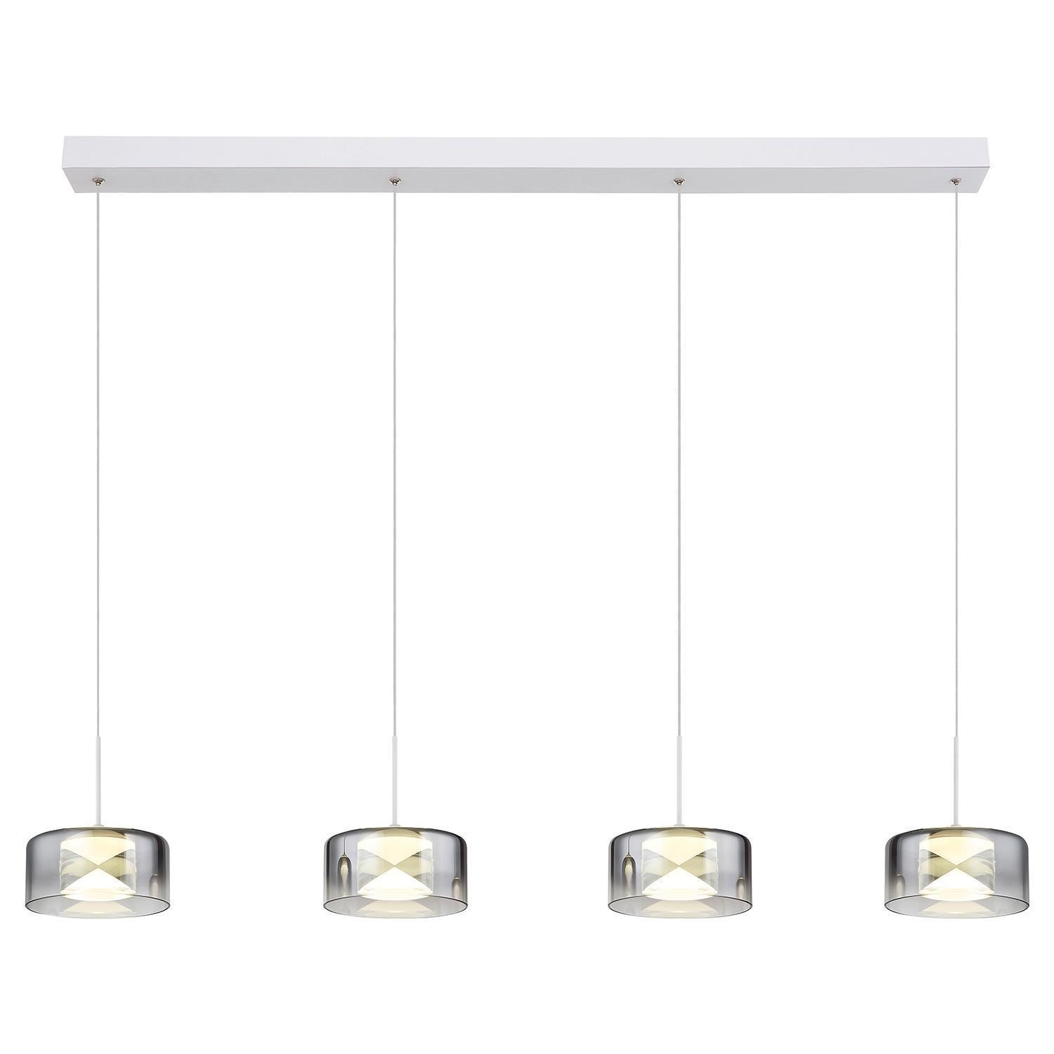 Die Pendelleuchte BELINDA der Marke Globo Lighting besteht aus Metall in Weiß matt und verfügt über Lampenschirme aus Glas in Rauchfarben. Die Lampenschirme sind individuell höhenverstellbar. Die Leuchte hat eine Breite von 105 cm, eine Höhe von 150 cm und eine Tiefe von 15 cm. Sie ist mit vier integrierten LED-Leuchtmitteln ausgestattet, die nicht austauschbar sind. Die Leistung beträgt 24 Watt, die Farbtemperatur liegt bei 4000 Kelvin und die Lichtstärke beträgt 2900 Lumen.