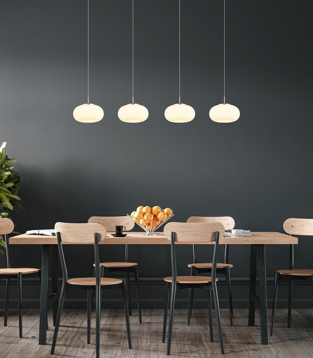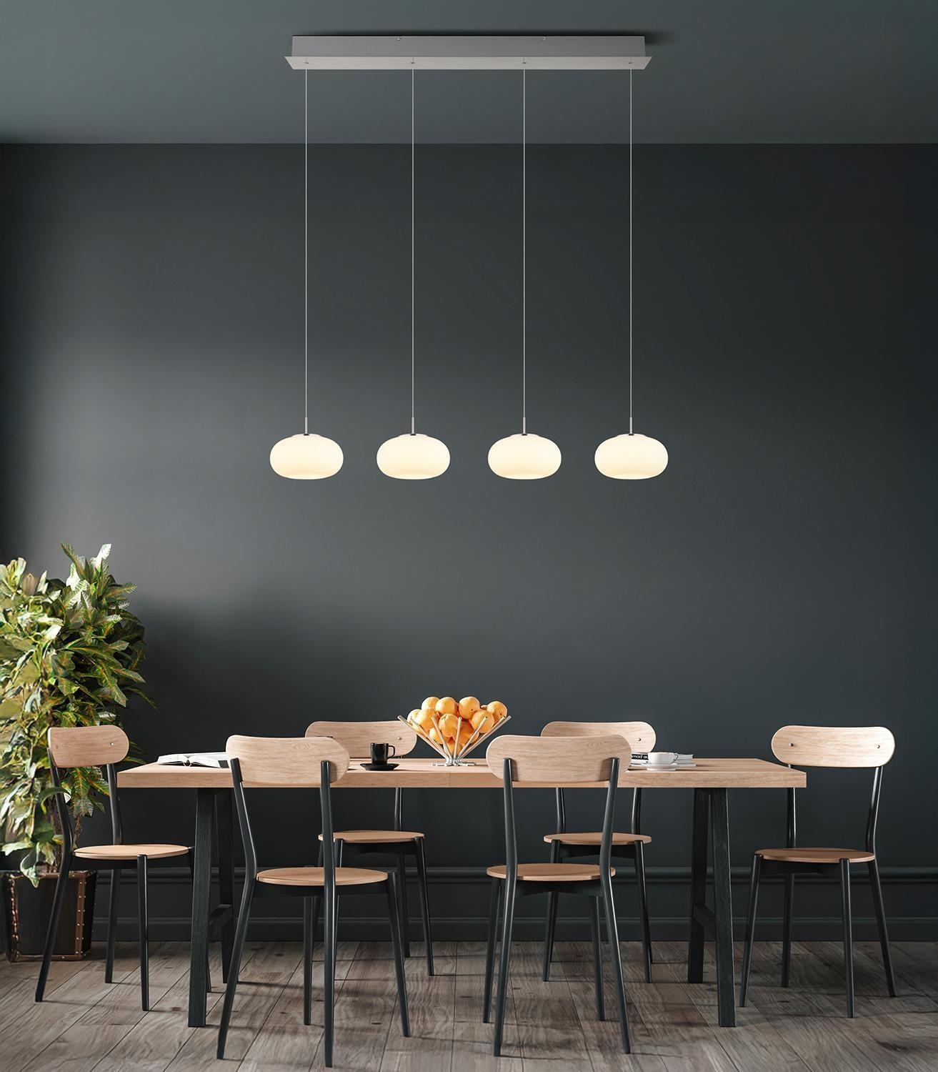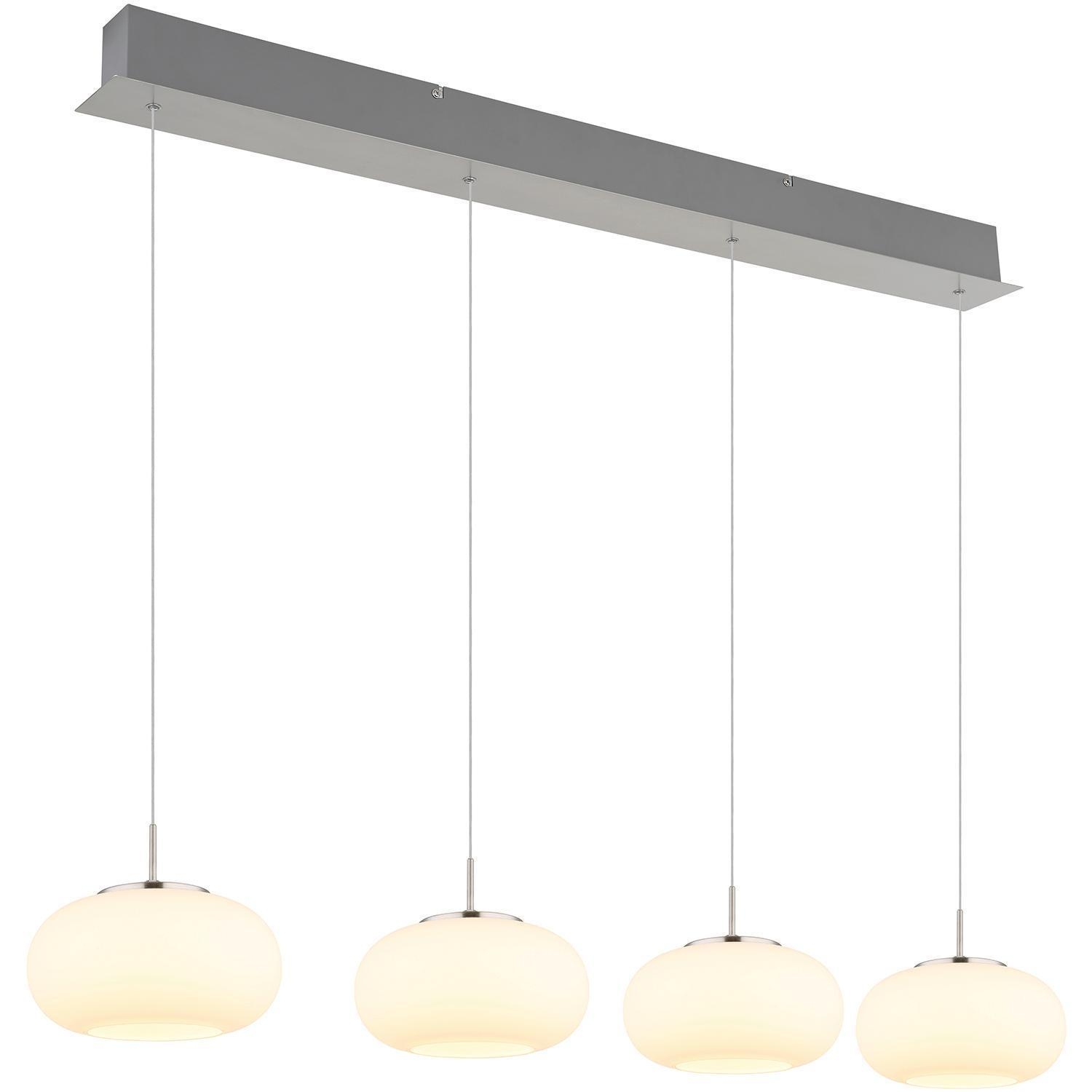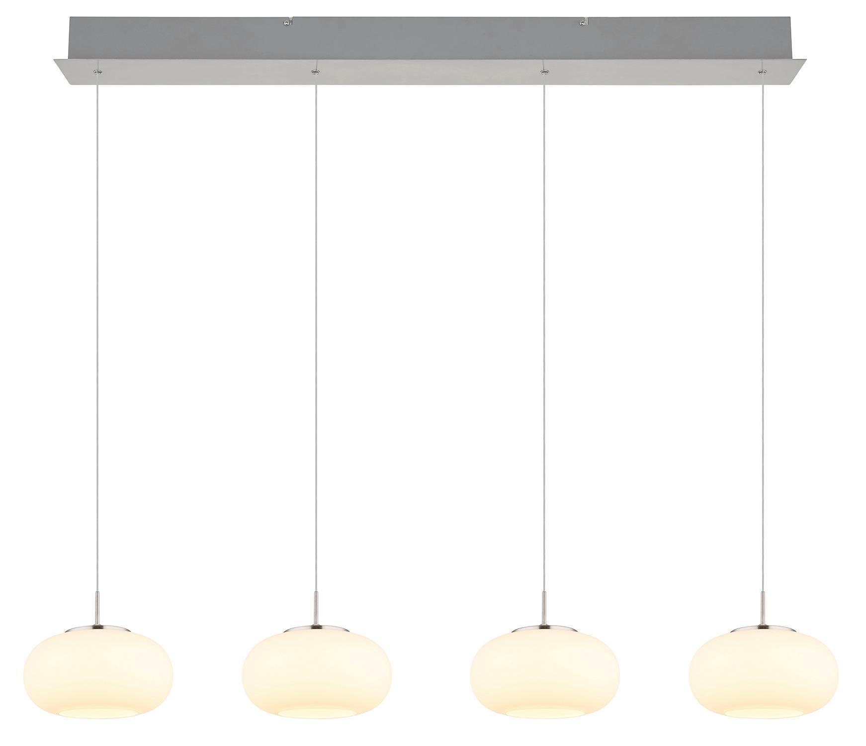 Die LED-Pendelleuchte QUINTARA der Marke Globo Lighting besteht aus Metall in Nickelfarben und ist mit Lampenschirmen aus weißem Opalglas ausgestattet. Die Schirme sind in der Höhe von 80 bis 150 cm verstellbar und ermöglichen dadurch eine flexible Anpassung. Die Leuchte hat eine Breite von 110 cm, eine Höhe von 150 cm sowie eine Tiefe von 20 cm. Verbaut sind vier nicht austauschbare LED-Leuchtmittel, die im Lieferumfang enthalten sind. Mit einer Leistung von 24 Watt erzeugen sie eine warmweiße Lichtfarbe von 3000 Kelvin und eine Helligkeit von 2000 Lumen.