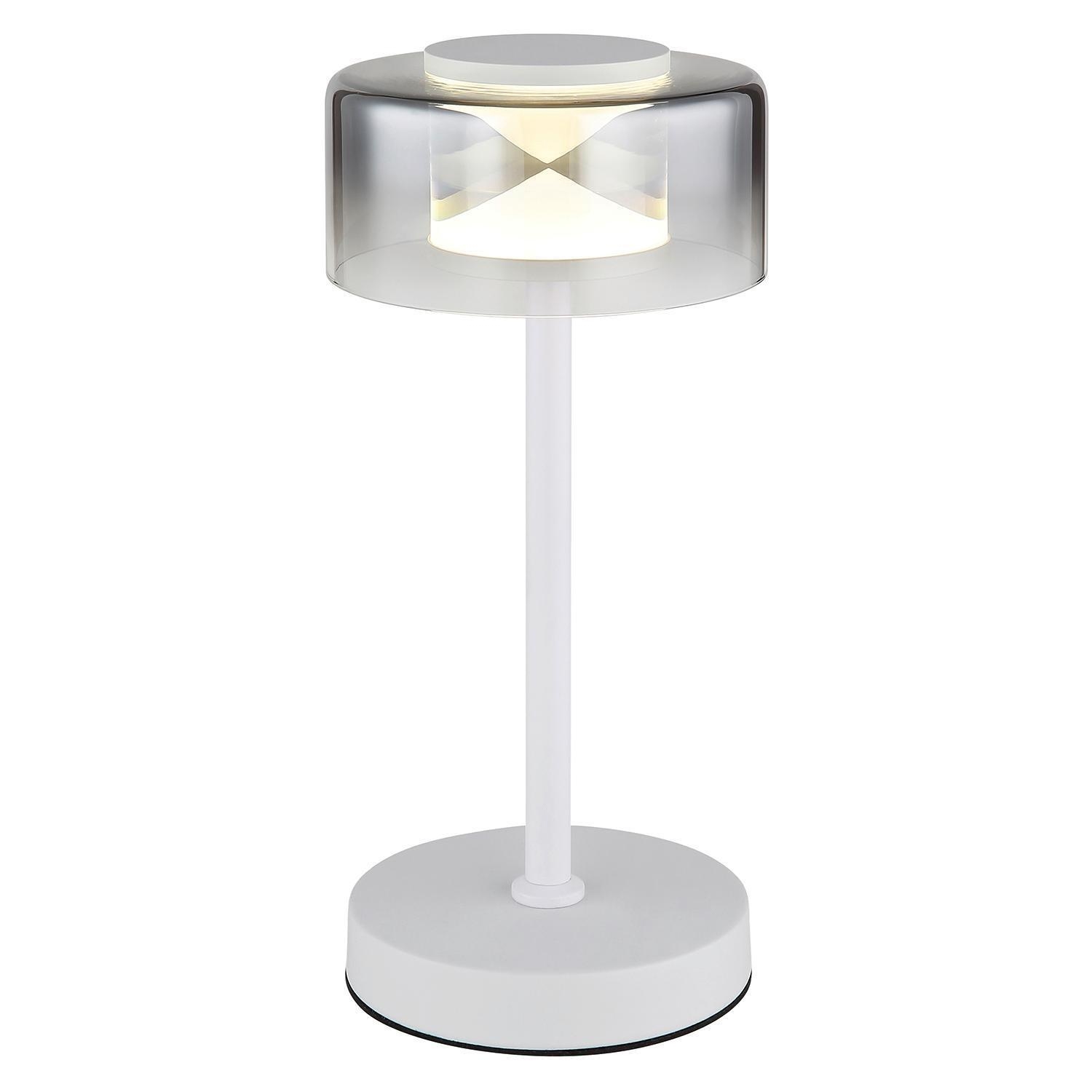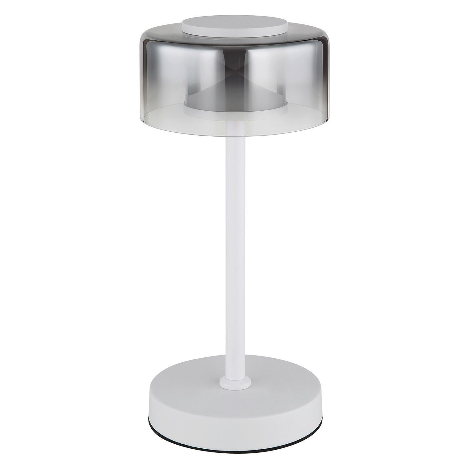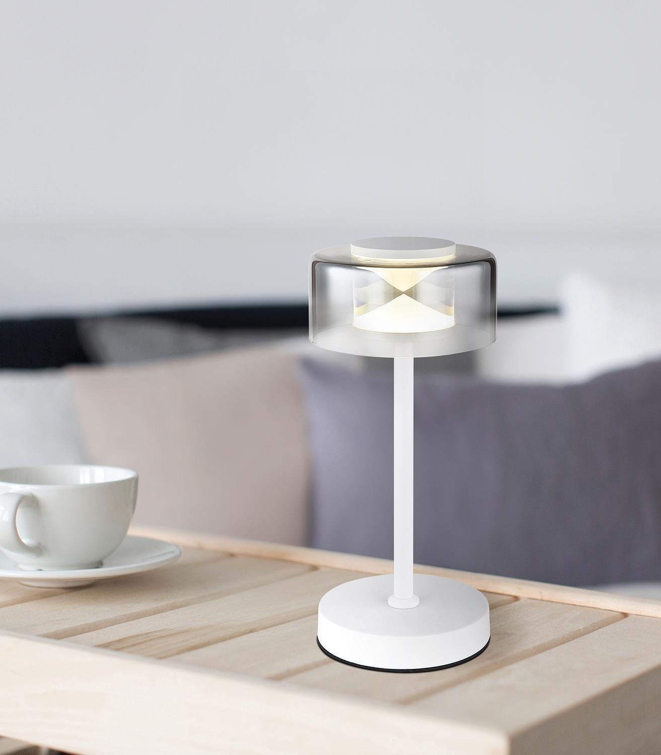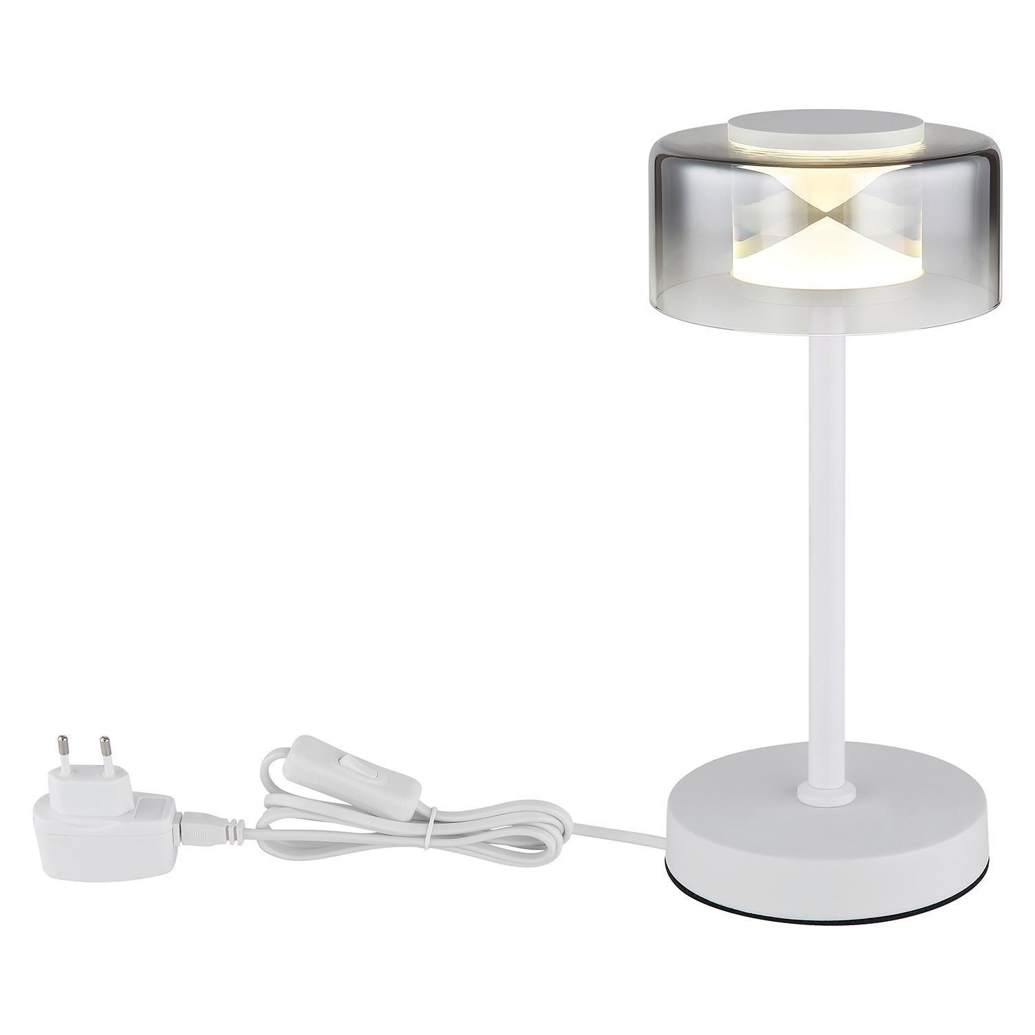 Die LED-Tischlampe BELINDA der Marke Globo Lighting besteht aus einem Metallgestell in Weiß matt und einem Lampenschirm aus rauchfarbenem Glas. Sie hat einen Durchmesser von 15 cm und eine Höhe von 32,5 cm. Ausgestattet ist sie mit einem fest verbauten LED-Leuchtmittel, das im Lieferumfang enthalten ist und nicht ausgetauscht werden kann. Die Leistung beträgt 6 Watt bei einer Farbtemperatur von 4000 Kelvin und einer Lichtstärke von 740 Lumen.