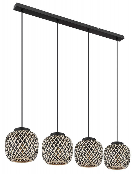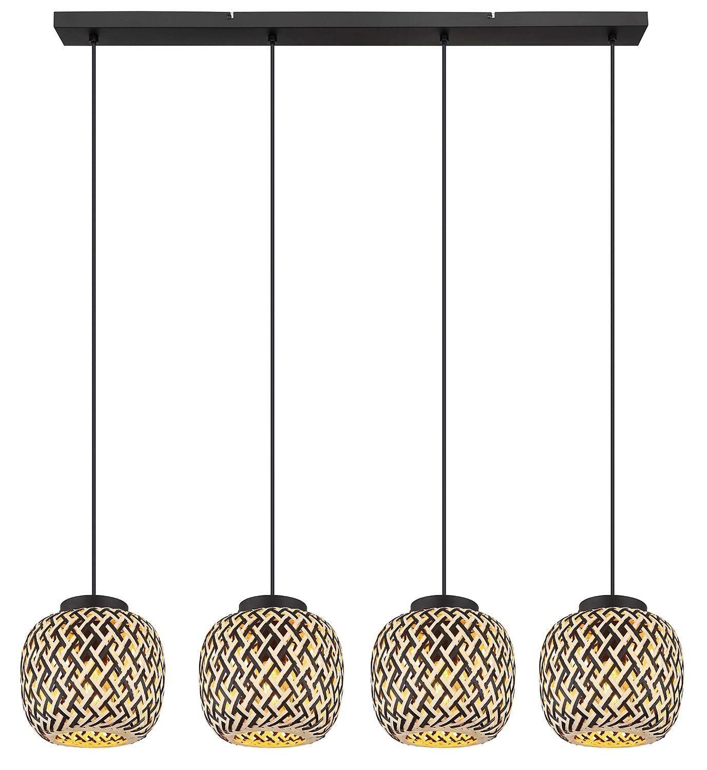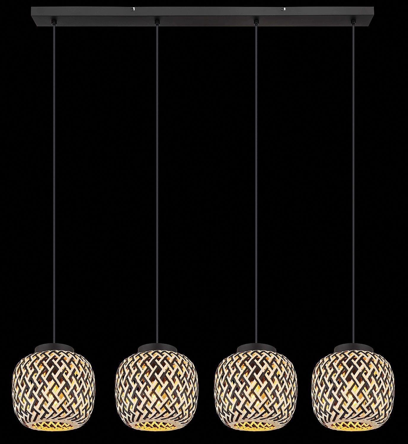 Die Pendelleuchte COLLY der Marke Globo Lighting besteht aus Metall in Schwarz und besitzt Lampenschirme aus Bambusholz in Braun und Schwarz. Sie hat eine Breite von 100 cm, eine Höhe von 120 cm und eine Tiefe von 20 cm. Die Leuchte bietet Platz für vier Leuchtmittel, die nicht im Lieferumfang enthalten sind, jedoch austauschbar sind. Sie ist für E27-Leuchtmittel geeignet und unterstützt eine maximale Leistung von bis zu 15 Watt.