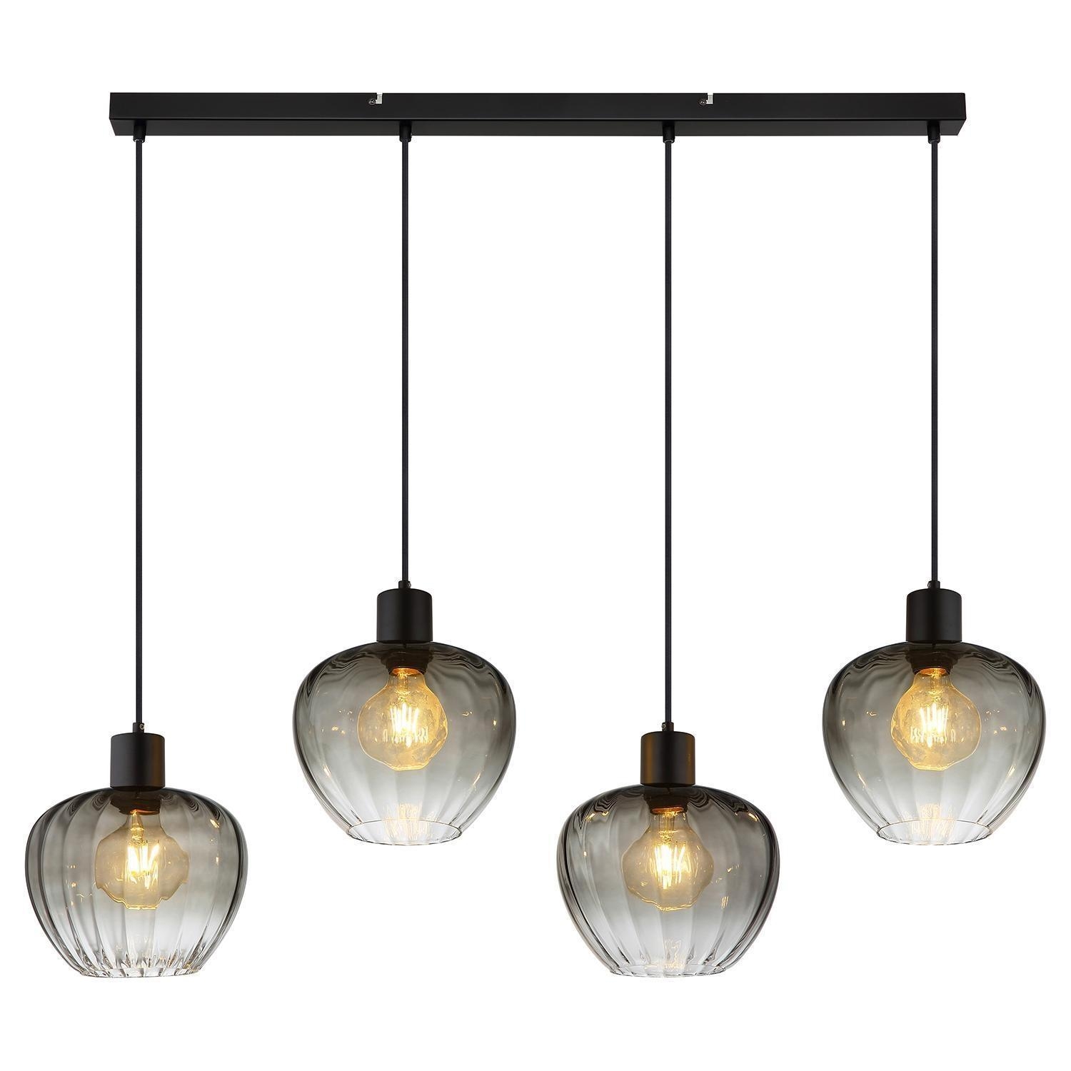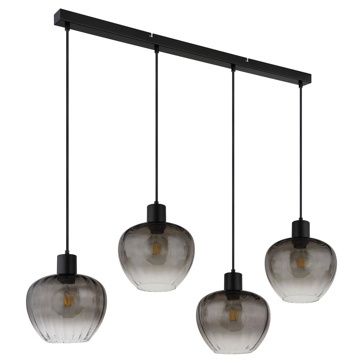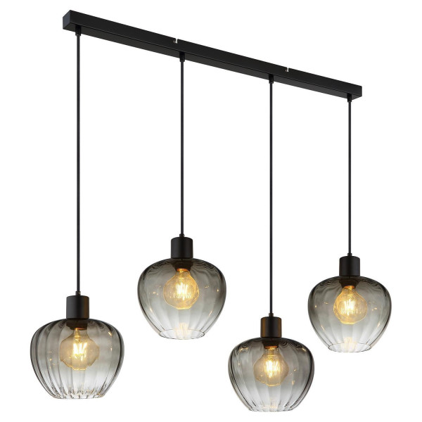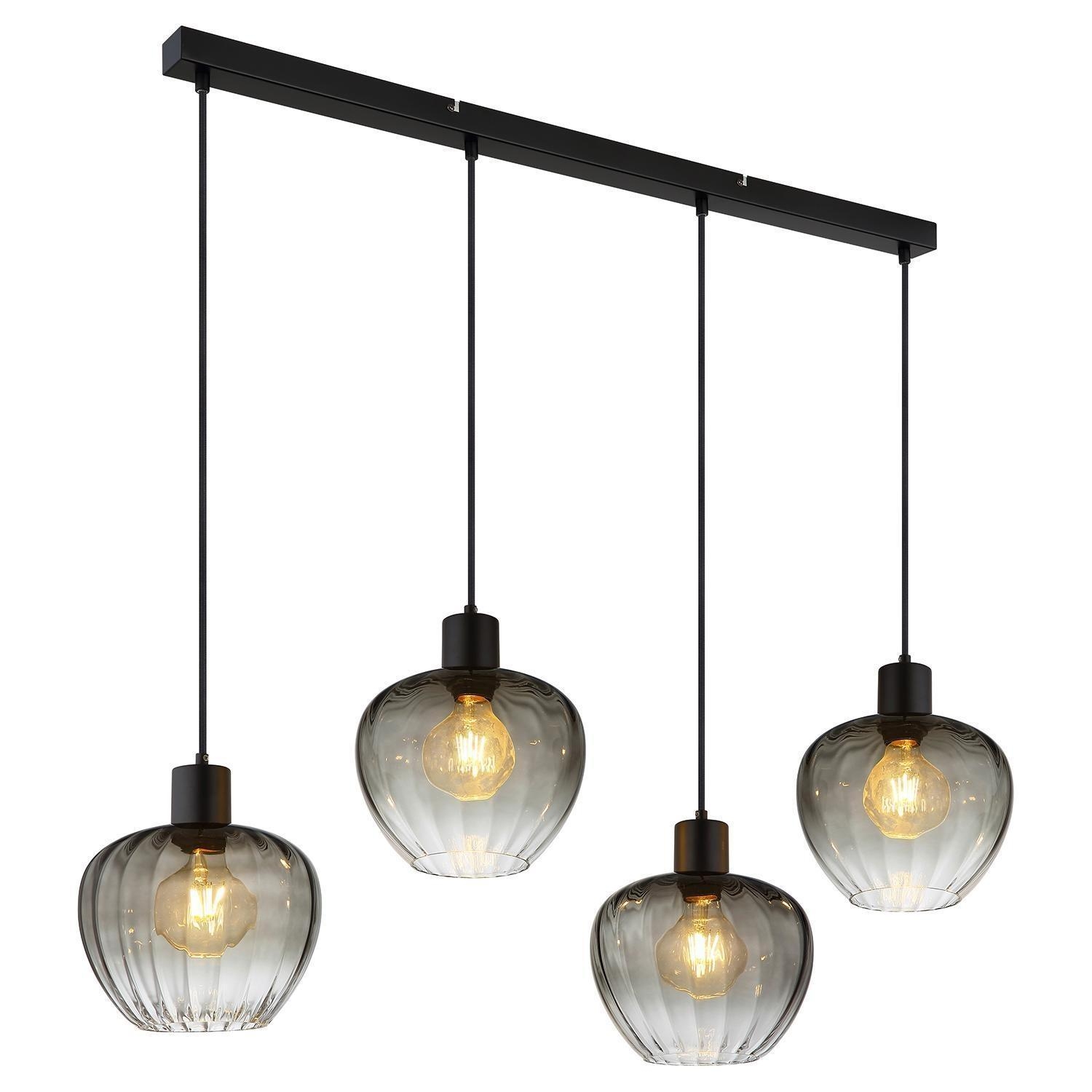 Die Pendelleuchte TOY von der Marke Globo Lighting kombiniert ein Gehäuse aus schwarzem Metall mit vier Lampenschirmen aus rauchfarbenem Glas. Die Glasschirme weisen zudem eine strukturierte Rillenoptik auf. Das Modell besitzt eine Breite von 108 cm, eine Tiefe von 24 cm und erreicht eine Höhe von 120 cm. Für den Betrieb sind vier Leuchtmittel erforderlich, die nicht im Lieferumfang enthalten sind. Diese müssen den Typ E27 aufweisen, sind austauschbar und dürfen eine maximale Leistung von 60 Watt pro Fassung nicht überschreiten.