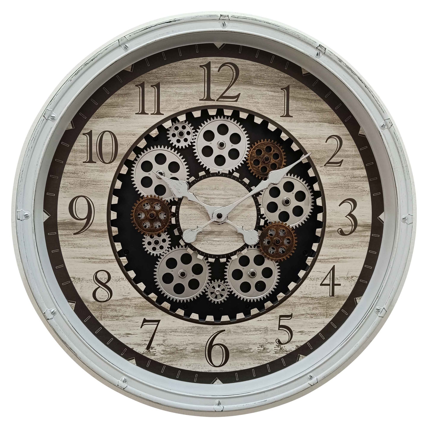 Die Wanduhr BELIA von Globo Lighting kombiniert Stil und Funktionalität. In den Farben Weiß, Schwarz und Braun gehalten, hat sie einen Durchmesser von 51 cm und besteht aus Kunststoff. Ihr numerisches Ziffernblatt und die bewegten Zahnräder verleihen ihr einen charmanten Look, der jeden Raum bereichert.