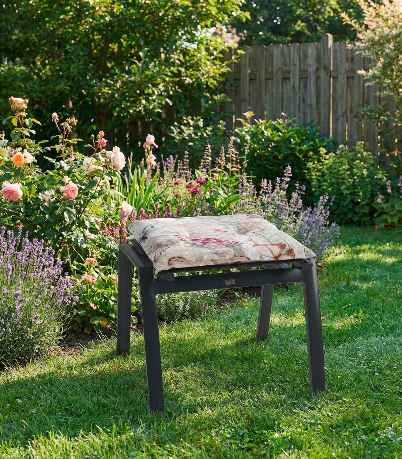 Die Hockerauflage ANSBERT der Marke GO-DE ist in Beige gestaltet und mit einem Schmetterlingsmuster versehen. Diese Sitzauflage weist eine Länge von 50 cm, eine Breite von 50 cm sowie eine Höhe von 6 cm auf. Die Materialzusammensetzung dieser Polsterauflage besteht zu 50 % aus Baumwolle und zu 50 % aus Polyester. Die Fertigung erfolgt in Deutschland. Für die Pflege dieses Gartenmöbel-Zubehörs wird Handwäsche empfohlen.