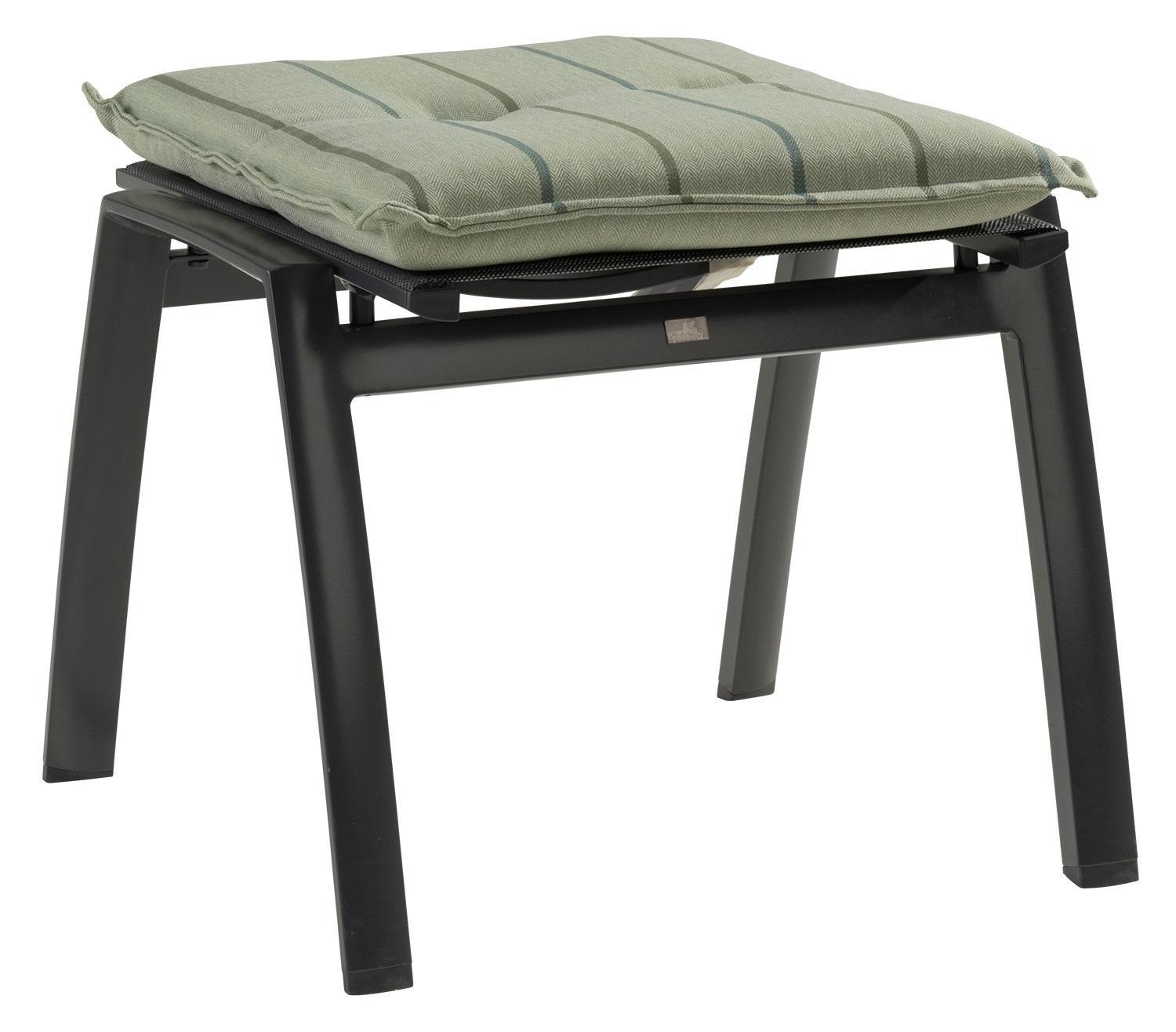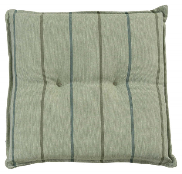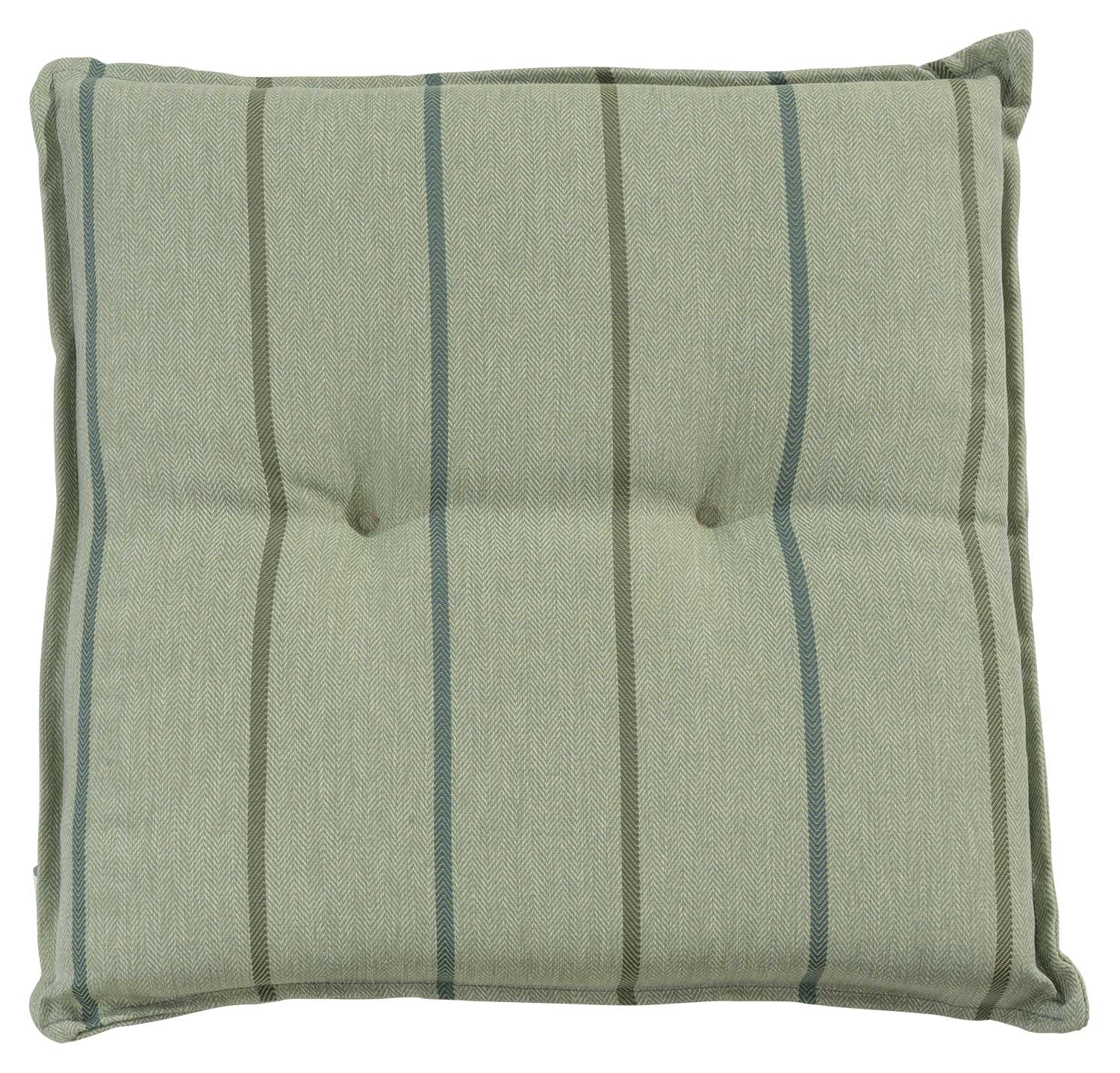 Die Wende-Gartenhockerauflage ist auf der Vorderseite hellgrün mit grauen Streifen und auf der Rückseite hellgrün unifarben. Der Bezugsstoff besteht aus Olefin, hat eine hohe Lichtechtheit, ermöglicht eine einfache Reinigung und ist antibakteriell, sowie schmutz- und wasserabweisend. Der Bezug ist nicht abnehmbar und kann per Hand gereinigt werden.