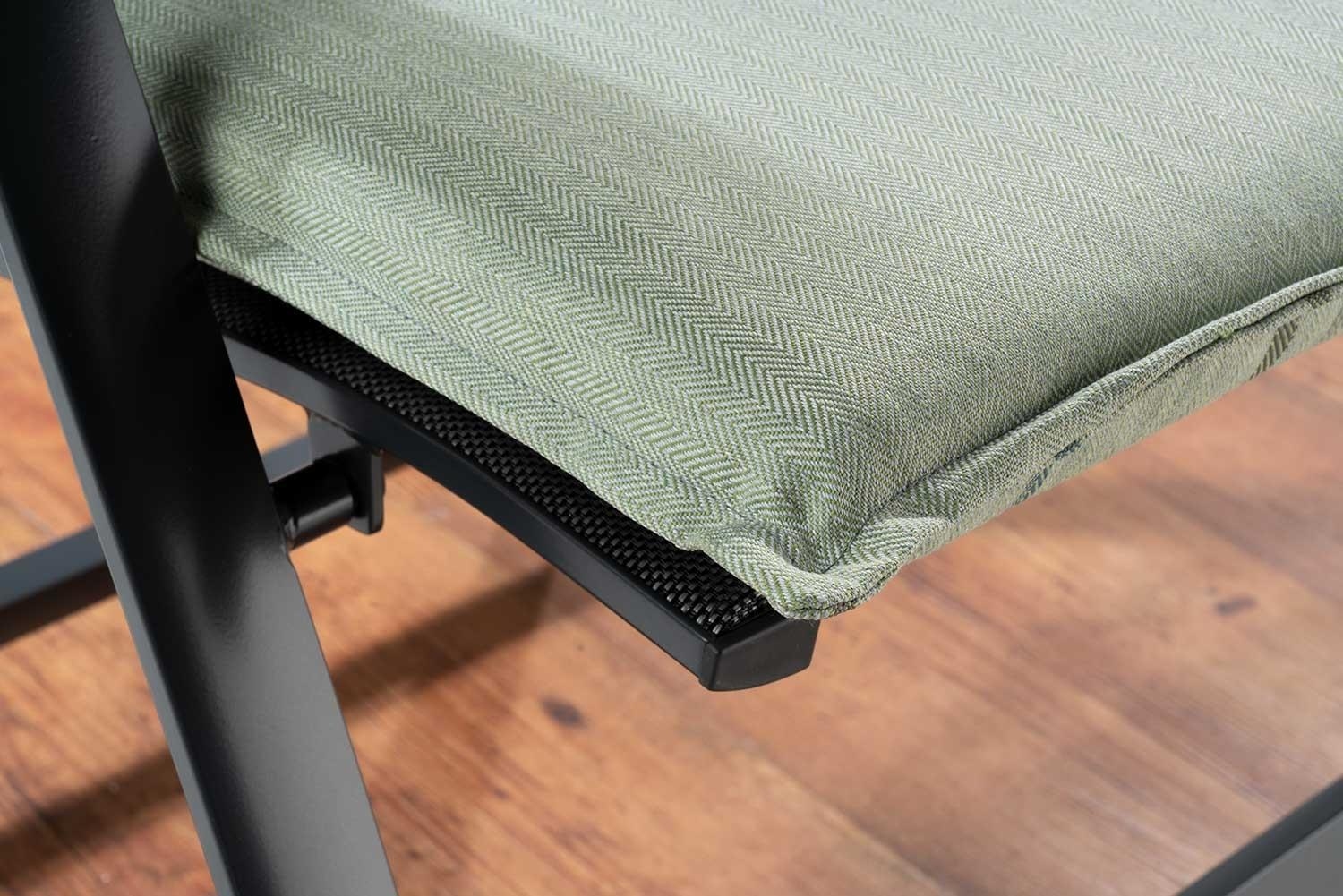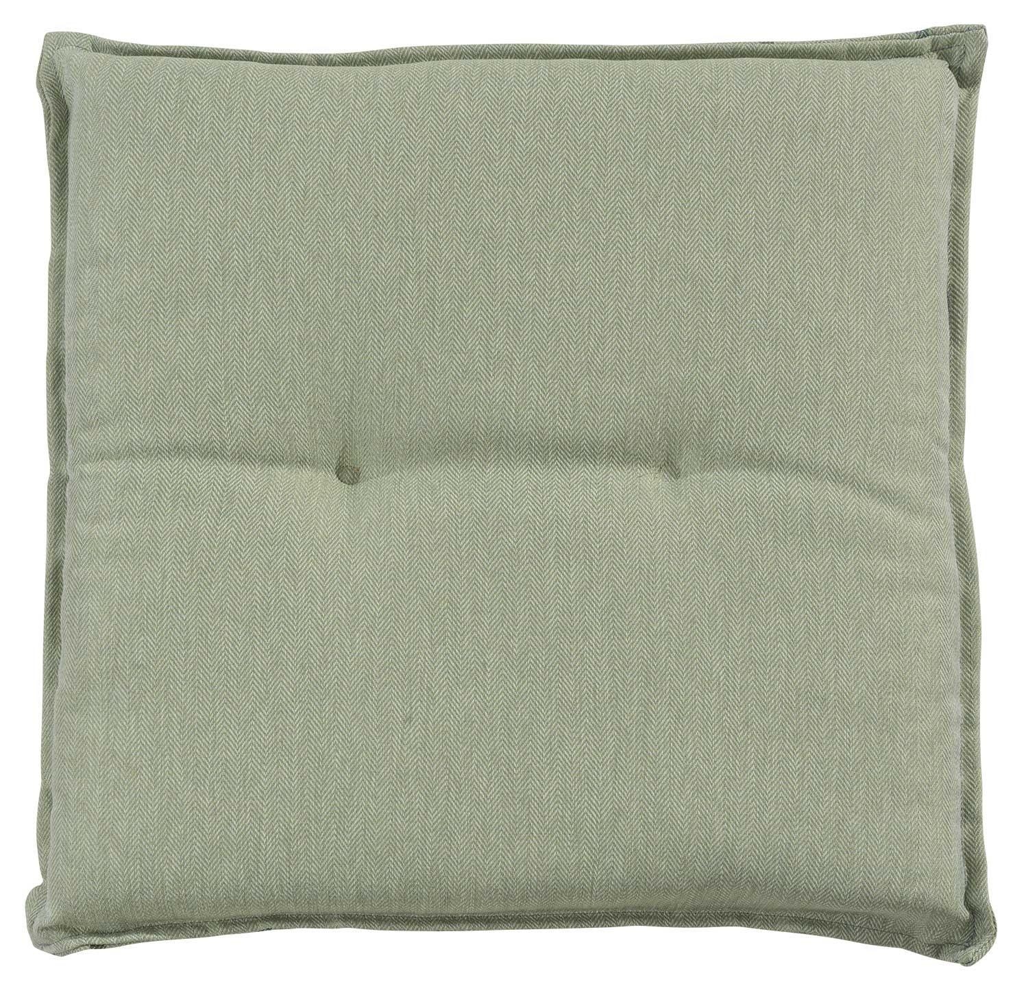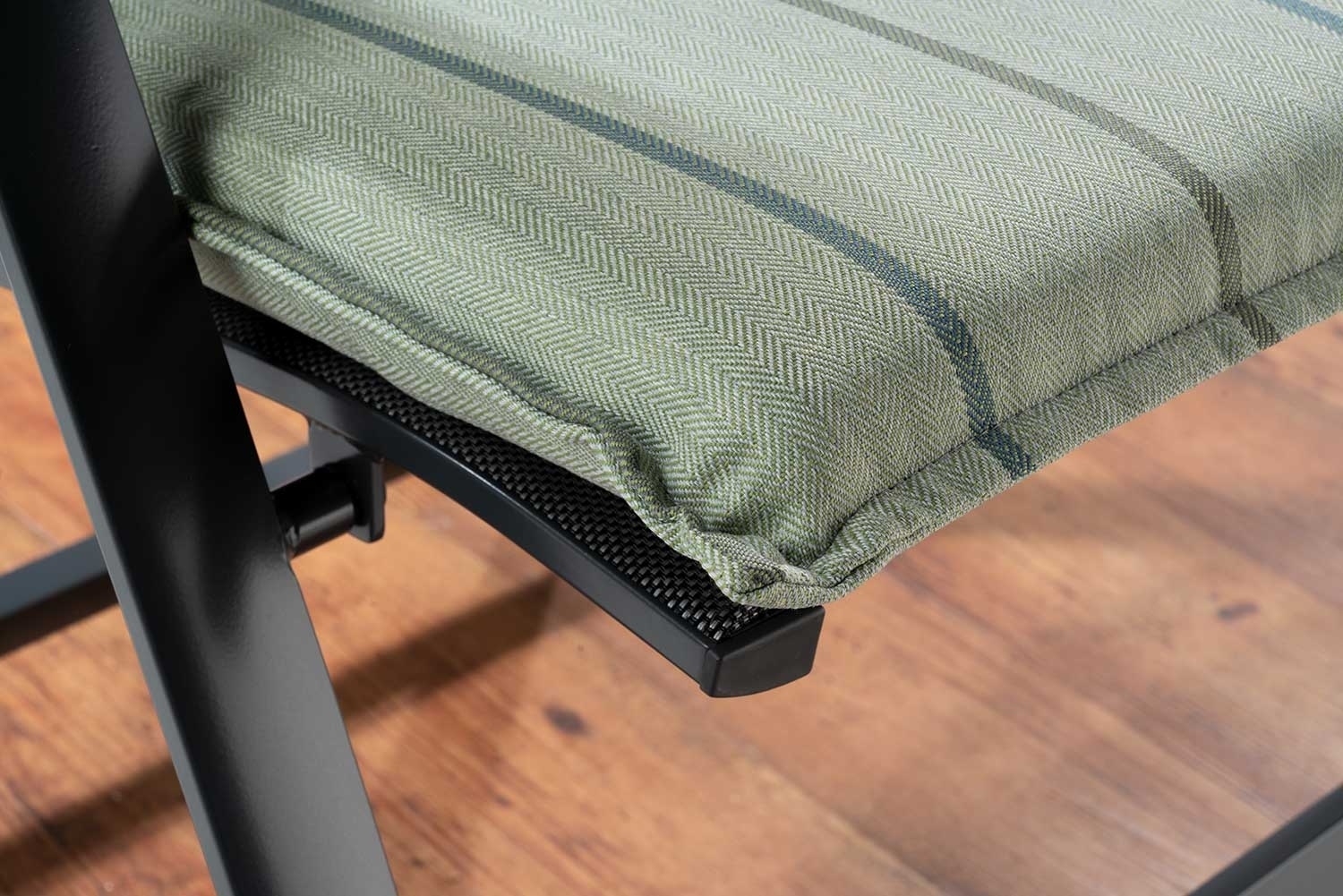 Die Wende-Gartenhockerauflage ist auf der Vorderseite hellgrün mit grauen Streifen und auf der Rückseite hellgrün unifarben. Der Bezugsstoff besteht aus Olefin, hat eine hohe Lichtechtheit, ermöglicht eine einfache Reinigung und ist antibakteriell, sowie schmutz- und wasserabweisend. Der Bezug ist nicht abnehmbar und kann per Hand gereinigt werden.