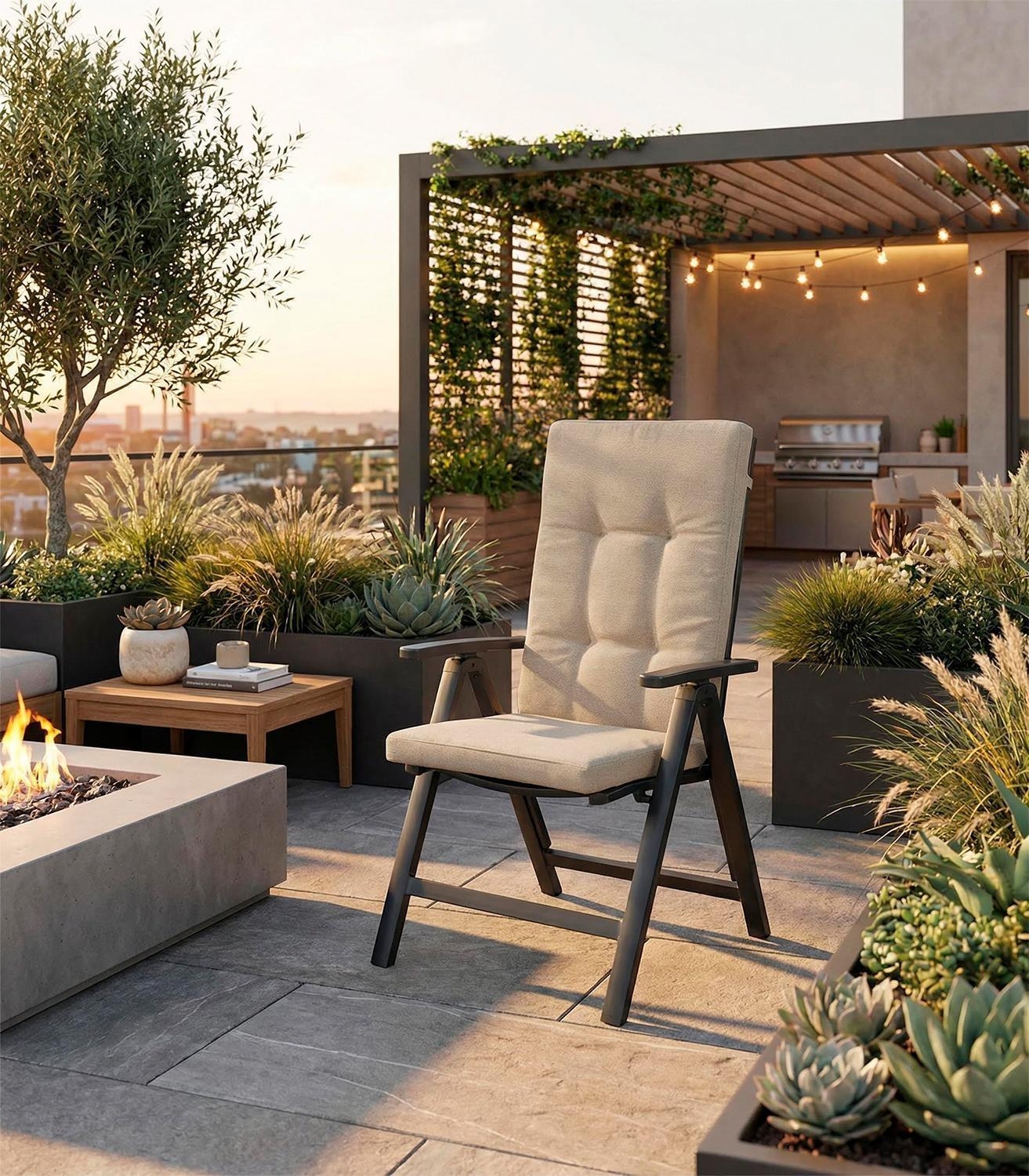 Die Gartenstuhlauflage CULLEN von GO-DE in beigefarbener Bouclé-Optik vereint Komfort und Funktionalität. Mit einer Größe von 50 x 120 cm ist sie ideal für Hochlehner geeignet. Der Bezug aus Polypropylen Olefin ist schmutz- und wasserabweisend, antibakteriell sowie besonders lichtecht. Seitliche Bindekordeln und ein verstellbares Gurtband sorgen für sicheren Halt. Knopfsteppung und 2 cm Stehsaum runden das Design ab. Made in Germany, Handwäsche empfohlen.