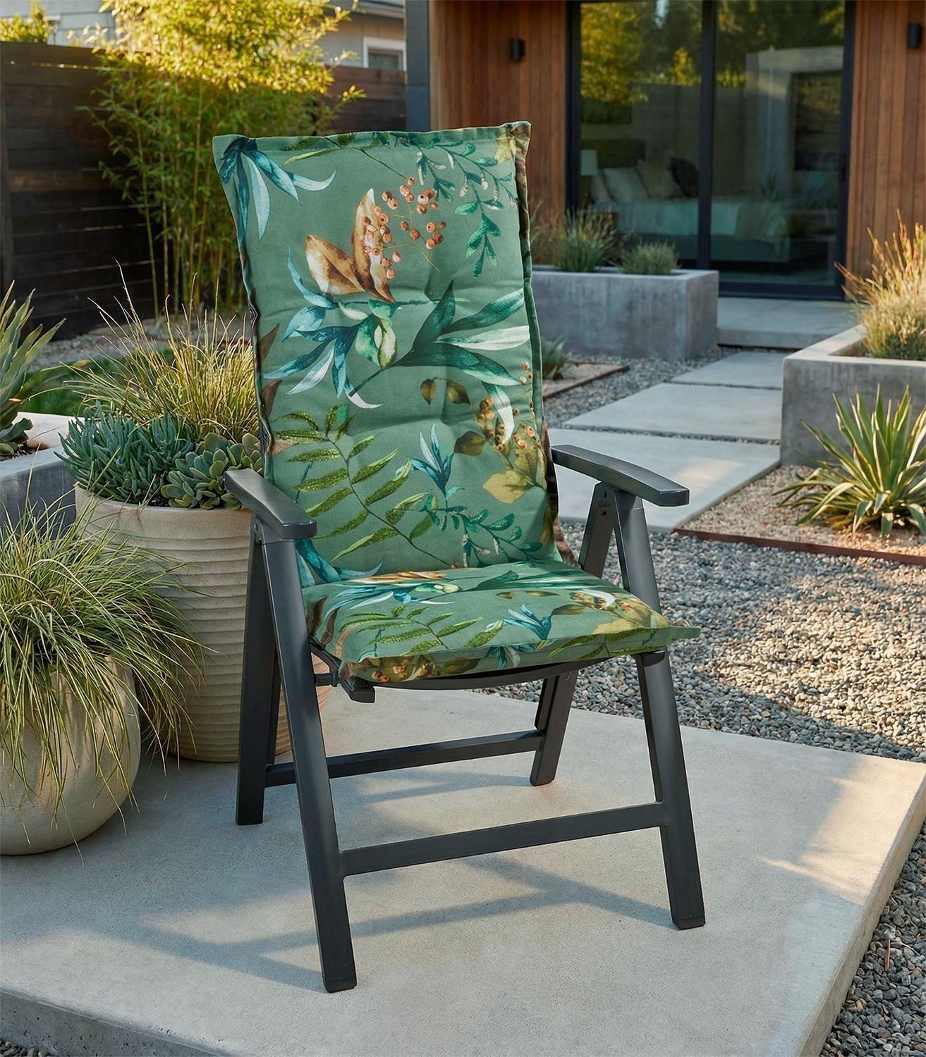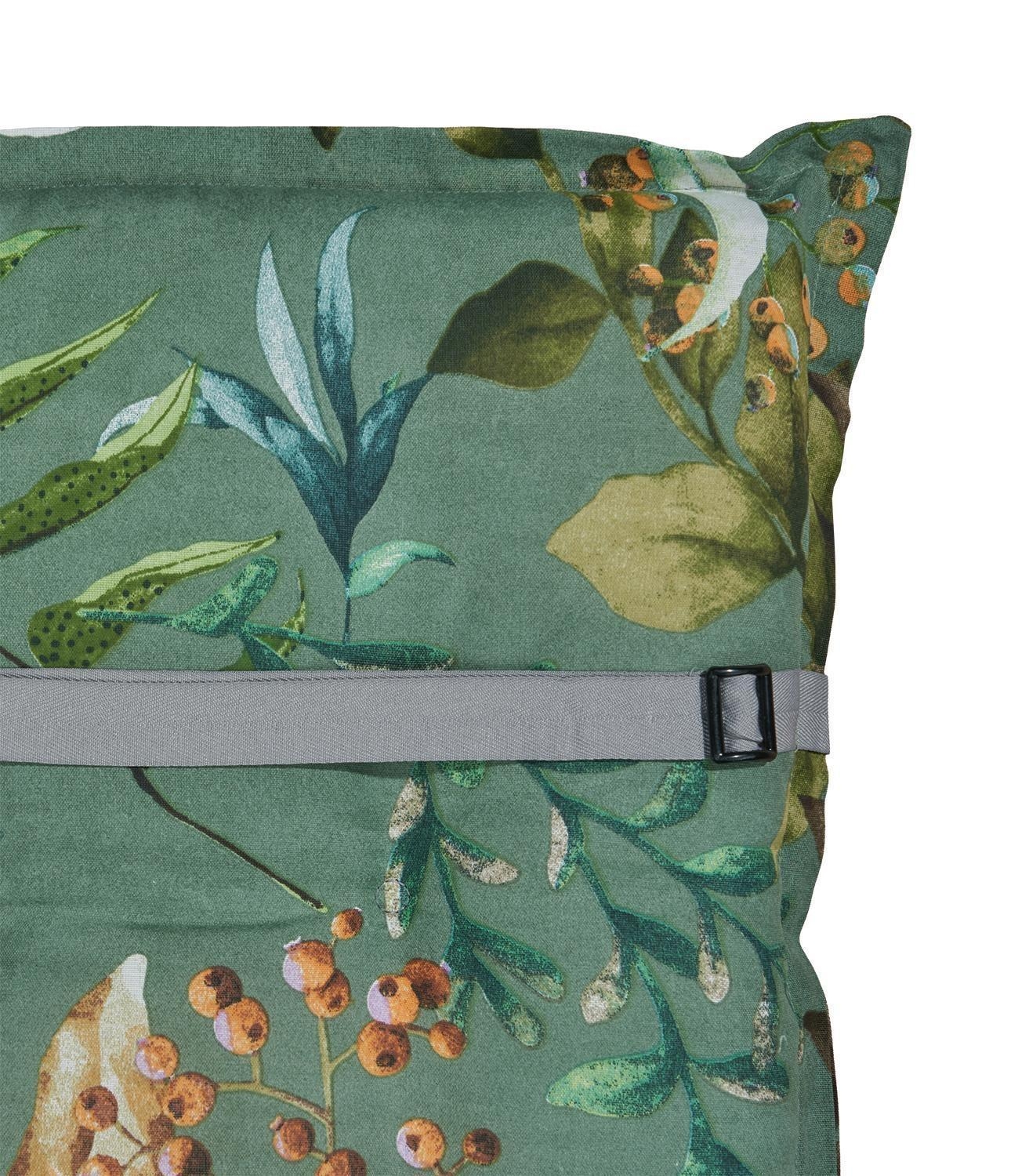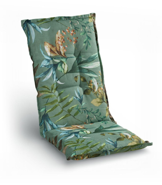 Die Gartenstuhlauflage DIMIRA von GO-DE überzeugt mit einem dekorativen Blütenmuster in Blau und Orange auf grünem Grund. Mit einer Größe von 48 x 7 x 118 cm ist sie ideal für Hochlehner geeignet. Das Material aus 65 % Polyester und 35 % Baumwolle sorgt für angenehmen Sitzkomfort. Seitliche Bindekordeln und ein verstellbares Gurtband bieten sicheren Halt. Der 2 cm Stehsaum rundet die Optik ab. Made in Germany, empfohlen wird Handwäsche.