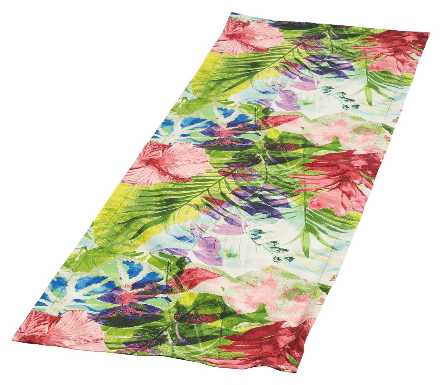 Der Tischläufer FRUTTANA in Grün mit einem bunten Blumenmuster ist eine dekorative Ergänzung für jeden Tisch. Er hat eine Länge von 140 cm und eine Breite von 40 cm. Der Läufer besteht aus einer Materialmischung von 65 % Polyester und 35 % Baumwolle, was ihn strapazierfähig und pflegeleicht macht. Er ist bei 30 °C waschbar und wird in Deutschland hergestellt.
