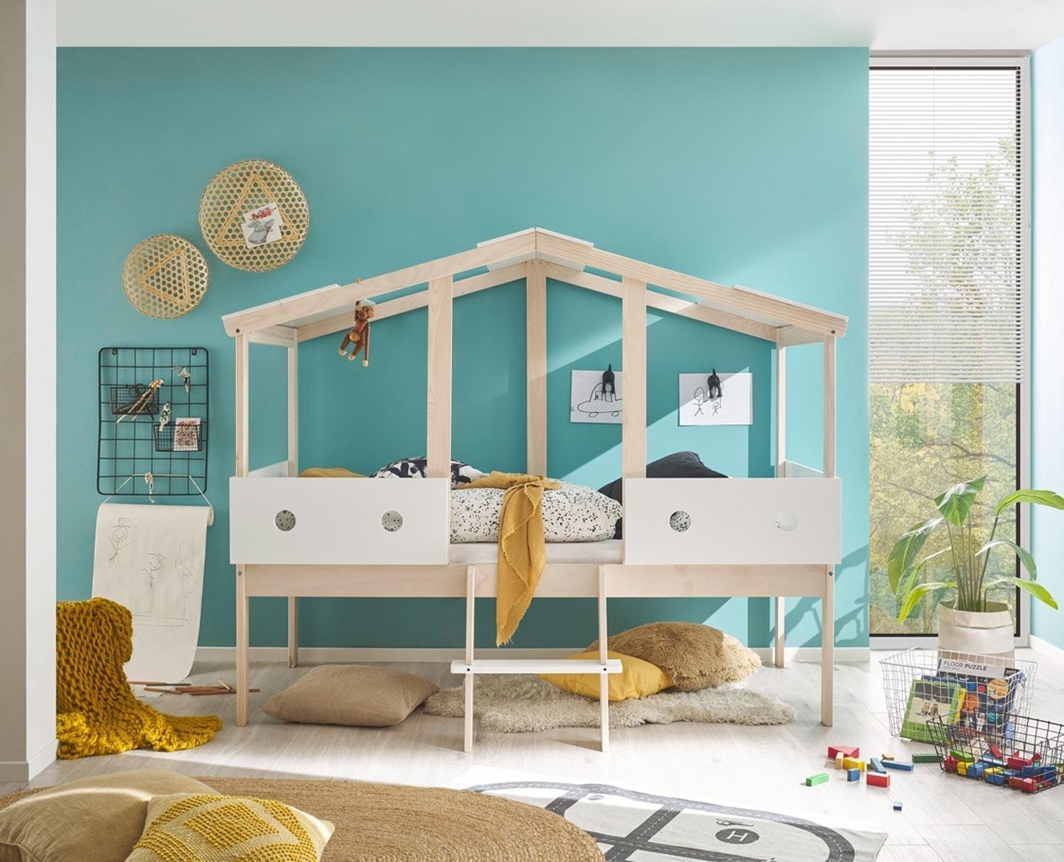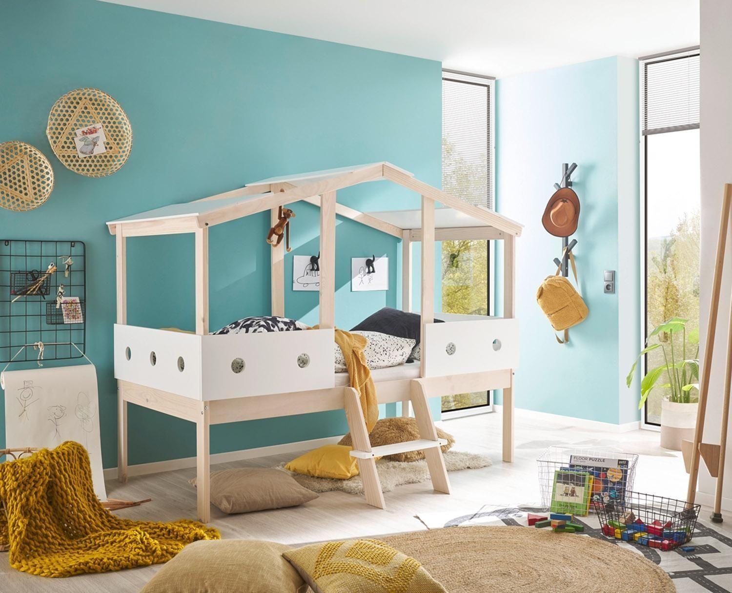 Das Hausbett CHAYA ist aus massivem Kiefernholz gefertigt und präsentiert sich in einem braunen Farbton. Es verfügt über eine fest integrierte Leiter sowie eine Überdachung. Die dekorativen Elemente bestehen aus weiß lackiertem MDF und setzen optische Akzente. Die Liegefläche beträgt 90 x 200 cm. Matratze und Lattenrost sind nicht im Lieferumfang enthalten. Die Außenmaße des Bettes betragen 131 cm in der Breite, 165 cm in der Höhe und 216 cm in der Tiefe. Das Kinderbett ist für Kinder ab 6 Jahren geeignet.